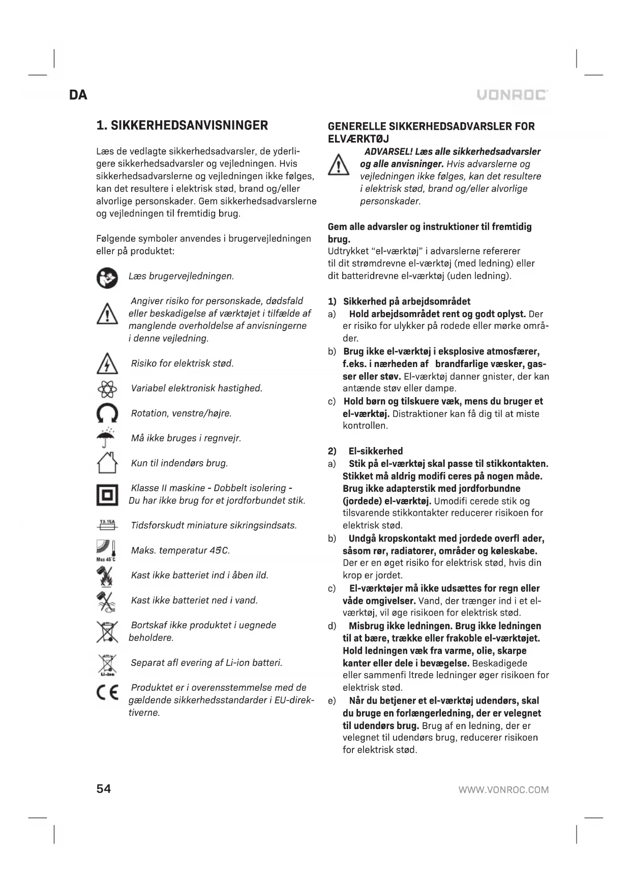 a) Åbn ikke batteriet. Fare for kortslutning. b) Beskyt batteriet mod varme, f.eks. mod kon- tinuerligt intenst sollys, brand, vand og fugt. Fare for eksplosion. c) Itilfælde af skade og forkert brug af batteriet, kan der blive udsendt dampe. Udluft området, og søg lægehjælp itilfælde af klager. Dampene kan irritere åndedrætssystemet. d) Brug kun batteriet sammen med dit Vonroc- produkt. Denne foranstaltning alene beskytter batteriet mod farlig overbelastning. e) Batteriet kan blive beskadiget af spidse gen- stande såsom søm eller skruetrækkere eller af eksternt påført kraft. Der kan opstå en intern kortslutning, og batteriet kan brænde, ryge, eksplodere eller bliver overophedet.