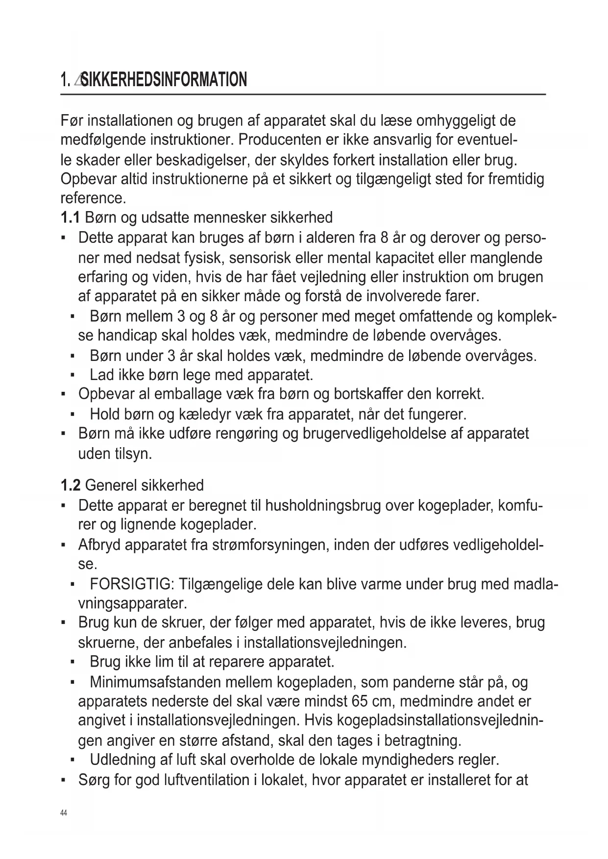- Sørg for god luftventilation i lokalet, hvor apparatet er installeret for at45 undgå tilbagestrømning af uønskede gasser ind i lokalet fra apparater, der brænder gas eller andre brændstoff er, herunder åbne brande.
