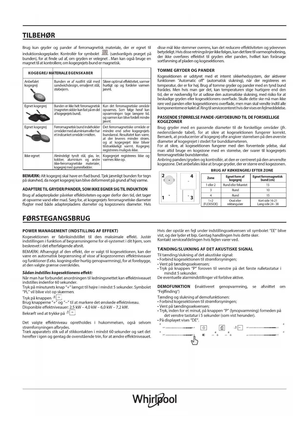 Kogesektionen indstiller automatisk en minimumseektniveau, for at sikre at kogezonen kan bruges. Effektregulatoren begrænser effektniveauet i overensstemmelse med den maksimale værdi, der er indstillet for kogesektionen. Se afsnittet ”Indstilling af eekt”. Ejerens instruktionsbog DAKUNDESERVICE Registrér venligst dit produkt på www.whirlpool.eu/register, for at modtage en mere komplet assistance. FØR SERVICEAFDELINGEN KONTAKTES: