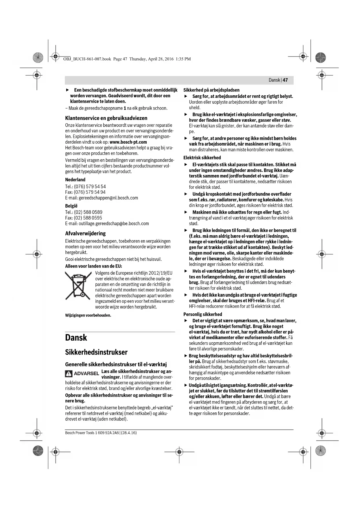 Vægt svarer til EPTA-Procedure 01:2014 kg 2,7 Beskyttelsesklasse /II Angivelserne gælder for en nominel spænding [U] på 230 V. Disse angi-velser kan variere ved afvigende spændinger og i landespecifikke udfø-relser. OBJ_BUCH-861-007.book Page 49 Thursday, April 28, 2016 1:35 PM50 | Dansk 1 609 92A 2A6 | (28.4.16) Bosch Power Tools Tandkransborepatron skiftes Arbejde med værktøj uden SDS-plus (f.eks. bor med cylin- drisk skaft) kræver, at der monteres en egnet borepatron (tandkrans- eller hurtigspændeborepatron, tilbehør). Tandkransborepatron monteres (se Fig. C) – Skru SDS-plus-holdeskaftet 15 ind i tandkransborepatro- nen 14. Sikre tandkransborepatronen 14 med sikrings- skruen 13. Vær opmærksom på, at sikringsskruen har et venstregevind. Tandkransborepatron sættes i (se Fig. C) – Rengør istikningsenden på holdeskaftet og smør et tyndt lag fedt på den. – Sæt tandkransborepatronen med holdeskaftet drejende ind i værktøjsholderen, til den fastlåses af sig selv. – Kontrollér at borepatronen sidder rigtigt ved at trække i tandkransborepatronen. Tandkransborepatron tages ud – Skub låsekappen 3 bagud og tag tandkransborepatronen 14 af. Værktøjsskift Støvbeskyttelseskappen 2 forhindrer i stort omfang, at bore- støv trænger ind i værktøjsholderen under brug. Når værktø- jet sættes i, skal man være opmærksom på, at støvbeskyttel- seskappen 2 ikke beskadiges. En beskadiget støvbeskyttelseskappe skal skiftes med det samme. Det anbefales, at få dette gjort af en servi- cetekniker. SDS-plus-indsatsværktøj sættes i (se Fig. D) SDS-plus-borepatronen bruges til at skifte indsatsværktøj nemt og hurtigt uden brug af ekstra værktøj. – Rengør istikningsenden på indsatsværktøjet og smør et tyndt lag fedt på den. – Sæt indsatsværktøjet drejende ind i værktøjsholderen, til det fastlåses af sig selv. – Kontrollér at værktøjet sidder rigtigt fast ved at trække i lå- sen. SDS-plus-indsatsværktøjet er systembetinget frit bevægeligt. Derved opstår en rundløbafvigelse i tomgang. Dette påvirker ikke borehullets nøjagtighed, da boret centrerer sig af sig selv under borearbejdet. SDS-plus-indsatsværktøj tages ud (se Fig. E) – Skub låsekappen 3 bagud og tag indsatsværktøjet ud. Indsatsværktøj uden SDS-plus sættes i Bemærk: Brug ikke værktøjer uden SDS-plus til hammerbo- ring eller mejsling! Værktøj uden SDS-plus og dets borepatron beskadiges under hammerboring og mejsling. – Sæt en tandkransborepatron 14 i (se „Tandkransborepa- tron skiftes“, side 50). – Åben tandkransborepatronen 14 ved at dreje på den, ind- til værktøjet kan sættes i. Sæt værktøjet i. – Stik borepatronnøglen i de pågældende boringer på tand- kransborepatronen 14 og spænd værktøjet jævnt. – Drej slag-/drejestop-kontakten 9 i position „Boring“. Indsatsværktøj uden SDS-plus tages ud – Drej kappen på tandkransborepatronen 14 til venstre vha. borepatronnøglen, til indsatsværktøjet kan tages ud. Støvopsugning med sugfix (tilbehør) Støv fra materialer som f.eks. blyholdig maling, nogle træ- sorter, mineraler og metal kan være sundhedsfarlige. Be- røring eller indånding af støv kan føre til allergiske reaktio- ner og/eller åndedrætssygdomme hos brugeren eller personer, der opholder sig i nærheden af arbejdspladsen. Bestemt støv som f.eks. ege- eller bøgestøv gælder som kræftfremkaldende, især i forbindelse med ekstra stoffer til træbehandling (chromat, træbeskyttelsesmiddel). As- bestholdigt materiale må kun bearbejdes af fagfolk. – Brug helst en støvopsugning, der egner sig til materia- let. – Sørg for god udluftning af arbejdspladsen. – Det anbefales at bære åndeværn med filterklasse P2. Overhold forskrifterne, der gælder i dit land vedr. de mate- rialer, der skal bearbejdes. Undgå at der samler sig støv på arbejdspladsen. Støv kan let antænde sig selv. Sugfix monteres (se Fig. F) Til støvopsugningen benyttes et sugfix (tilbehør). Under bore- arbejdet fjedrer sugfix tilbage, så sugfix-hovedet altid holdes tæt mod undergrunden. – Tryk på tasten til dybdeanslagsindstillingen 10 og tag dyb- deanslaget ud 11. Tryk på tasten 10 igen og sæt sugfix for- fra ind i ekstrahåndtaget 12. – Tilslut en opsugningsslange (diameter 19 mm, tilbehør) til opsugningsåbningen 16 på sugfix. Støvsugeren skal være egnet til det materiale, som skal opsu- ges. Anvend en specialstøvsuger til opsugning af særligt sund- hedsfarligt, kræftfremkaldende eller tørt støv. Boredybde indstilles på sugfix (se Fig. G) Den ønskede boredybde X kan også fastlægges, når sugfix er monteret. – Skub SDS-plus-indsatsværtøjet helt ind i værktøjsholde- ren SDS-plus 1. Ellers kan SDS-plus-værktøjets bevæge- lighed føre til en forkert indstilling af boredybden. – Løsne vingeskruen 20 på sugfix. – Anbring el-værktøjet fast det sted, der skal bores i, uden at tænde for værktøjet. SDS-plus-indsatsværktøjet skal be- finde sig på fladen. – Forskyd føringsrøret 21 på sugfix på en sådan måde, at sugfix-hovedet hviler på den flade, der skal bores i. Skub ikke føringsrøret 21 mere end nødvendigt hen over tele- skoprøret 19, så en så stor del af skalaen forbliver synlig på teleskoprøret 19. – Spænd vingeskruen 20 igen. Løsne klemmeskruen 17 på dybdeanslaget på sugfix. – Forskyd dybdeanslaget 18 på teleskoprøret 19 på en så- dan måde, at den afstand X, der vises på billedet, er i over- ensstemmelse med den ønskede boredybde. –Spænd klemmeskruen 17 i denne position. OBJ_BUCH-861-007.book Page 50 Thursday, April 28, 2016 1:35 PMDansk | 51 Bosch Power Tools 1 609 92A 2A6 | (28.4.16) Brug Ibrugtagning Kontrollér netspændingen! Strømkildens spænding skal stemme overens med angivelserne på el-værktø- jets typeskilt. El-værktøj til 230 V kan også tilsluttes 220 V. Indstil funktion Med slag-/drejestop-kontakten 9 vælges funktionen til el-værktøjet.