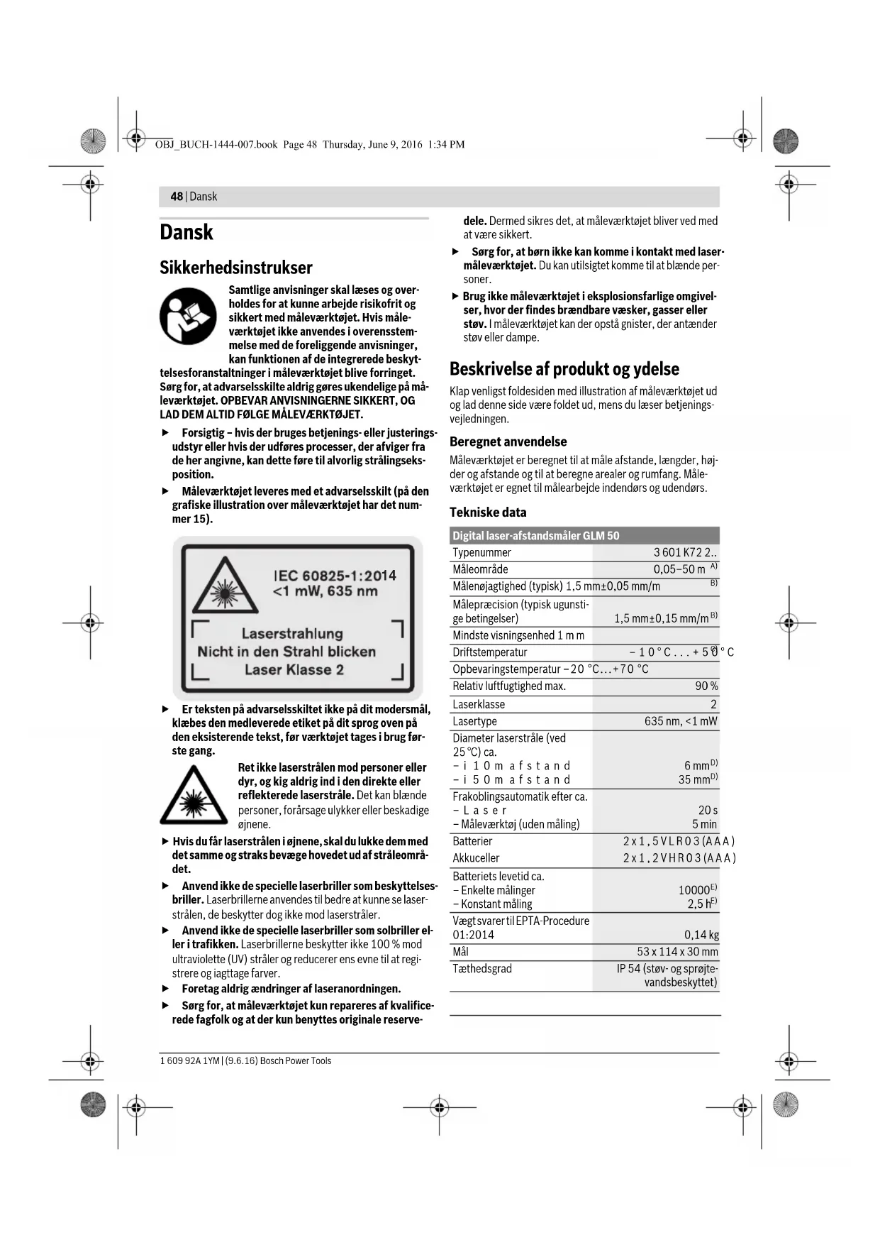 Uitgang laserstraal 11 of ont- vangstlens 12 is afgedekt. Houd de uitgang laser- straal 11 of ontvangst- lens 12 vrij Verkeerd referentieniveau inge- steld Kies een bij de meting passend referentieni- veau Obstakel in het verloop van de la- serstraal Laserpunt moet volledig op doeloppervlak liggen. De indicatie blijft ongewijzigd of het meetgereedschap reageert onverwacht op het indrukken van een toets Fout in de software Verwijder de batterijen en start het meetgereed- schap opnieuw nadat u de batterijen weer heeft geplaatst. OBJ_BUCH-1444-007.book Page 47 Thursday, June 9, 2016 1:34 PM48 | Dansk 1 609 92A 1YM | (9.6.16) Bosch Power Tools Dansk Sikkerhedsinstrukser Samtlige anvisninger skal læses og over- holdes for at kunne arbejde risikofrit og sikkert med måleværktøjet. Hvis måle- værktøjet ikke anvendes i overensstem- melse med de foreliggende anvisninger, kan funktionen af de integrerede beskyt- telsesforanstaltninger i måleværktøjet blive forringet. Sørg for, at advarselsskilte aldrig gøres ukendelige på må- leværktøjet. OPBEVAR ANVISNINGERNE SIKKERT, OG LAD DEM ALTID FØLGE MÅLEVÆRKTØJET. Forsigtig – hvis der bruges betjenings- eller justerings- udstyr eller hvis der udføres processer, der afviger fra de her angivne, kan dette føre til alvorlig strålingseks- position. Måleværktøjet leveres med et advarselsskilt (på den grafiske illustration over måleværktøjet har det num- mer 15). Er teksten på advarselsskiltet ikke på dit modersmål, klæbes den medleverede etiket på dit sprog oven på den eksisterende tekst, før værktøjet tages i brug før- ste gang. Ret ikke laserstrålen mod personer eller dyr, og kig aldrig ind i den direkte eller reflekterede laserstråle. Det kan blænde personer, forårsage ulykker eller beskadige øjnene. Hvis du får laserstrålen i øjnene, skal du lukke dem med det samme og straks bevæge hovedet ud af stråleområ- det. Anvend ikke de specielle laserbriller som beskyttelses- briller. Laserbrillerne anvendes til bedre at kunne se laser- strålen, de beskytter dog ikke mod laserstråler. Anvend ikke de specielle laserbriller som solbriller el- ler i trafikken. Laserbrillerne beskytter ikke 100 % mod ultraviolette (UV) stråler og reducerer ens evne til at regi- strere og iagttage farver. Foretag aldrig ændringer af laseranordningen. Sørg for, at måleværktøjet kun repareres af kvalifice- rede fagfolk og at der kun benyttes originale reserve- dele. Dermed sikres det, at måleværktøjet bliver ved med at være sikkert. Sørg for, at børn ikke kan komme i kontakt med laser- måleværktøjet. Du kan utilsigtet komme til at blænde per- soner. Brug ikke måleværktøjet i eksplosionsfarlige omgivel- ser, hvor der findes brændbare væsker, gasser eller støv. I måleværktøjet kan der opstå gnister, der antænder støv eller dampe. Beskrivelse af produkt og ydelse Klap venligst foldesiden med illustration af måleværktøjet ud og lad denne side være foldet ud, mens du læser betjenings- vejledningen. Beregnet anvendelse Måleværktøjet er beregnet til at måle afstande, længder, høj- der og afstande og til at beregne arealer og rumfang. Måle- værktøjet er egnet til målearbejde indendørs og udendørs. Tekniske data