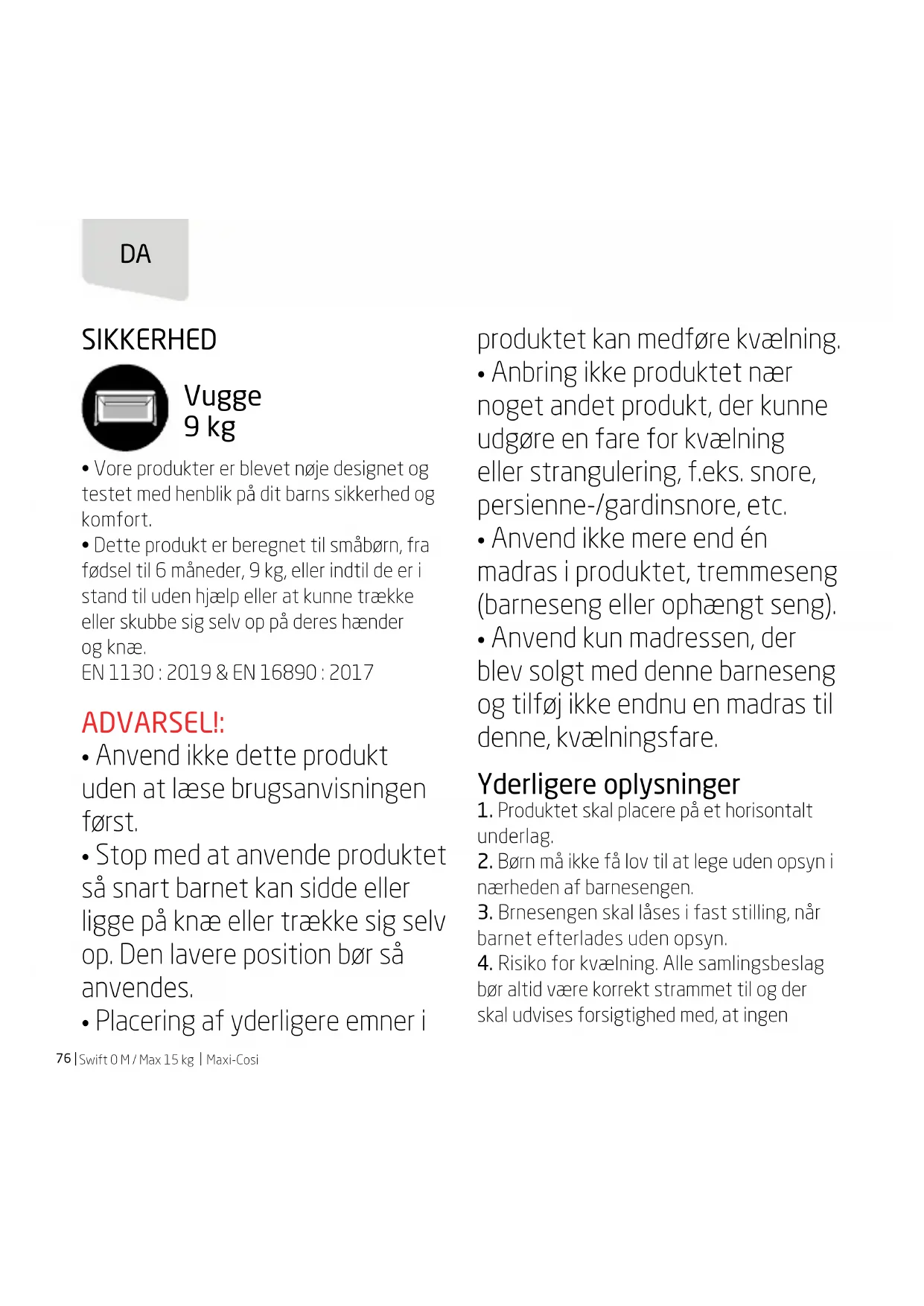 - Dette produkt er beregnet til småbørn, fra fødsel til 6 måneder, 9 kg, eller indtil de er i stand til uden hjælp eller at kunne trække eller skubbe sig selv op på deres hænder og knæ. EN 1130 : 2019 & EN 16890 : 2017 ADVARSEL!: