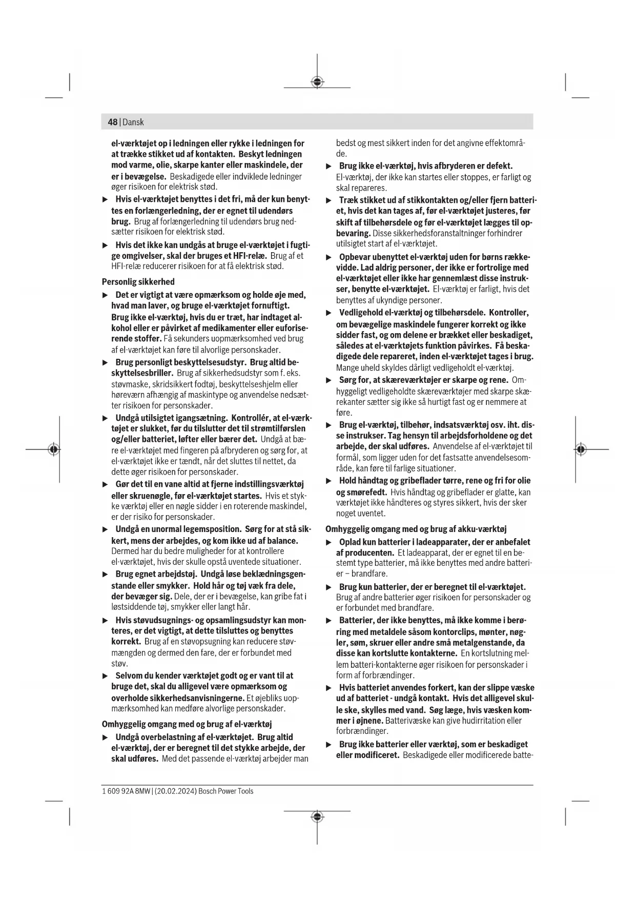 80, 120 Voor het opschuren van grondverfla- gen voor het lakken fijn 180 Voor het nabewerken of polijsten, in het bijzonder van me- taal en steen, gebruikt u een vlies of een polijstvilt. Afhankelijk van de gewenste oppervlaktekwaliteit van het werkstuk kunnen verschillende vliessoorten of polijstvilten gebruikt worden. Afzuiging van stof en spanen Stof van materialen zoals loodhoudende verf, enkele hout- soorten, mineralen en metaal kan schadelijk voor de gezond- heid zijn. Aanraking of inademing van stof kan leiden tot al- lergische reacties en/of luchtwegaandoeningen bij de ge- bruiker of personen die zich in de omgeving bevinden. Bepaalde soorten stof, bijvoorbeeld van eiken- en beuken- Bosch Power Tools 1 609 92A 8MW | (20.02.2024)46 | Nederlands hout, gelden als kankerverwekkend, in het bijzonder in com- binatie met additieven voor houtbehandeling (chromaat en houtbeschermingsmiddelen). Asbesthoudend materiaal mag alleen door gespecialiseerde vakmensen worden be- werkt. – Gebruik indien mogelijk een voor het materiaal geschikte stofafzuiging. – Zorg voor een goede ventilatie van de werkplek. – Er wordt geadviseerd om een stofmasker met filterklasse P2 te dragen. Neem de in uw land geldende voorschriften voor de te be- werken materialen in acht. u Vermijd ophoping van stof op de werkplek. Stof kan gemakkelijk ontbranden. Eigen afzuiging met stofbox (zie afbeeldingen E1–E4) Plaats de stofbox (1) op de uitblaasopening (15) tot deze vastklikt. Voor het leegmaken van de stofbox (1) trekt u de stofbox naar beneden toe eraf. Voor het openen van de stofbox (1) moet u met de stofbox op een stevig oppervlak tikken zoals op de afbeelding wordt weergegeven om het stof van het filterelement te verwijde- ren. Pak de stofbox (1) vast bij de greepuitsparing, klap het filter- element (16) naar boven toe weg en maak de stofbox leeg. Reinig de lamellen van het filterelement (16) met een zachte borstel. Externe afzuiging De stofzuiger moet geschikt zijn voor het te bewerken mate- riaal. Gebruik bij het afzuigen van voor de gezondheid bijzonder gevaarlijk, kankerverwekkend of droog stof een speciale zui- ger. Gebruik Ingebruikname In- en uitschakelen u Zorg ervoor dat u de aan/uit-schakelaar kunt bedienen zonder de handgreep los te laten. Voor het inschakelen van het elektrische gereedschap kan- telt u de aan/uit-schakelaar (8) naar rechts in positie „I“. Voor het uitschakelen van het elektrische gereedschap kan- telt u de aan/uit-schakelaar (8) naar links in positie „O“. Accu-oplaadaanduiding De drie groene LED's van de accu-oplaadaanduiding (10) ge- ven de laadtoestand van de accu (11) aan. Uit veiligheids- overwegingen is het opvragen van de laadtoestand alleen bij stilstaand elektrisch gereedschap mogelijk. Druk op de toets (9) voor aanduiding van de laadtoestand. Dit is ook mogelijk, wanneer de accu (11) weggenomen is. LED's Capaciteit Permanent licht 3× groen ≥66 % LED's Capaciteit Permanent licht 2× groen ≥33 % Permanent licht 1× groen <33% Knipperlicht 1× groen Reserve Als er na het drukken op de toets (9) geen LED brandt, dan is de accu defect en moet vervangen worden. Temperatuurafhankelijke beveiliging tegen overbelasting Bij beoogd gebruik kan het elektrische gereedschap niet overbelast worden. Bij een te sterke belasting of het over- schrijden van de toegestane accutemperatuur schakelt de elektronica het elektrische gereedschap uit tot dit zich weer in het optimale werktemperatuurbereik bevindt. Aanwijzingen voor werkzaamheden u Neem de accu vóór alle werkzaamheden aan het elek- trische gereedschap (bijv. onderhoud, wisselen van accessoires, enz.) uit het elektrische gereedschap. Bij per ongeluk bedienen van de aan/uit-schakelaar bestaat gevaar voor letsel. u Wacht tot het elektrische gereedschap tot stilstand is gekomen voordat u het neerlegt. De afnamecapaciteit bij het schuren wordt in hoofdzaak be- paald door de keuze van het schuurblad. Alleen onbeschadigde schuurbladen zorgen voor een goede schuurcapaciteit en ontzien het elektrische gereedschap. Let op een gelijkmatige aandrukkracht om de levensduur van de schuurbladen te verlengen. Een overmatige verhoging van de aandrukkracht leidt niet tot een groter schuurvermogen, maar wel tot een sterkere slijtage van het elektrische gereedschap en tot voortijdig uit- vallen van het schuurplateau. Gebruik een schuurblad waarmee metaal is bewerkt niet meer voor andere materialen. Gebruik uitsluitend originele Bosch-schuuraccessoires. Aanwijzingen voor de optimale omgang met de accu Bescherm de accu tegen vocht en water. Bewaar de accu alleen bij een temperatuur tussen –20 °C en 50 °C. Laat de accu bijvoorbeeld in de zomer niet in de auto liggen. Reinig de ventilatieopeningen van de accu af en toe met een zachte, schone en droge doek. Een duidelijk kortere gebruiksduur na het opladen duidt erop dat de accu versleten is en moet worden vervangen. Neem de aanwijzingen met betrekking tot afvalverwijdering in acht. Onderhoud en service Onderhoud en reiniging u Neem de accu vóór alle werkzaamheden aan het elek- trische gereedschap (bijv. onderhoud, wisselen van accessoires, enz.) uit het elektrische gereedschap. Bij 1 609 92A 8MW | (20.02.2024) Bosch Power ToolsDansk | 47 per ongeluk bedienen van de aan/uit-schakelaar bestaat gevaar voor letsel. u Houd het elektrische gereedschap en de ventilatie- openingen altijd schoon om goed en veilig te werken. Klantenservice en gebruiksadvies Onze klantenservice beantwoordt uw vragen over reparatie en onderhoud van uw product en over vervangingsonderde- len. Explosietekeningen en informatie over vervangingson- derdelen vindt u ook op: www.bosch-pt.com Het Bosch-gebruiksadviesteam helpt u graag bij vragen over onze producten en accessoires. Vermeld bij vragen en bestellingen van vervangingsonderde- len altijd het uit tien cijfers bestaande productnummer vol- gens het typeplaatje van het product. Nederland Tel.: (076) 579 54 54 Fax: (076) 579 54 94 E-mail: gereedschappen@nl.bosch.co