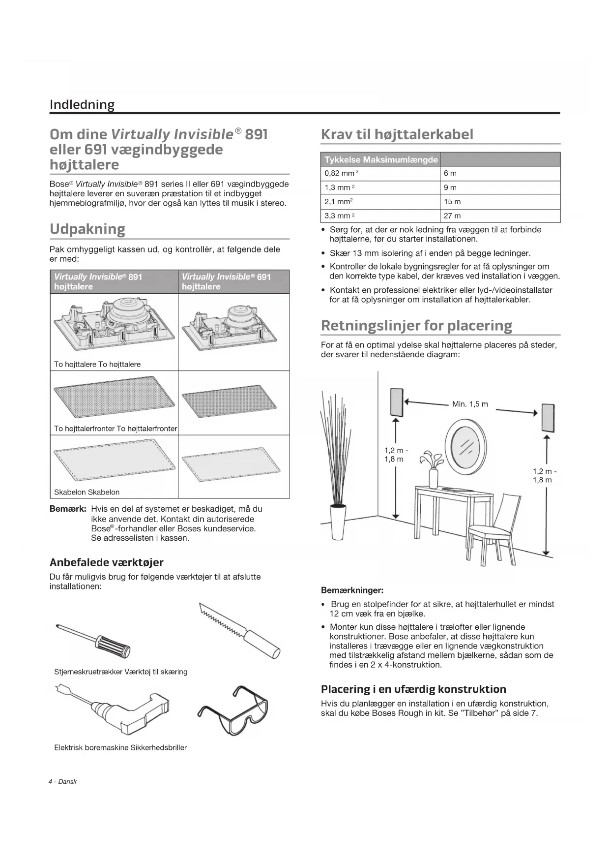 -forhandler eller Boses kundeservice. Se adresselisten i kassen. Anbefalede værktøjer Du får muligvis brug for følgende værktøjer til at afslutte installationen: Stjerneskruetrækker Værktøj til skæringElektrisk boremaskine Sikkerhedsbriller Krav til højttalerkabel Tykkelse Maksimumlængde 0,82 mm