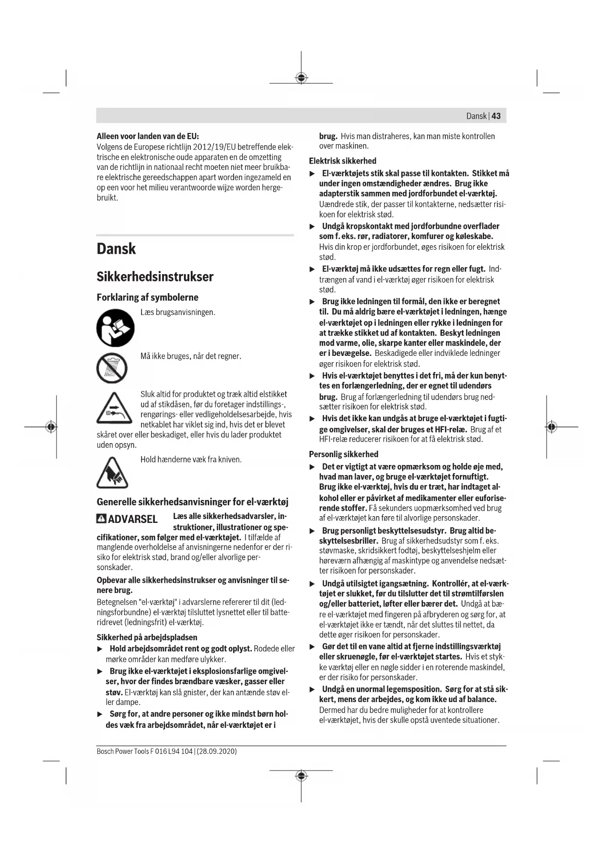 – Maks. længde 30m til forlængerledninger eller 60m til kabeltromler med HFI-relæ (FI) Bemærk: Hvis der benyttes en forlængerledning, skal denne - som beskrevet under sikkerhedsforskrifterne - være forsy- net med en jordledning, der skal være forbundet med jord- ledningen til det elektriske anlæg via stikket. FORSIGTIG: Ikke forskriftsmæssige forlæn- gerledninger kan være farlige. Forlænger- ledning, stik og kobling skal være vandtæt- te og de skal være godkendt til udendørs brug. Symboler De efterfølgende symboler er af betydning for at kunne læse og forstå betjeningsvejledningen. Læg mærke til symbolerne og overhold deres betydning. En rigtig forståelse af symbo- lerne er med til at sikre en god og sikker brug af produktet. Symbol Betydning Brug beskyttelseshandsker Bosch Power Tools F 016 L94 104 | (28.09.2020)46 | Dansk Symbol Betydning Brug beskyttelsesbriller Bevægelsesretning Reaktionsretning Vægt Tænding Slukning CLICK! Hørbar støj Forbudt handling Tilbehør/reservedele Beskrivelse af produkt og ydelse Læs alle sikkerhedsinstrukser og instruk- ser. I tilfælde af manglende overholdelse af sikkerhedsinstrukserne og instrukserne er der risiko for elektrisk stød, brand og/eller alvorli- ge kvæstelser. Vær opmærksom på billederne bag i brugsanvisningen. Beregnet anvendelse Haveredskabet er beregnet til at klippe og studse hække og buske i almindelige haver og kolonihaver. Illustrerede komponenter (se Fig. A og B) Nummereringen af de illustrerede komponenter refererer til illustrationen af produktet på de illustrerede sider. (1) Håndgreb (isoleret gribeflade) (2) Start-stop-kontakt (3) Kontaktspærre til start-stop-kontakt (4) Håndbeskyttelse (5) Sværd (6) Beskyttelseskappe (7) Elstik