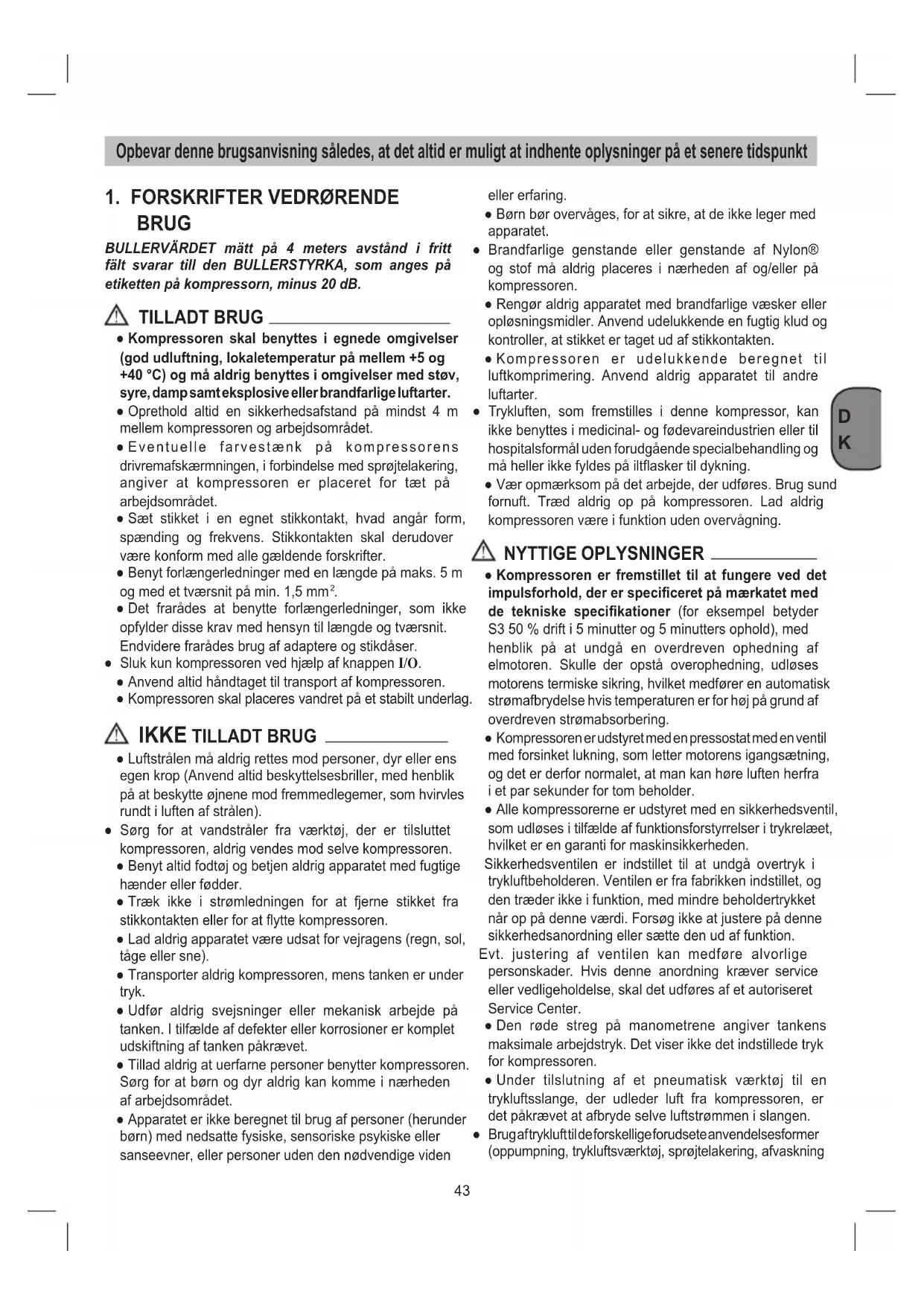 BRUG BULLERVÄRDET mätt på 4 meters avstånd i fritt fält svarar till den BULLERSTYRKA, som anges på etiketten på kompressorn, minus 20 dB. TILLADT BRUG ● Kompressoren skal benyttes i egnede omgivelser (god udluftning, lokaletemperatur på mellem +5 og +40 °C) og må aldrig benyttes i omgivelser med støv, syre, damp samt eksplosive eller brandfarlige luftarter. ● Oprethold altid en sikkerhedsafstand på mindst 4 m mellem kompressoren og arbejdsområdet. ● Eventuelle farvestænk på kompressorens drivremafskærmningen, i forbindelse med sprøjtelakering, angiver at kompressoren er placeret for tæt på arbejdsområdet. ● Sæt stikket i en egnet stikkontakt, hvad angår form, spænding og frekvens. Stikkontakten skal derudover være konform med alle gældende forskrifter. ● Benyt forlængerledninger med en længde på maks. 5 m og med et tværsnit på min. 1,5 mm