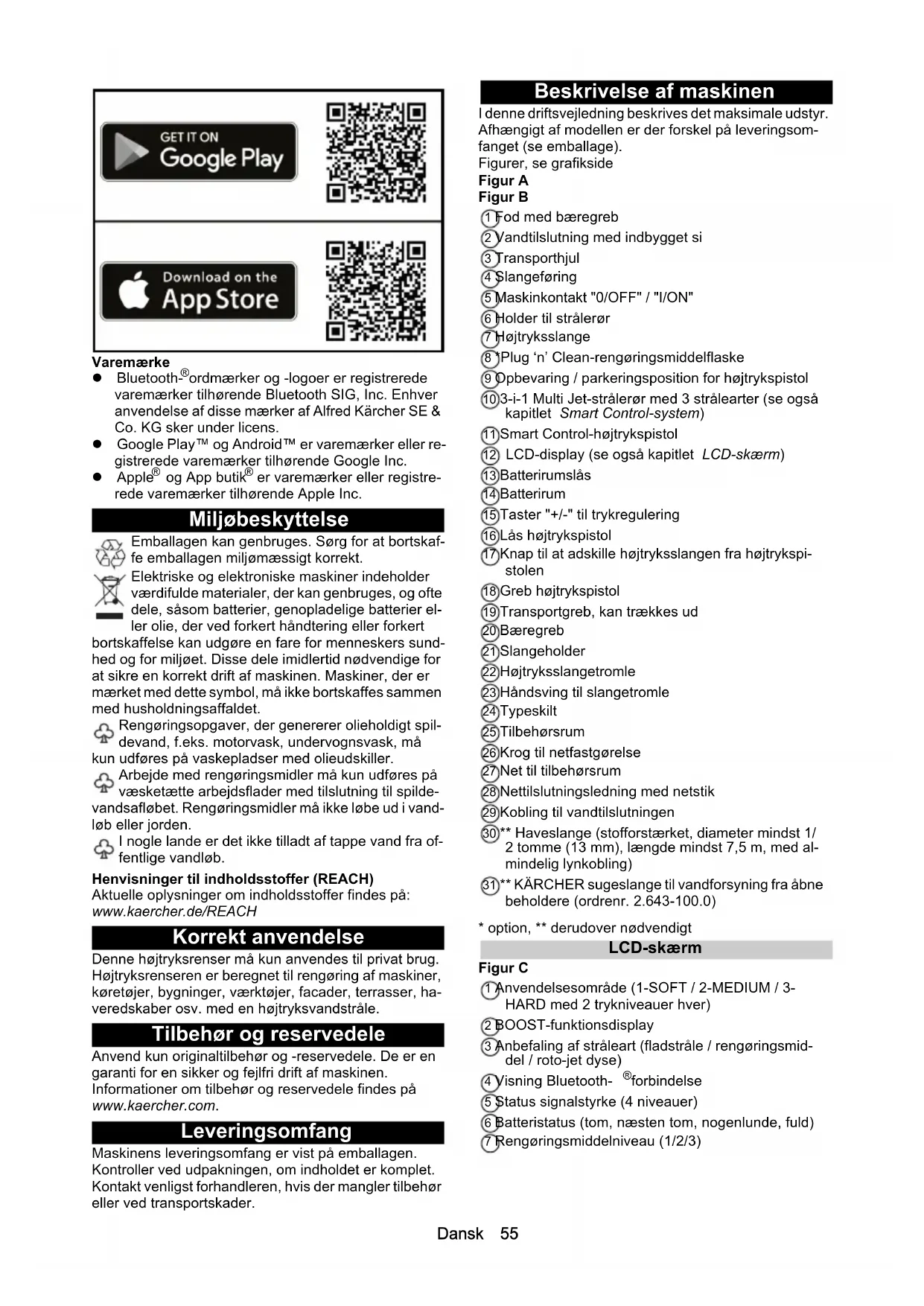 er varemærker eller registre- rede varemærker tilhørende Apple Inc. Miljøbeskyttelse Emballagen kan genbruges. Sørg for at bortskaf- fe emballagen miljømæssigt korrekt. Elektriske og elektroniske maskiner indeholder værdifulde materialer, der kan genbruges, og ofte dele, såsom batterier, genopladelige batterier el- ler olie, der ved forkert håndtering eller forkert bortskaffelse kan udgøre en fare for menneskers sund- hed og for miljøet. Disse dele imidlertid nødvendige for at sikre en korrekt drift af maskinen. Maskiner, der er mærket med dette symbol, må ikke bortskaffes sammen med husholdningsaffaldet. Rengøringsopgaver, der genererer olieholdigt spil- devand, f.eks. motorvask, undervognsvask, må kun udføres på vaskepladser med olieudskiller. Arbejde med rengøringsmidler må kun udføres på væsketætte arbejdsflader med tilslutning til spilde- vandsafløbet. Rengøringsmidler må ikke løbe ud i vand- løb eller jorden. I nogle lande er det ikke tilladt af tappe vand fra of- fentlige vandløb. Henvisninger til indholdsstoffer (REACH) Aktuelle oplysninger om indholdsstoffer findes på: www.kaercher.de/REACH Korrekt anvendelse Denne højtryksrenser må kun anvendes til privat brug. Højtryksrenseren er beregnet til rengøring af maskiner, køretøjer, bygninger, værktøjer, facader, terrasser, ha- veredskaber osv. med en højtryksvandstråle. Tilbehør og reservedele Anvend kun originaltilbehør og -reservedele. De er en garanti for en sikker og fejlfri drift af maskinen. Informationer om tilbehør og reservedele findes på www.kaercher.com. Leveringsomfang Maskinens leveringsomfang er vist på emballagen. Kontroller ved udpakningen, om indholdet er komplet. Kontakt venligst forhandleren, hvis der mangler tilbehør eller ved transportskader. Beskrivelse af maskinen I denne driftsvejledning beskrives det maksimale udstyr. Afhængigt af modellen er der forskel på leveringsom- fanget (se emballage). Figurer, se grafikside Figur A Figur B 1 Fod med bæregreb 2 Vandtilslutning med indbygget si 3 Transporthjul 4 Slangeføring 5 Maskinkontakt "0/OFF" / "I/ON" 6 Holder til strålerør 7 Højtryksslange 8 *Plug ‘n’ Clean-rengøringsmiddelflaske 9 Opbevaring / parkeringsposition for højtrykspistol 10 3-i-1 Multi Jet-strålerør med 3 strålearter (se også kapitlet Smart Control-system) 11 Smart Control-højtrykspistol 12 LCD-display (se også kapitlet LCD-skærm) 13 Batterirumslås 14 Batterirum 15 Taster "+/-" til trykregulering 16 Lås højtrykspistol 17 Knap til at adskille højtryksslangen fra højtrykspi- stolen 18 Greb højtrykspistol 19 Transportgreb, kan trækkes ud 20 Bæregreb 21 Slangeholder 22 Højtryksslangetromle 23 Håndsving til slangetromle 24 Typeskilt 25 Tilbehørsrum 26 Krog til netfastgørelse 27 Net til tilbehørsrum 28 Nettilslutningsledning med netstik 29 Kobling til vandtilslutningen 30 ** Haveslange (stofforstærket, diameter mindst 1/ 2 tomme (13 mm), længde mindst 7,5 m, med al- mindelig lynkobling) 31 ** KÄRCHER sugeslange til vandforsyning fra åbne beholdere (ordrenr. 2.643-100.0)