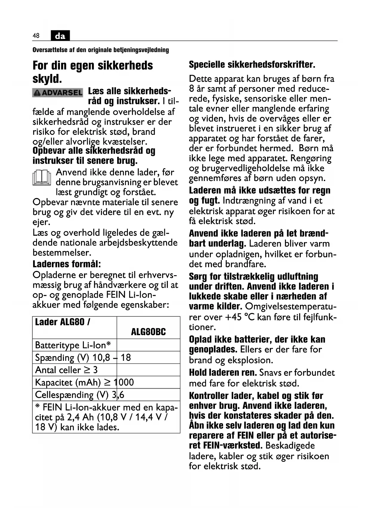Oversættelse af den originale betjeningsvejledning For din egen sikkerheds skyld. Læs alle sikkerheds- råd og instrukser. I til- fælde af manglende overholdelse af sikkerhedsråd og instrukser er der risiko for elektrisk stød, brand og/eller alvorlige kvæstelser. Opbevar alle sikkerhedsråd og instrukser til senere brug. Anvend ikke denne lader, før denne brugsanvisning er blevet læst grundigt og forstået. Opbevar nævnte materiale til senere brug og giv det videre til en evt. ny ejer. Læs og overhold ligeledes de gæl- dende nationale arbejdsbeskyttende bestemmelser. Ladernes formål: Opladerne er beregnet til erhvervs- mæssig brug af håndværkere og til at op- og genoplade FEIN Li-Ion- akkuer med følgende egenskaber: Specielle sikkerhedsforskrifter. Dette apparat kan bruges af børn fra 8 år samt af personer med reduce- rede, fysiske, sensoriske eller men- tale evner eller manglende erfaring og viden, hvis de overvåges eller er blevet instrueret i en sikker brug af apparatet og har forstået de farer, der er forbundet hermed. Børn må ikke lege med apparatet. Rengøring og brugervedligeholdelse må ikke gennemføres af børn uden opsyn. Laderen må ikke udsættes for regn og fugt. Indtrængning af vand i et elektrisk apparat øger risikoen for at få elektrisk stød. Anvend ikke laderen på let brænd- bart underlag. Laderen bliver varm under opladnigen, hvilket er forbun- det med brandfare. Sørg for tilstrækkelig udluftning under driften. Anvend ikke laderen i lukkede skabe eller i nærheden af varme kilder. Omgivelsestemperatu- rer over +45 °C kan føre til fejlfunk- tioner. Oplad ikke batterier, der ikke kan genoplades. Ellers er der fare for brand og eksplosion. Hold laderen ren. Snavs er forbundet med fare for elektrisk stød. Kontroller lader, kabel og stik før enhver brug. Anvend ikke laderen, hvis der konstateres skader på den. Åbn ikke selv laderen og lad den kun reparere af FEIN eller på et autorise- ret FEIN-værksted. Beskadigede ladere, kabler og stik øger risikoen for elektrisk stød. Lader ALG80 / ALG80BC Batteritype Li-Ion* Spænding (V) 10,8 – 18 Antal celler ≥ 3 Kapacitet (mAh) ≥ 1000 Cellespænding (V) 3,6