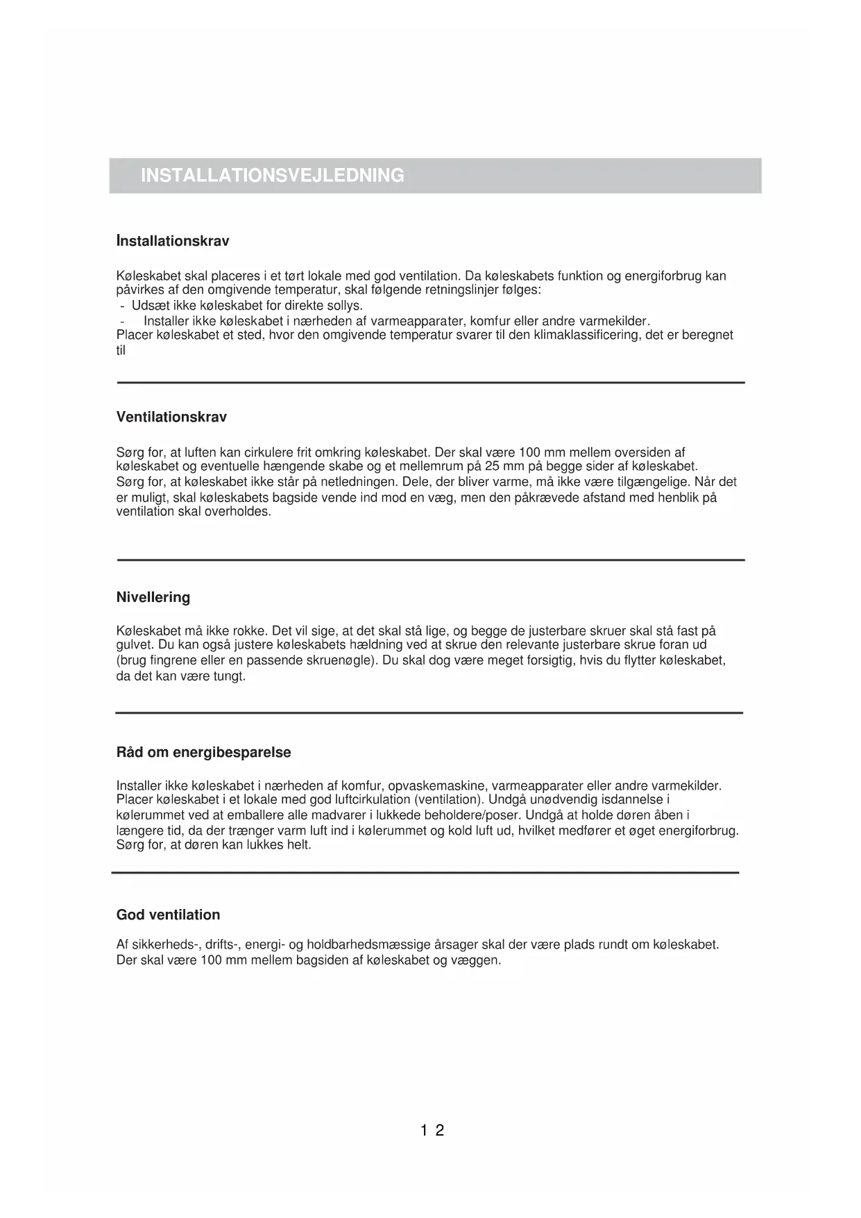 Installer ikke køleskabet i nærheden af komfur, opvaskemaskine, varmeapparater eller andre varmekilder. Placer køleskabet i et lokale med god luftcirkulation (ventilation). Undgå unødvendig isdannelse i kølerummet ved at emballere alle madvarer i lukkede beholdere/poser. Undgå at holde døren åben i længere tid, da der trænger varm luft ind i kølerummet og kold luft ud, hvilket medfører et øget energiforbrug. Sørg for, at døren kan lukkes helt.