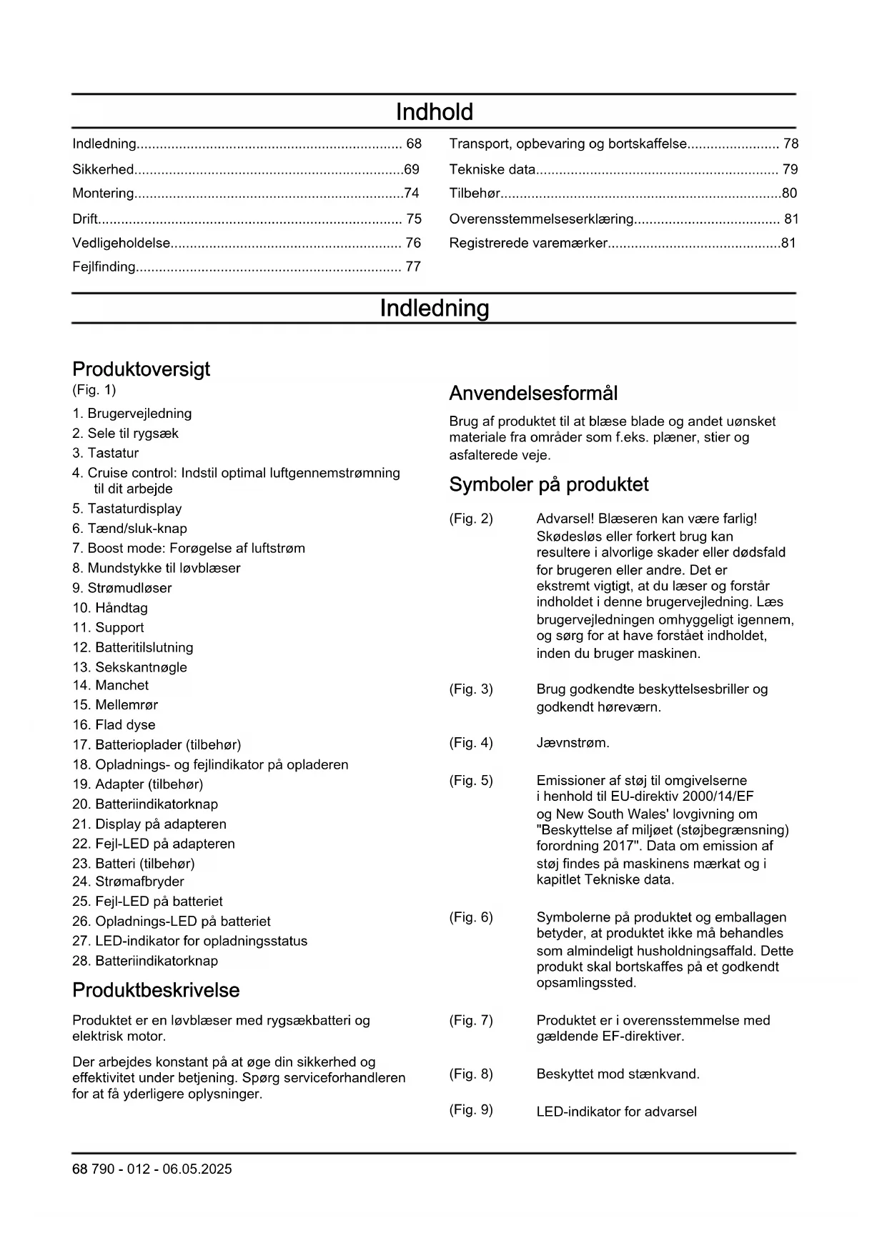 Produktbeskrivelse Produktet er en løvblæser med rygsækbatteri og elektrisk motor. Der arbejdes konstant på at øge din sikkerhed og effektivitet under betjening. Spørg serviceforhandleren for at få yderligere oplysninger. Anvendelsesformål Brug af produktet til at blæse blade og andet uønsket materiale fra områder som f.eks. plæner, stier og asfalterede veje. Symboler på produktet (Fig. 2) Advarsel! Blæseren kan være farlig! Skødesløs eller forkert brug kan resultere i alvorlige skader eller dødsfald for brugeren eller andre. Det er ekstremt vigtigt, at du læser og forstår indholdet i denne brugervejledning. Læs brugervejledningen omhyggeligt igennem, og sørg for at have forstået indholdet, inden du bruger maskinen. (Fig. 3) Brug godkendte beskyttelsesbriller og godkendt høreværn. (Fig. 4) Jævnstrøm. (Fig. 5) Emissioner af støj til omgivelserne i henhold til EU-direktiv 2000/14/EF og New South Wales' lovgivning om "Beskyttelse af miljøet (støjbegrænsning) forordning 2017". Data om emission af støj findes på maskinens mærkat og i kapitlet Tekniske data. (Fig. 6) Symbolerne på produktet og emballagen betyder, at produktet ikke må behandles som almindeligt husholdningsaffald. Dette produkt skal bortskaffes på et godkendt opsamlingssted. (Fig. 7) Produktet er i overensstemmelse med gældende EF-direktiver. (Fig. 8) Beskyttet mod stænkvand. (Fig. 9) LED-indikator for advarsel 68 790 - 012 - 06.05.2025(Fig. 10) Tænd/sluk-knap (Fig. 11) Boost mode-knap (Fig. 12) Cruise control-knap (Fig. 13) Hvis produktet har Bluetooth