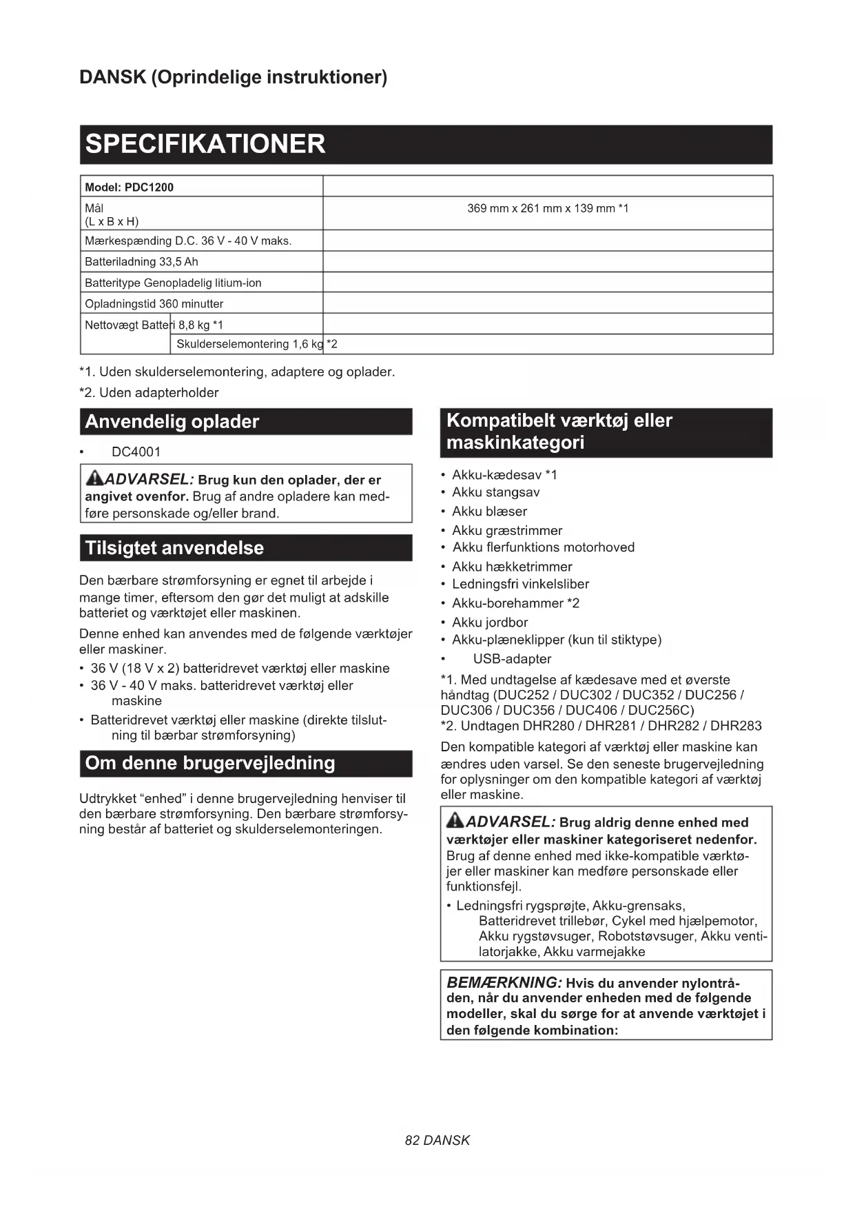- DC4001 ADVARSEL: Brug kun den oplader, der er angivet ovenfor. Brug af andre opladere kan med- føre personskade og/eller brand. Tilsigtet anvendelse Den bærbare strømforsyning er egnet til arbejde i mange timer, eftersom den gør det muligt at adskille batteriet og værktøjet eller maskinen. Denne enhed kan anvendes med de følgende værktøjer eller maskiner.