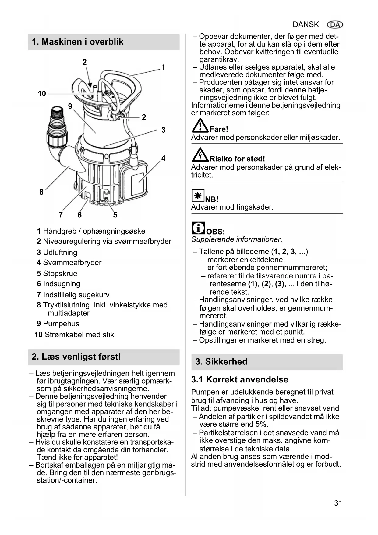 I_0009da4A.fm 5.7.10 Original brugsvejledning32 DANSK Typiske anvendelsesområder – Oppumpning fra beholdere, vandbassiner, svømmebassiner, drænbrønde eller over- svømmede rum. – Vanding af haver og græsplæner Ukorrekt anvendelse Apparatet er ikke beregnet til – pumpning af væske med en temperatur >35°C. – drikkevandsforsyning eller pumpning af levnedsmidler. – pumpning af saltvand. – pumpning af eksplosive, brændbare, ag- gressive eller sundhedsfarlige stoffer samt fækalier. – erhvervsmæssig eller industriel brug. – konstant cirkulation (dam). Pumpen må ikke benyttes af personer (inklu- sive børn og unge) – med fysisk og/eller psykisk handicap, – med nedsatte sanser, – med utilstrækkelig erfaring og/eller kend- skab til omgangen med pumpen, eller – som ikke har læst og forstået betjenings- vejledningen. Producenten påtager sig intet ansvar for skader, som opstår som følge af ukorrekt an- vendelse. Ved anvendelse i modstrid med anvendel- sesformålet, ved ændringer på apparatet el- ler ved brug af dele, som ikke er testet eller godkendt af producenten, kan der opstå al- vorlige skader!