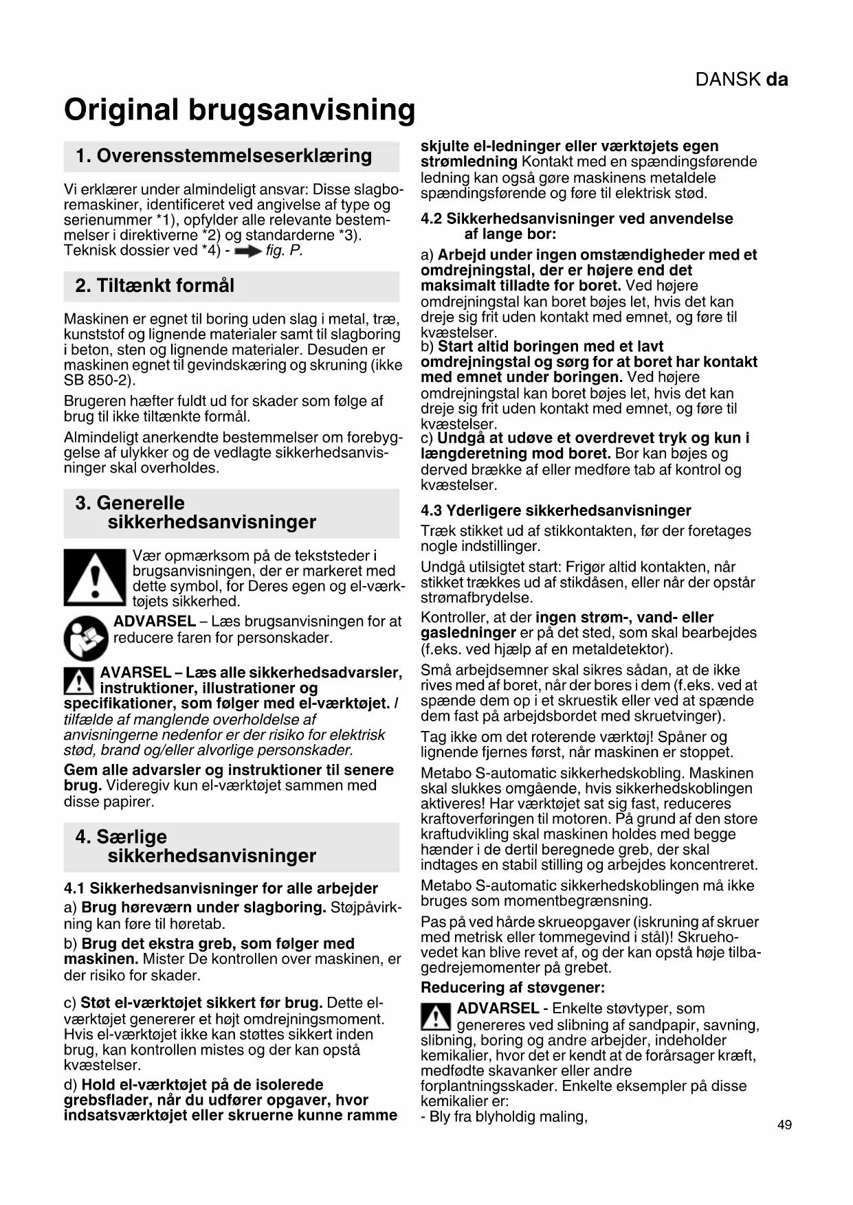 ig. P. Maskinen er egnet til boring uden slag i metal, træ, kunststof og lignende materialer samt til slagboring i beton, sten og lignende materialer. Desuden er maskinen egnet til gevindskæring og skruning (ikke SB 850-2). Brugeren hæfter fuldt ud for skader som følge af brug til ikke tiltænkte formål. Almindeligt anerkendte bestemmelser om forebyg- gelse af ulykker og de vedlagte sikkerhedsanvis- ninger skal overholdes. Vær opmærksom på de tekststeder i brugsanvisningen, der er markeret med dette symbol, for Deres egen og el-værk- tøjets sikkerhed. ADVARSEL – Læs brugsanvisningen for at reducere faren for personskader. AVARSEL – Læs alle sikkerhedsadvarsler, instruktioner, illustrationer og specifikationer, som følger med el-værktøjet. I tilfælde af manglende overholdelse af anvisningerne nedenfor er der risiko for elektrisk stød, brand og/eller alvorlige personskader. Gem alle advarsler og instruktioner til senere brug. Videregiv kun el-værktøjet sammen med disse papirer.