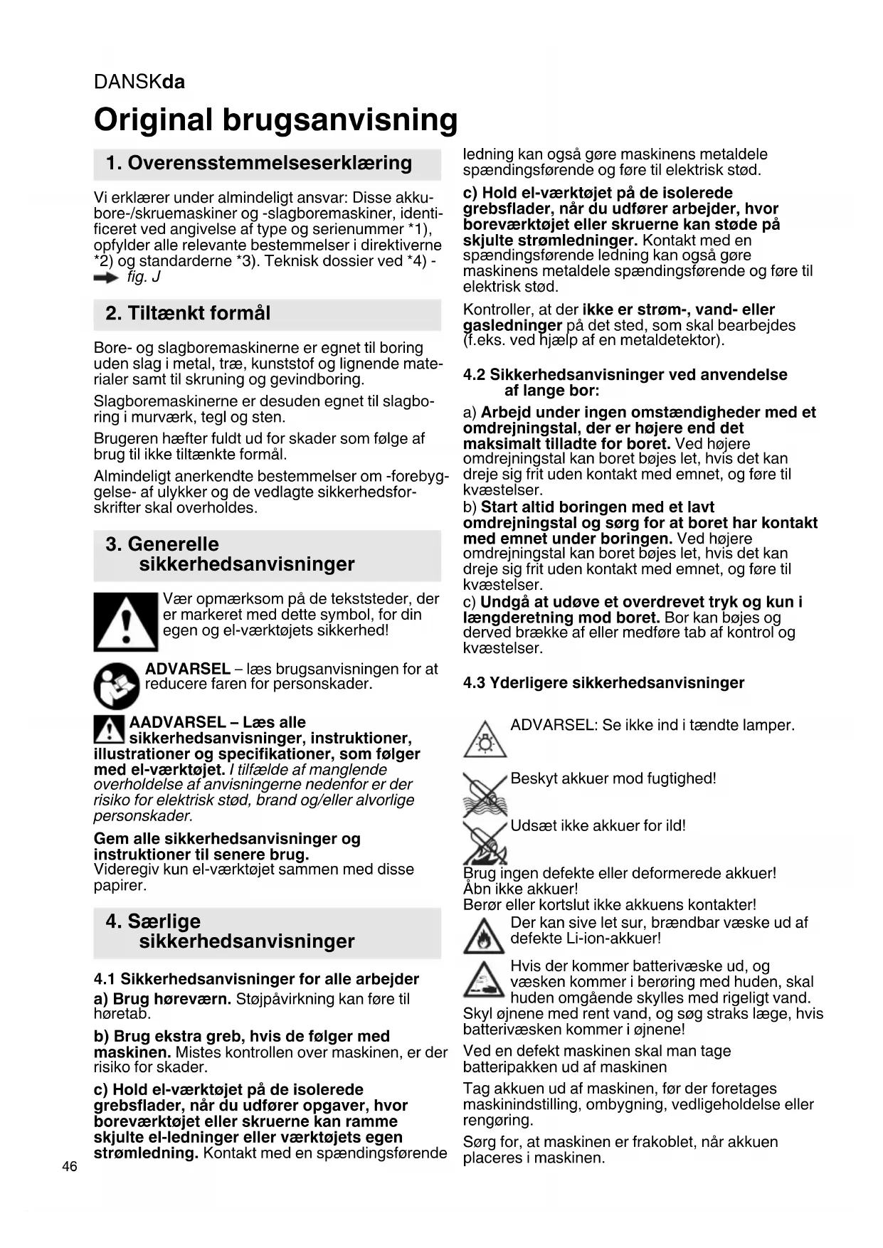 Vi erklærer under almindeligt ansvar: Disse akku- bore-/skruemaskiner og -slagboremaskiner, identi- ficeret ved angivelse af type og serienummer *1), opfylder alle relevante bestemmelser i direktiverne *2) og standarderne *3). Teknisk dossier ved *4) - fig. J Bore- og slagboremaskinerne er egnet til boring uden slag i metal, træ, kunststof og lignende mate- rialer samt til skruning og gevindboring. Slagboremaskinerne er desuden egnet til slagbo- ring i murværk, tegl og sten. Brugeren hæfter fuldt ud for skader som følge af brug til ikke tiltænkte formål. Almindeligt anerkendte bestemmelser om -forebyg- gelse- af ulykker og de vedlagte sikkerhedsfor- skrifter skal overholdes. Vær opmærksom på de tekststeder, der er markeret med dette symbol, for din egen og el-værktøjets sikkerhed! ADVARSEL – læs brugsanvisningen for at reducere faren for personskader. AADVARSEL – Læs alle sikkerhedsanvisninger, instruktioner, illustrationer og specifikationer, som følger med el-værktøjet. I tilfælde af manglende overholdelse af anvisningerne nedenfor er der risiko for elektrisk stød, brand og/eller alvorlige personskader. Gem alle sikkerhedsanvisninger og instruktioner til senere brug. Videregiv kun el-værktøjet sammen med disse papirer.