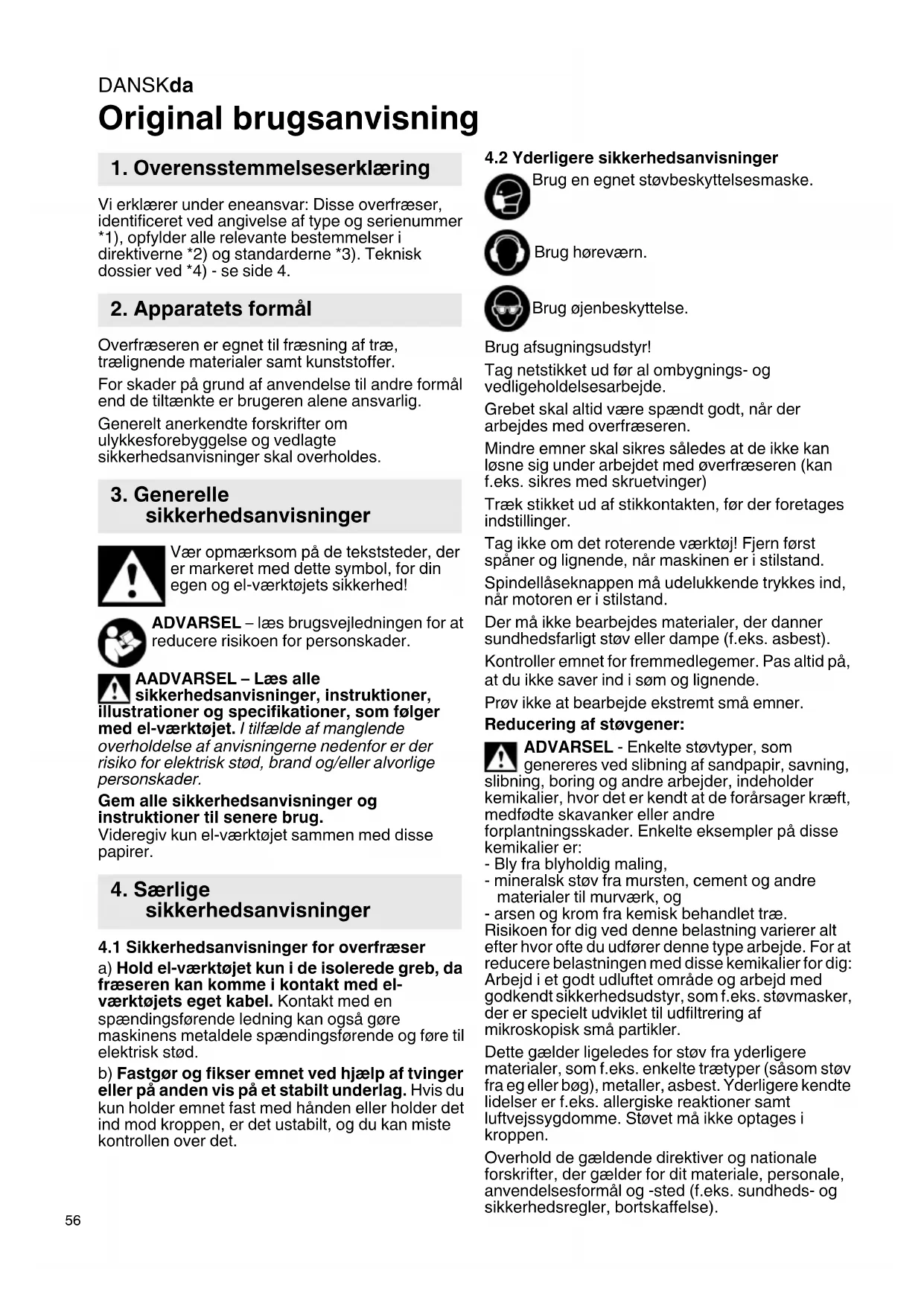 Original brugsanvisning Vi erklærer under eneansvar: Disse overfræser, identificeret ved angivelse af type og serienummer *1), opfylder alle relevante bestemmelser i direktiverne *2) og standarderne *3). Teknisk dossier ved *4) - se side 4. Overfræseren er egnet til fræsning af træ, trælignende materialer samt kunststoffer. For skader på grund af anvendelse til andre formål end de tiltænkte er brugeren alene ansvarlig. Generelt anerkendte forskrifter om ulykkesforebyggelse og vedlagte sikkerhedsanvisninger skal overholdes. Vær opmærksom på de tekststeder, der er markeret med dette symbol, for din egen og el-værktøjets sikkerhed! ADVARSEL – læs brugsvejledningen for at reducere risikoen for personskader. AADVARSEL – Læs alle sikkerhedsanvisninger, instruktioner, illustrationer og specifikationer, som følger med el-værktøjet. I tilfælde af manglende overholdelse af anvisningerne nedenfor er der risiko for elektrisk stød, brand og/eller alvorlige personskader. Gem alle sikkerhedsanvisninger og instruktioner til senere brug. Videregiv kun el-værktøjet sammen med disse papirer.