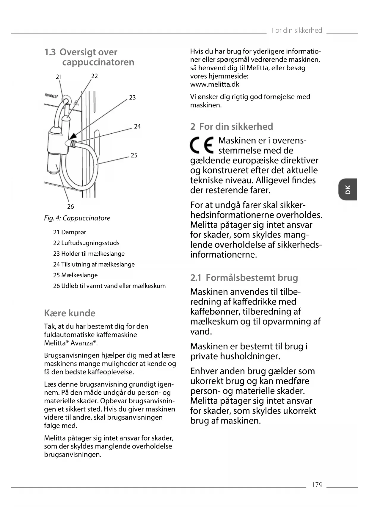Fig. 4: Cappuccinatore 21 Damprør 22 Luftudsugningsstuds 23 Holder til mælkeslange 24 Tilslutning af mælkeslange 25 Mælkeslange 26 Udløb til varmt vand eller mælkeskum Kære kunde Tak, at du har bestemt dig for den fuldautomatiske kaemaskine Melitta® Avanza®. Brugsanvisningen hjælper dig med at lære maskinens mange muligheder at kende og få den bedste kaeoplevelse. Læs denne brugsanvisning grundigt igen- nem. På den måde undgår du person- og materielle skader. Opbevar brugsanvisnin- gen et sikkert sted. Hvis du giver maskinen videre til andre, skal brugsanvisningen følge med. Melitta påtager sig intet ansvar for skader, som der skyldes manglende overholdelse brugsanvisningen. Hvis du har brug for yderligere informatio- ner eller spørgsmål vedrørende maskinen, så henvend dig til Melitta, eller besøg vores hjemmeside: www.melitta.dk Vi ønsker dig rigtig god fornøjelse med maskinen. 2 For din sikkerhed Maskinen er i overens- stemmelse med de gældende europæiske direktiver og konstrueret efter det aktuelle tekniske niveau. Alligevel ndes der resterende farer. For at undgå farer skal sikker- hedsinformationerne overholdes. Melitta påtager sig intet ansvar for skader, som skyldes mang- lende overholdelse af sikkerheds- informationerne.