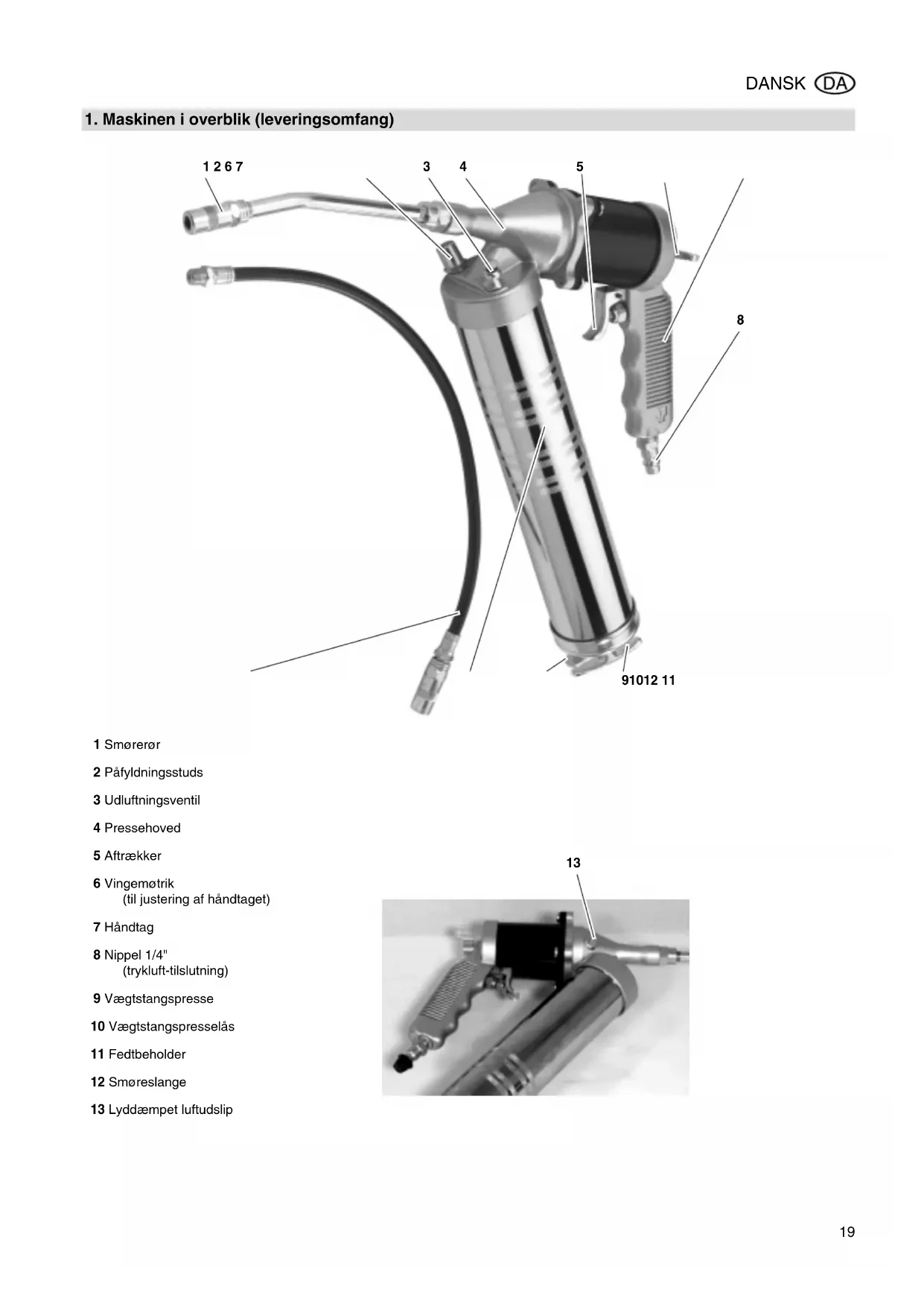 1 Smørerør 2 Påfyldningsstuds 3 Udluftningsventil 4 Pressehoved 5 Aftrækker 6 Vingemøtrik (til justering af håndtaget) 7 Håndtag 8 Nippel 1/4" (trykluft-tilslutning) 9 Vægtstangspresse 10 Vægtstangspresselås 11 Fedtbeholder 12 Smøreslange 13 Lyddæmpet luftudslip