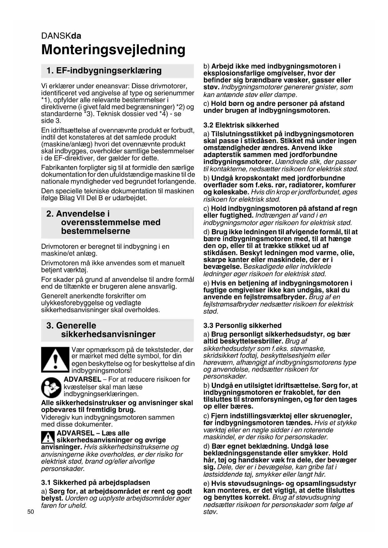 Monteringsvejledning Vi erklærer under eneansvar: Disse drivmotorer, identificeret ved angivelse af type og serienummer *1), opfylder alle relevante bestemmelser i direktiverne (i givet fald med begrænsninger) *2) og standarderne *3). Teknisk dossier ved *4) - se side 3. En idriftsættelse af ovennævnte produkt er forbudt, indtil det konstateres at det samlede produkt (maskine/anlæg) hvori det ovennævnte produkt skal indbygges, overholder samtlige bestemmelser i de EF-direktiver, der gælder for dette. Fabrikanten forpligter sig til at formidle den særlige dokumentation for den ufuldstændige maskine til de nationale myndigheder ved begrundet forlangende. Den specielle tekniske dokumentation til maskinen ifølge Bilag VII Del B er udarbejdet. Drivmotoren er beregnet til indbygning i en maskine/et anlæg. Drivmotoren må ikke anvendes som et manuelt betjent værktøj. For skader på grund af anvendelse til andre formål end de tiltænkte er brugeren alene ansvarlig. Generelt anerkendte forskrifter om ulykkesforebyggelse og vedlagte sikkerhedsanvisninger skal overholdes. Vær opmærksom på de tekststeder, der er mærket med dette symbol, for din egen beskyttelse og for beskyttelse af din indbygningsmotors! ADVARSEL – For at reducere risikoen for kvæstelser skal man læse indbygningserklæringen. Alle sikkerhedsinstrukser og anvisninger skal opbevares til fremtidig brug. Videregiv kun indbygningsmotoren sammen med disse dokumenter. ADVARSEL – Læs alle sikkerhedsanvisninger og øvrige anvisninger. Hvis sikkerhedsinstrukserne og anvisningerne ikke overholdes, er der risiko for elektrisk stød, brand og/eller alvorlige personskader.