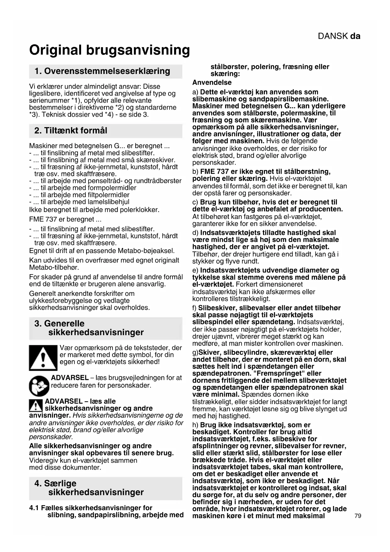 Original brugsanvisning Vi erklærer under almindeligt ansvar: Disse ligeslibere, identificeret ved angivelse af type og serienummer *1), opfylder alle relevante bestemmelser i direktiverne *2) og standarderne *3). Teknisk dossier ved *4) - se side 3. Maskiner med betegnelsen G... er beregnet ... - ... til finslibning af metal med slibestifter. - ... til finslibning af metal med små skæreskiver. - ... til fræsning af ikke-jernmetal, kunststof, hårdt træ osv. med skaftfræsere. - ... til arbejde med penseltråd- og rundtrådbørster - ... til arbejde med formpolermidler - ... til arbejde med filtpolermidler - ... til arbejde med lamelslibehjul Ikke beregnet til arbejde med polerklokker. FME 737 er beregnet ... - ... til finslibning af metal med slibestifter. - ... til fræsning af ikke-jernmetal, kunststof, hårdt træ osv. med skaftfræsere. Egnet til drift af en passende Metabo-bøjeaksel. Kan udvides til en overfræser med egnet originalt Metabo-tilbehør. For skader på grund af anvendelse til andre formål end de tiltænkte er brugeren alene ansvarlig. Generelt anerkendte forskrifter om ulykkesforebyggelse og vedlagte sikkerhedsanvisninger skal overholdes. Vær opmærksom på de tekststeder, der er markeret med dette symbol, for din egen og el-værktøjets sikkerhed! ADVARSEL – læs brugsvejledningen for at reducere faren for personskader. ADVARSEL – læs alle sikkerhedsanvisninger og andre anvisninger. Hvis sikkerhedsanvisningerne og de andre anvisninger ikke overholdes, er der risiko for elektrisk stød, brand og/eller alvorlige personskader. Alle sikkerhedsanvisninger og andre anvisninger skal opbevares til senere brug. Videregiv kun el-værktøjet sammen med disse dokumenter.