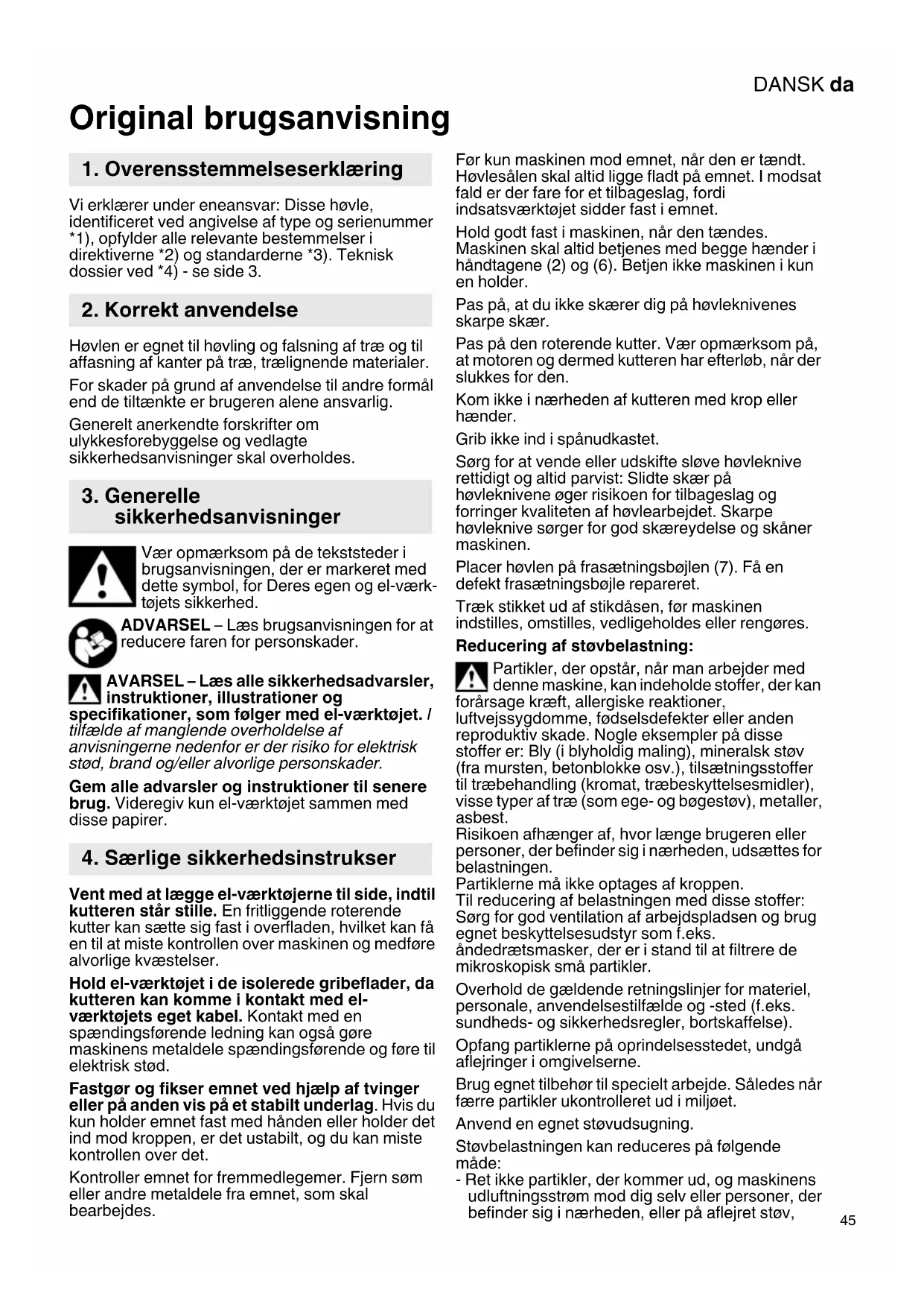 Original brugsanvisning Vi erklærer under eneansvar: Disse høvle, identificeret ved angivelse af type og serienummer *1), opfylder alle relevante bestemmelser i direktiverne *2) og standarderne *3). Teknisk dossier ved *4) - se side 3. Høvlen er egnet til høvling og falsning af træ og til affasning af kanter på træ, trælignende materialer. For skader på grund af anvendelse til andre formål end de tiltænkte er brugeren alene ansvarlig. Generelt anerkendte forskrifter om ulykkesforebyggelse og vedlagte sikkerhedsanvisninger skal overholdes. Vær opmærksom på de tekststeder i brugsanvisningen, der er markeret med dette symbol, for Deres egen og el-værk- tøjets sikkerhed. ADVARSEL – Læs brugsanvisningen for at reducere faren for personskader. AVARSEL – Læs alle sikkerhedsadvarsler, instruktioner, illustrationer og specifikationer, som følger med el-værktøjet. I tilfælde af manglende overholdelse af anvisningerne nedenfor er der risiko for elektrisk stød, brand og/eller alvorlige personskader. Gem alle advarsler og instruktioner til senere brug. Videregiv kun el-værktøjet sammen med disse papirer. Vent med at lægge el-værktøjerne til side, indtil kutteren står stille. En fritliggende roterende kutter kan sætte sig fast i overfladen, hvilket kan få en til at miste kontrollen over maskinen og medføre alvorlige kvæstelser. Hold el-værktøjet i de isolerede gribeflader, da kutteren kan komme i kontakt med el- værktøjets eget kabel. Kontakt med en spændingsførende ledning kan også gøre maskinens metaldele spændingsførende og føre til elektrisk stød. Fastgør og fikser emnet ved hjælp af tvinger eller på anden vis på et stabilt underlag. Hvis du kun holder emnet fast med hånden eller holder det ind mod kroppen, er det ustabilt, og du kan miste kontrollen over det. Kontroller emnet for fremmedlegemer. Fjern søm eller andre metaldele fra emnet, som skal bearbejdes. Før kun maskinen mod emnet, når den er tændt. Høvlesålen skal altid ligge fladt på emnet. I modsat fald er der fare for et tilbageslag, fordi indsatsværktøjet sidder fast i emnet. Hold godt fast i maskinen, når den tændes. Maskinen skal altid betjenes med begge hænder i håndtagene (2) og (6). Betjen ikke maskinen i kun en holder. Pas på, at du ikke skærer dig på høvleknivenes skarpe skær. Pas på den roterende kutter. Vær opmærksom på, at motoren og dermed kutteren har efterløb, når der slukkes for den. Kom ikke i nærheden af kutteren med krop eller hænder. Grib ikke ind i spånudkastet. Sørg for at vende eller udskifte sløve høvleknive rettidigt og altid parvist: Slidte skær på høvleknivene øger risikoen for tilbageslag og forringer kvaliteten af høvlearbejdet. Skarpe høvleknive sørger for god skæreydelse og skåner maskinen. Placer høvlen på frasætningsbøjlen (7). Få en defekt frasætningsbøjle repareret. Træk stikket ud af stikdåsen, før maskinen indstilles, omstilles, vedligeholdes eller rengøres. Reducering af støvbelastning: Partikler, der opstår, når man arbejder med denne maskine, kan indeholde stoffer, der kan forårsage kræft, allergiske reaktioner, luftvejssygdomme, fødselsdefekter eller anden reproduktiv skade. Nogle eksempler på disse stoffer er: Bly (i blyholdig maling), mineralsk støv (fra mursten, betonblokke osv.), tilsætningsstoffer til træbehandling (kromat, træbeskyttelsesmidler), visse typer af træ (som ege- og bøgestøv), metaller, asbest. Risikoen afhænger af, hvor længe brugeren eller personer, der befinder sig i nærheden, udsættes for belastningen. Partiklerne må ikke optages af kroppen. Til reducering af belastningen med disse stoffer: Sørg for god ventilation af arbejdspladsen og brug egnet beskyttelsesudstyr som f.eks. åndedrætsmasker, der er i stand til at filtrere de mikroskopisk små partikler. Overhold de gældende retningslinjer for materiel, personale, anvendelsestilfælde og -sted (f.eks. sundheds- og sikkerhedsregler, bortskaffelse). Opfang partiklerne på oprindelsesstedet, undgå aflejringer i omgivelserne. Brug egnet tilbehør til specielt arbejde. Således når færre partikler ukontrolleret ud i miljøet. Anvend en egnet støvudsugning. Støvbelastningen kan reduceres på følgende måde: - Ret ikke partikler, der kommer ud, og maskinens udluftningsstrøm mod dig selv eller personer, der befinder sig i nærheden, eller på aflejret støv,
