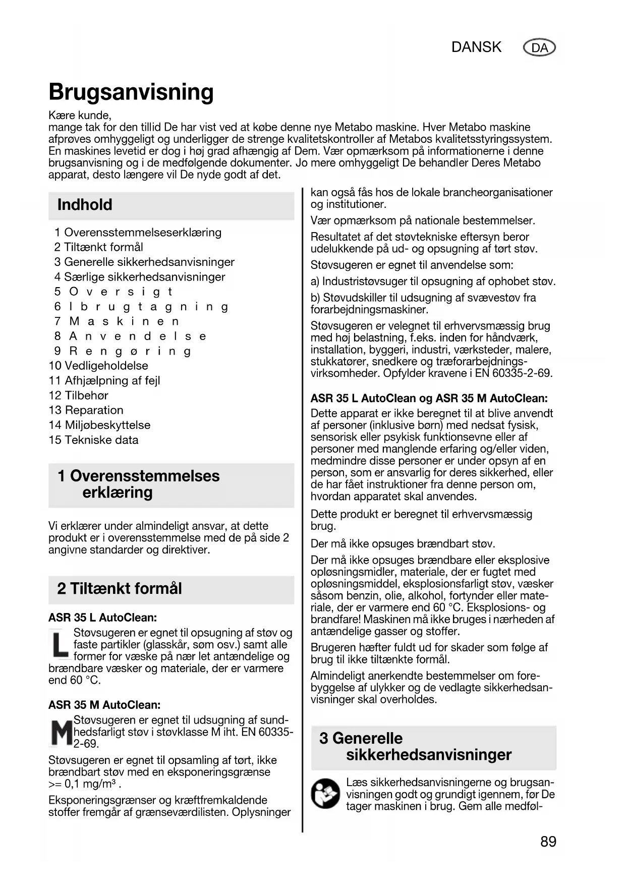 1 Overensstemmelseserklæring 2 Tiltænkt formål 3 Generelle sikkerhedsanvisninger 4 Særlige sikkerhedsanvisninger 5Oversigt 6Ibrugtagning 7Maskinen 8Anvendelse 9Rengøring 10 Vedligeholdelse 11 Afhjælpning af fejl 12 Tilbehør 13 Reparation 14 Miljøbeskyttelse 15 Tekniske data Vi erklærer under almindeligt ansvar, at dette produkt er i overensstemmelse med de på side 2 angivne standarder og direktiver. ASR 35 L AutoClean: Støvsugeren er egnet til opsugning af støv og faste partikler (glasskår, søm osv.) samt alle former for væske på nær let antændelige og brændbare væsker og materiale, der er varmere end 60 °C. ASR 35 M AutoClean: Støvsugeren er egnet til udsugning af sund- hedsfarligt støv i støvklasse M iht. EN 60335- 2-69. Støvsugeren er egnet til opsamling af tørt, ikke brændbart støv med en eksponeringsgrænse >= 0,1 mg/m³ . Eksponeringsgrænser og kræftfremkaldende stoffer fremgår af grænseværdilisten. Oplysninger kan også fås hos de lokale brancheorganisationer og institutioner. Vær opmærksom på nationale bestemmelser. Resultatet af det støvtekniske eftersyn beror udelukkende på ud- og opsugning af tørt støv. Støvsugeren er egnet til anvendelse som: a) Industristøvsuger til opsugning af ophobet støv. b) Støvudskiller til udsugning af svævestøv fra forarbejdningsmaskiner. Støvsugeren er velegnet til erhvervsmæssig brug med høj belastning, f.eks. inden for håndværk, installation, byggeri, industri, værksteder, malere, stukkatører, snedkere og træforarbejdnings- virksomheder. Opfylder kravene i EN 60335-2-69. ASR 35 L AutoClean og ASR 35 M AutoClean: Dette apparat er ikke beregnet til at blive anvendt af personer (inklusive børn) med nedsat fysisk, sensorisk eller psykisk funktionsevne eller af personer med manglende erfaring og/eller viden, medmindre disse personer er under opsyn af en person, som er ansvarlig for deres sikkerhed, eller de har fået instruktioner fra denne person om, hvordan apparatet skal anvendes. Dette produkt er beregnet til erhvervsmæssig brug. Der må ikke opsuges brændbart støv. Der må ikke opsuges brændbare eller eksplosive opløsningsmidler, materiale, der er fugtet med opløsningsmiddel, eksplosionsfarligt støv, væsker såsom benzin, olie, alkohol, fortynder eller mate- riale, der er varmere end 60 °C. Eksplosions- og brandfare! Maskinen må ikke bruges i nærheden af antændelige gasser og stoffer. Brugeren hæfter fuldt ud for skader som følge af brug til ikke tiltænkte formål. Almindeligt anerkendte bestemmelser om fore- byggelse af ulykker og de vedlagte sikkerhedsan- visninger skal overholdes. Læs sikkerhedsanvisningerne og brugsan- visningen godt og grundigt igennem, før De tager maskinen i brug. Gem alle medføl- Brugsanvisning Kære kunde, mange tak for den tillid De har vist ved at købe denne nye Metabo maskine. Hver Metabo maskine afprøves omhyggeligt og underligger de strenge kvalitetskontroller af Metabos kvalitetsstyringssystem. En maskines levetid er dog i høj grad afhængig af Dem. Vær opmærksom på informationerne i denne brugsanvisning og i de medfølgende dokumenter. Jo mere omhyggeligt De behandler Deres Metabo apparat, desto længere vil De nyde godt af det. Indhold 1 Overensstemmelses erklæring 2 Tiltænkt formål 3 Generelle sikkerhedsanvisninger 17027067_0711 ASR 35 L_M AutoClean ENTWURF.book Seite 89 Montag, 25. Juli 2011 4:46 1690 DANSK