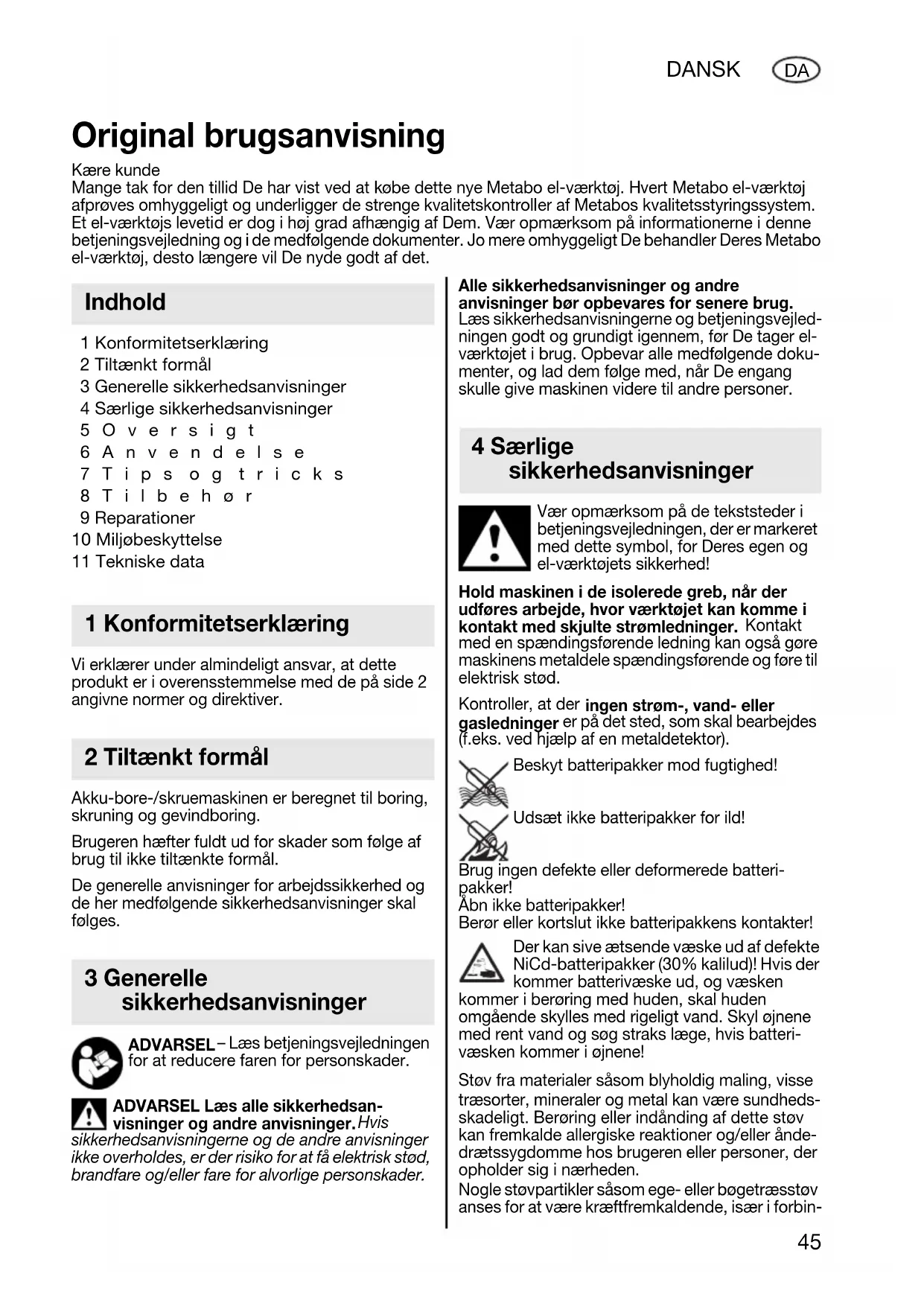 1 Konformitetserklæring 2 Tiltænkt formål 3 Generelle sikkerhedsanvisninger 4 Særlige sikkerhedsanvisninger 5Oversigt 6Anvendelse 7Tips og tricks 8Tilbehør 9 Reparationer 10 Miljøbeskyttelse 11 Tekniske data Vi erklærer under almindeligt ansvar, at dette produkt er i overensstemmelse med de på side 2 angivne normer og direktiver. Akku-bore-/skruemaskinen er beregnet til boring, skruning og gevindboring. Brugeren hæfter fuldt ud for skader som følge af brug til ikke tiltænkte formål. De generelle anvisninger for arbejdssikkerhed og de her medfølgende sikkerhedsanvisninger skal følges. ADVARSEL – Læs betjeningsvejledningen for at reducere faren for personskader. ADVARSEL Læs alle sikkerhedsan- visninger og andre anvisninger. Hvis sikkerhedsanvisningerne og de andre anvisninger ikke overholdes, er der risiko for at få elektrisk stød, brandfare og/eller fare for alvorlige personskader. Alle sikkerhedsanvisninger og andre anvisninger bør opbevares for senere brug. Læs sikkerhedsanvisningerne og betjeningsvejled- ningen godt og grundigt igennem, før De tager el- værktøjet i brug. Opbevar alle medfølgende doku- menter, og lad dem følge med, når De engang skulle give maskinen videre til andre personer. Vær opmærksom på de tekststeder i betjeningsvejledningen, der er markeret med dette symbol, for Deres egen og el-værktøjets sikkerhed! Hold maskinen i de isolerede greb, når der udføres arbejde, hvor værktøjet kan komme i kontakt med skjulte strømledninger. Kontakt med en spændingsførende ledning kan også gøre maskinens metaldele spændingsførende og føre til elektrisk stød. Kontroller, at der ingen strøm-, vand- eller gasledninger er på det sted, som skal bearbejdes (f.eks. ved hjælp af en metaldetektor). Beskyt batteripakker mod fugtighed! Udsæt ikke batteripakker for ild! Brug ingen defekte eller deformerede batteri- pakker! Åbn ikke batteripakker! Berør eller kortslut ikke batteripakkens kontakter! Der kan sive ætsende væske ud af defekte NiCd-batteripakker (30% kalilud)! Hvis der kommer batterivæske ud, og væsken kommer i berøring med huden, skal huden omgående skylles med rigeligt vand. Skyl øjnene med rent vand og søg straks læge, hvis batteri- væsken kommer i øjnene! Støv fra materialer såsom blyholdig maling, visse træsorter, mineraler og metal kan være sundheds- skadeligt. Berøring eller indånding af dette støv kan fremkalde allergiske reaktioner og/eller ånde- drætssygdomme hos brugeren eller personer, der opholder sig i nærheden. Nogle støvpartikler såsom ege- eller bøgetræsstøv anses for at være kræftfremkaldende, især i forbin- Original brugsanvisning Kære kunde Mange tak for den tillid De har vist ved at købe dette nye Metabo el-værktøj. Hvert Metabo el-værktøj afprøves omhyggeligt og underligger de strenge kvalitetskontroller af Metabos kvalitetsstyringssystem. Et el-værktøjs levetid er dog i høj grad afhængig af Dem. Vær opmærksom på informationerne i denne betjeningsvejledning og i de medfølgende dokumenter. Jo mere omhyggeligt De behandler Deres Metabo el-værktøj, desto længere vil De nyde godt af det. Indhold 1 Konformitetserklæring 2 Tiltænkt formål 3 Generelle sikkerhedsanvisninger 4 Særlige sikkerhedsanvisninger 17026985_1010 BS 12 NiCd.book Seite 45 Mittwoch, 13. Oktober 2010 8:31 0846 DANSK