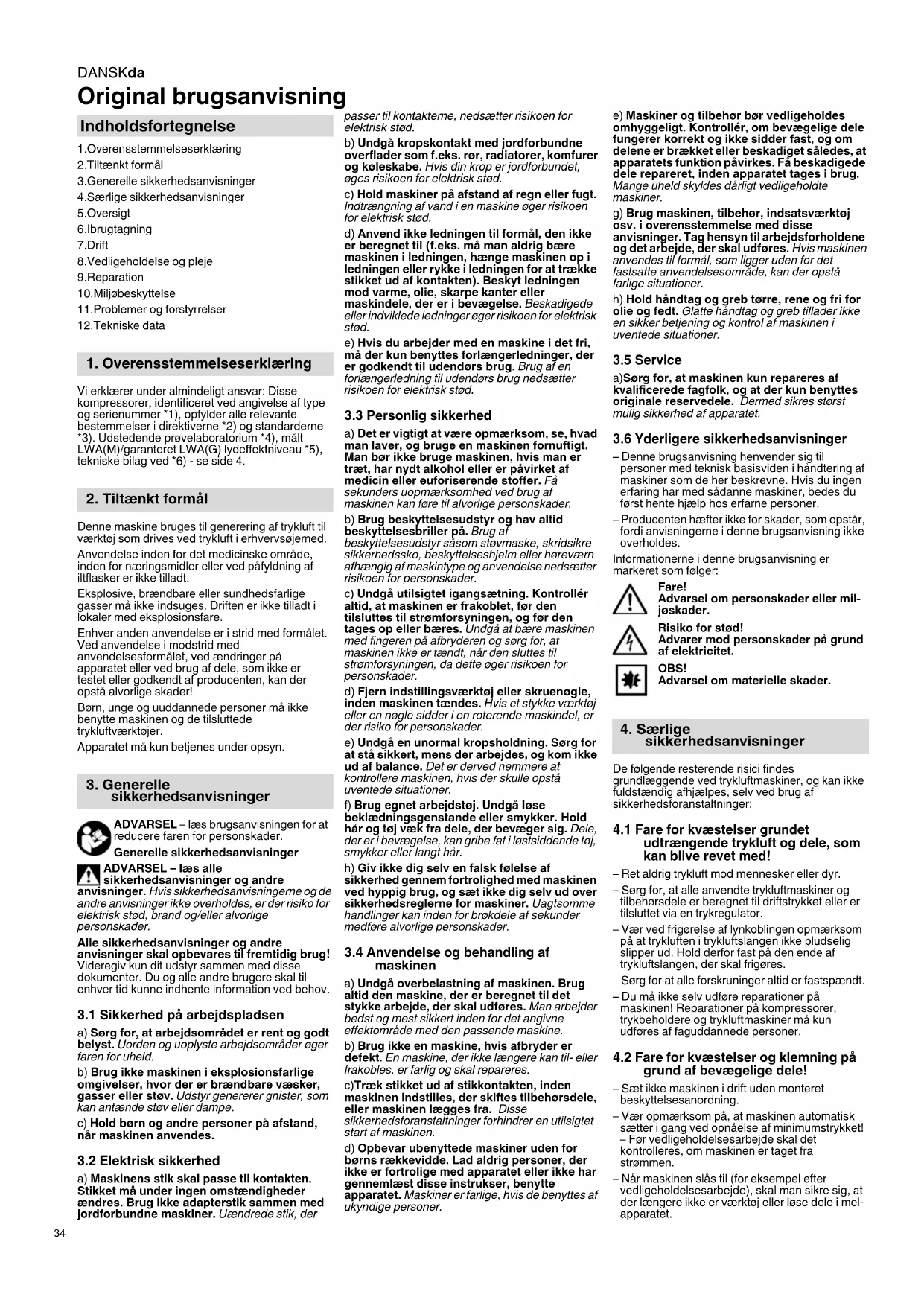 Original brugsanvisning 1.Overensstemmelseserklæring 2.Tiltænkt formål 3.Generelle sikkerhedsanvisninger 4.Særlige sikkerhedsanvisninger 5.Oversigt 6.Ibrugtagning 7.Drift 8.Vedligeholdelse og pleje 9.Reparation 10.Miljøbeskyttelse 11.Problemer og forstyrrelser 12.Tekniske data Vi erklærer under almindeligt ansvar: Disse kompressorer, identificeret ved angivelse af type og serienummer *1), opfylder alle relevante bestemmelser i direktiverne *2) og standarderne *3). Udstedende prøvelaboratorium *4), målt LWA(M)/garanteret LWA(G) lydeffektniveau *5), tekniske bilag ved *6) - se side 4. Denne maskine bruges til generering af trykluft til værktøj som drives ved trykluft i erhvervsøjemed. Anvendelse inden for det medicinske område, inden for næringsmidler eller ved påfyldning af iltflasker er ikke tilladt. Eksplosive, brændbare eller sundhedsfarlige gasser må ikke indsuges. Driften er ikke tilladt i lokaler med eksplosionsfare. Enhver anden anvendelse er i strid med formålet. Ved anvendelse i modstrid med anvendelsesformålet, ved ændringer på apparatet eller ved brug af dele, som ikke er testet eller godkendt af producenten, kan der opstå alvorlige skader! Børn, unge og uuddannede personer må ikke benytte maskinen og de tilsluttede trykluftværktøjer. Apparatet må kun betjenes under opsyn. ADVARSEL – læs brugsanvisningen for at reducere faren for personskader. Generelle sikkerhedsanvisninger ADVARSEL – læs alle sikkerhedsanvisninger og andre anvisninger. Hvis sikkerhedsanvisningerne og de andre anvisninger ikke overholdes, er der risiko for elektrisk stød, brand og/eller alvorlige personskader. Alle sikkerhedsanvisninger og andre anvisninger skal opbevares til fremtidig brug! Videregiv kun dit udstyr sammen med disse dokumenter. Du og alle andre brugere skal til enhver tid kunne indhente information ved behov.