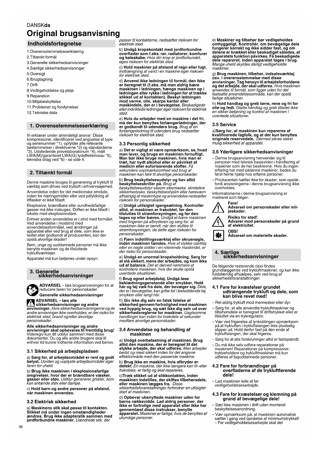 Original brugsanvisning 1.Overensstemmelseserklæring 2.Tiltænkt formål 3.Generelle sikkerhedsanvisninger 4.Særlige sikkerhedsanvisninger 5.Oversigt 6.Ibrugtagning 7.Drift 8.Vedligeholdelse og pleje 9.Reparation 10.Miljøbeskyttelse 11.Problemer og forstyrrelser 12.Tekniske data Vi erklærer under almindeligt ansvar: Disse kompressorer, identificeret ved angivelse af type og serienummer *1), opfylder alle relevante bestemmelser i direktiverne *2) og standarderne *3). Udstedende prøvelaboratorium *4), målt LWA(M)/garanteret LWA(G) lydeffektniveau *5), tekniske bilag ved *6) - se side 4. Denne maskine bruges til generering af trykluft til værktøj som drives ved trykluft i erhvervsøjemed. Anvendelse inden for det medicinske område, inden for næringsmidler eller ved påfyldning af iltflasker er ikke tilladt. Eksplosive, brændbare eller sundhedsfarlige gasser må ikke indsuges. Driften er ikke tilladt i lokaler med eksplosionsfare. Enhver anden anvendelse er i strid med formålet. Ved anvendelse i modstrid med anvendelsesformålet, ved ændringer på apparatet eller ved brug af dele, som ikke er testet eller godkendt af producenten, kan der opstå alvorlige skader! Børn, unge og uuddannede personer må ikke benytte maskinen og de tilsluttede trykluftværktøjer. Apparatet må kun betjenes under opsyn. ADVARSEL – læs brugsanvisningen for at reducere faren for personskader. Generelle sikkerhedsanvisninger ADVARSEL – læs alle sikkerhedsanvisninger og andre anvisninger. Hvis sikkerhedsanvisningerne og de andre anvisninger ikke overholdes, er der risiko for elektrisk stød, brand og/eller alvorlige personskader. Alle sikkerhedsanvisninger og andre anvisninger skal opbevares til fremtidig brug! Videregiv kun dit udstyr sammen med disse dokumenter. Du og alle andre brugere skal til enhver tid kunne indhente information ved behov.