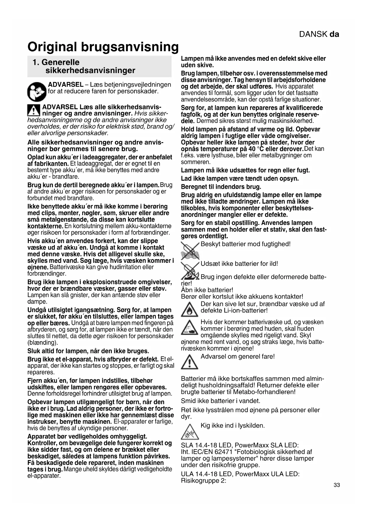 Original brugsanvisning ADVARSEL – Læs betjeningsvejledningen for at reducere faren for personskader. ADVARSEL Læs alle sikkerhedsanvis- ninger og andre anvisninger. Hvis sikker- hedsanvisningerne og de andre anvisninger ikke overholdes, er der risiko for elektrisk stød, brand og/ eller alvorlige personskader. Alle sikkerhedsanvisninger og andre anvis- ninger bør gemmes til senere brug. Oplad kun akku´er i ladeaggregater, der er anbefalet af fabrikanten. Et ladeaggregat, der er egnet til en bestemt type akku´er, må ikke benyttes med andre akku´er - brandfare. Brug kun de dertil beregnede akku´er i lampen. Brug af andre akku´er øger risikoen for personskader og er forbundet med brandfare. Ikke benyttede akku´er må ikke komme i berøring med clips, mønter, nøgler, søm, skruer eller andre små metalgenstande, da disse kan kortslutte kontakterne. En kortslutning mellem akku-kontakterne øger risikoen for personskader i form af forbrændinger. Hvis akku´en anvendes forkert, kan der slippe væske ud af akku´en. Undgå at komme i kontakt med denne væske. Hvis det alligevel skulle ske, skylles med vand. Søg læge, hvis væsken kommer i øjnene. Batterivæske kan give hudirritation eller forbrændinger. Brug ikke lampen i eksplosionstruede omgivelser, hvor der er brændbare væsker, gasser eller støv. Lampen kan slå gnister, der kan antænde støv eller dampe. Undgå utilsigtet igangsætning. Sørg for, at lampen er slukket, før akku´en tilsluttes, eller lampen tages op eller bæres. Undgå at bære lampen med fingeren på afbryderen, og sørg for, at lampen ikke er tændt, når den sluttes til nettet, da dette øger risikoen for personskader (blænding). Sluk altid for lampen, når den ikke bruges. Brug ikke et el-apparat, hvis afbryder er defekt. Et el- apparat, der ikke kan startes og stoppes, er farligt og skal repareres. Fjern akku´en, før lampen indstilles, tilbehør udskiftes, eller lampen rengøres eller opbevares. Denne forholdsregel forhindrer utilsigtet brug af lampen. Opbevar lampen utilgængeligt for børn, når den ikke er i brug. Lad aldrig personer, der ikke er fortro- lige med maskinen eller ikke har gennemlæst disse instrukser, benytte maskinen. El-apparater er farlige, hvis de benyttes af ukyndige personer. Apparatet bør vedligeholdes omhyggeligt. Kontroller, om bevægelige dele fungerer korrekt og ikke sidder fast, og om delene er brækket eller beskadiget, således at lampens funktion påvirkes. Få beskadigede dele repareret, inden maskinen tages i brug. Mange uheld skyldes dårligt vedligeholdte el-apparater. Lampen må ikke anvendes med en defekt skive eller uden skive. Brug lampen, tilbehør osv. i overensstemmelse med disse anvisninger. Tag hensyn til arbejdsforholdene og det arbejde, der skal udføres. Hvis apparatet anvendes til formål, som ligger uden for det fastsatte anvendelsesområde, kan der opstå farlige situationer. Sørg for, at lampen kun repareres af kvalificerede fagfolk, og at der kun benyttes originale reserve- dele. Dermed sikres størst mulig maskinsikkerhed. Hold lampen på afstand af varme og ild. Opbevar aldrig lampen i fugtige eller våde omgivelser. Opbevar heller ikke lampen på steder, hvor der opnås temperaturer på 40 °C eller derover. Det kan f.eks. være lysthuse, biler eller metalbygninger om sommeren. Lampen må ikke udsættes for regn eller fugt. Lad ikke lampen være tændt uden opsyn. Beregnet til indendørs brug. Brug aldrig en ufuldstændig lampe eller en lampe med ikke tilladte ændringer. Lampen må ikke tilkobles, hvis komponenter eller beskyttelses- anordninger mangler eller er defekte. Sørg for en stabil opstilling. Anvendes lampen sammen med en holder eller et stativ, skal den fast- gøres ordentligt. Beskyt batterier mod fugtighed! Udsæt ikke batterier for ild! Brug ingen defekte eller deformerede batte- rier! Åbn ikke batterier! Berør eller kortslut ikke akkuens kontakter! Der kan sive let sur, brændbar væske ud af defekte Li-ion-batterier! Hvis der kommer batterivæske ud, og væsken kommer i berøring med huden, skal huden omgående skylles med rigeligt vand. Skyl øjnene med rent vand, og søg straks læge, hvis batte- rivæsken kommer i øjnene! Advarsel om generel fare! Batterier må ikke bortskaffes sammen med almin- deligt husholdningsaffald! Returner defekte eller brugte batterier til Metabo-forhandleren! Smid ikke batterier i vandet. Ret ikke lysstrålen mod øjnene på personer eller dyr. Kig ikke ind i lyskilden. SLA 14.4-18 LED, PowerMaxx SLA LED: Iht. IEC/EN 62471 "Fotobiologisk sikkerhed af lamper og lampesystemer" hører disse lamper under den risikofrie gruppe. ULA 14.4-18 LED, PowerMaxx ULA LED: Risikogruppe 2: