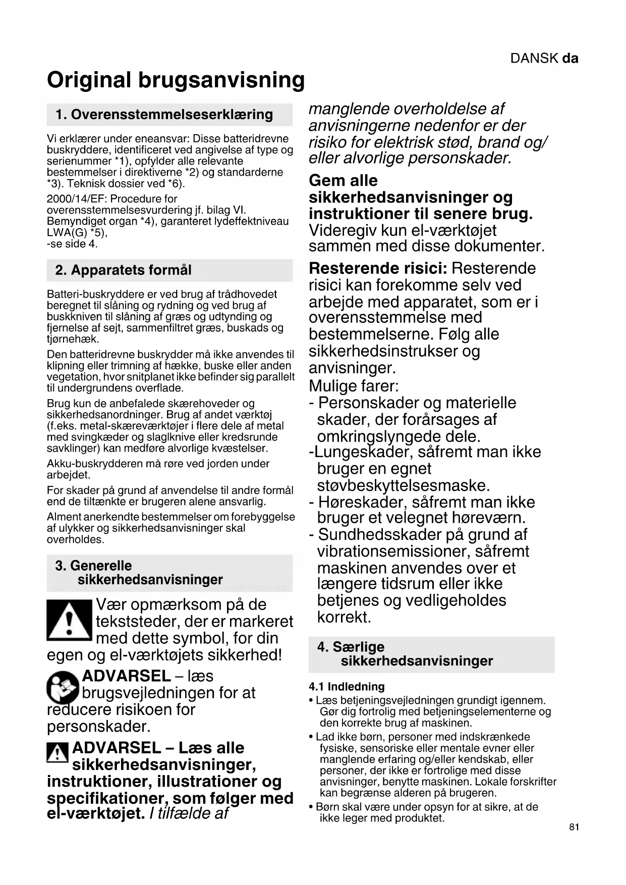 Original brugsanvisning Vi erklærer under eneansvar: Disse batteridrevne buskryddere, identificeret ved angivelse af type og serienummer *1), opfylder alle relevante bestemmelser i direktiverne *2) og standarderne *3). Teknisk dossier ved *6). 2000/14/EF: Procedure for overensstemmelsesvurdering jf. bilag VI. Bemyndiget organ *4), garanteret lydeffektniveau LWA(G) *5), -se side 4. Batteri-buskryddere er ved brug af trådhovedet beregnet til slåning og rydning og ved brug af buskkniven til slåning af græs og udtynding og fjernelse af sejt, sammenfiltret græs, buskads og tjørnehæk. Den batteridrevne buskrydder må ikke anvendes til klipning eller trimning af hække, buske eller anden vegetation, hvor snitplanet ikke befinder sig parallelt til undergrundens overflade. Brug kun de anbefalede skærehoveder og sikkerhedsanordninger. Brug af andet værktøj (f.eks. metal-skæreværktøjer i flere dele af metal med svingkæder og slaglknive eller kredsrunde savklinger) kan medføre alvorlige kvæstelser. Akku-buskrydderen må røre ved jorden under arbejdet. For skader på grund af anvendelse til andre formål end de tiltænkte er brugeren alene ansvarlig. Alment anerkendte bestemmelser om forebyggelse af ulykker og sikkerhedsanvisninger skal overholdes. Vær opmærksom på de tekststeder, der er markeret med dette symbol, for din egen og el-værktøjets sikkerhed! ADVARSEL – læs brugsvejledningen for at reducere risikoen for personskader. ADVARSEL – Læs alle sikkerhedsanvisninger, instruktioner, illustrationer og specifikationer, som følger med el-værktøjet. I tilfælde af manglende overholdelse af anvisningerne nedenfor er der risiko for elektrisk stød, brand og/ eller alvorlige personskader. Gem alle sikkerhedsanvisninger og instruktioner til senere brug. Videregiv kun el-værktøjet sammen med disse dokumenter. Resterende risici: Resterende risici kan forekomme selv ved arbejde med apparatet, som er i overensstemmelse med bestemmelserne. Følg alle sikkerhedsinstrukser og anvisninger. Mulige farer: - Personskader og materielle skader, der forårsages af omkringslyngede dele. -Lungeskader, såfremt man ikke bruger en egnet støvbeskyttelsesmaske. - Høreskader, såfremt man ikke bruger et velegnet høreværn. - Sundhedsskader på grund af vibrationsemissioner, såfremt maskinen anvendes over et længere tidsrum eller ikke betjenes og vedligeholdes korrekt.