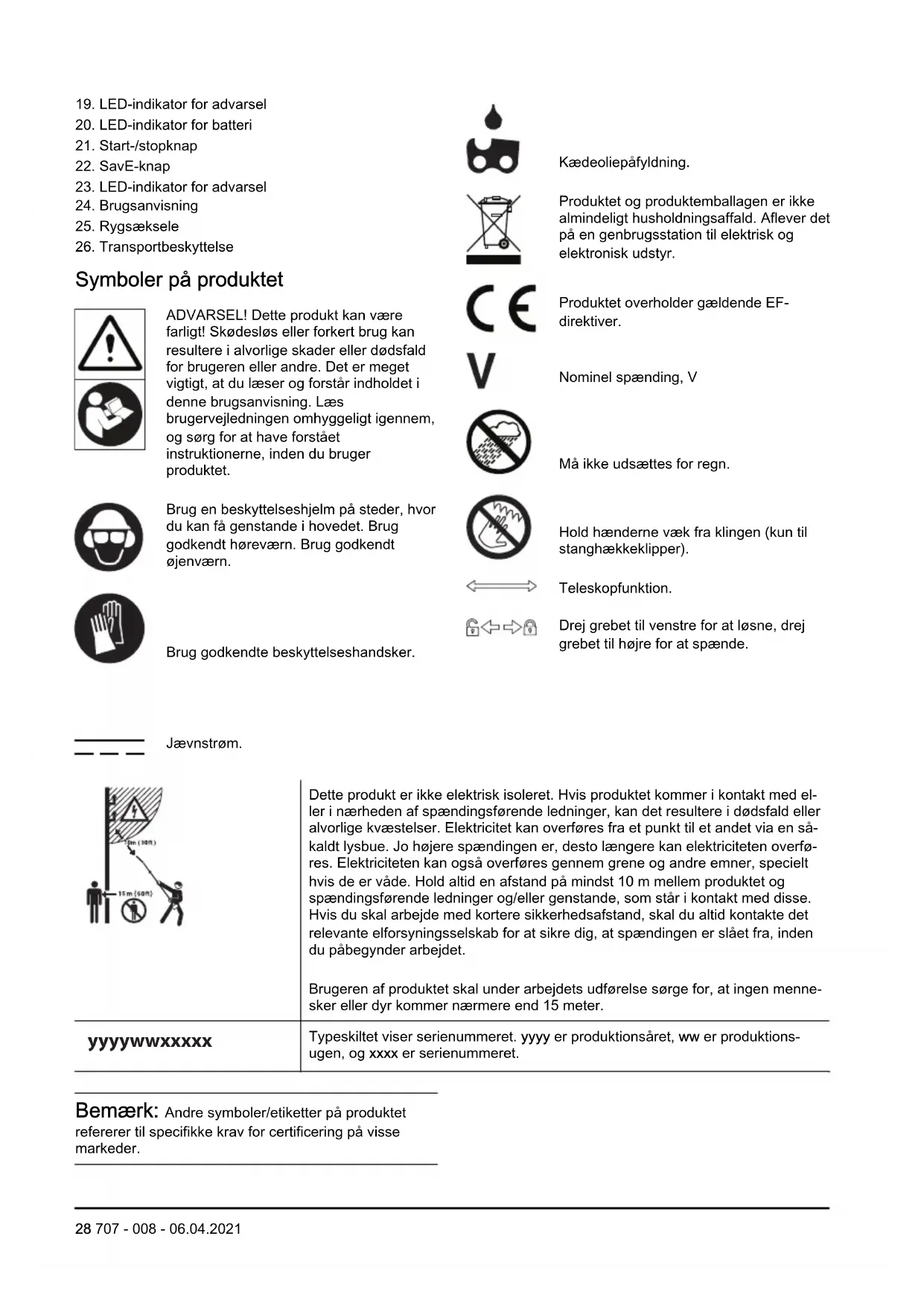 Symboler på produktet ADVARSEL! Dette produkt kan være farligt! Skødesløs eller forkert brug kan resultere i alvorlige skader eller dødsfald for brugeren eller andre. Det er meget vigtigt, at du læser og forstår indholdet i denne brugsanvisning. Læs brugervejledningen omhyggeligt igennem, og sørg for at have forstået instruktionerne, inden du bruger produktet. Brug en beskyttelseshjelm på steder, hvor du kan få genstande i hovedet. Brug godkendt høreværn. Brug godkendt øjenværn. Brug godkendte beskyttelseshandsker. Jævnstrøm. Kædeoliepåfyldning. Produktet og produktemballagen er ikke almindeligt husholdningsaffald. Aflever det på en genbrugsstation til elektrisk og elektronisk udstyr. Produktet overholder gældende EF- direktiver. Nominel spænding, V Må ikke udsættes for regn. Hold hænderne væk fra klingen (kun til stanghækkeklipper). Teleskopfunktion. Drej grebet til venstre for at løsne, drej grebet til højre for at spænde. Dette produkt er ikke elektrisk isoleret. Hvis produktet kommer i kontakt med el- ler i nærheden af spændingsførende ledninger, kan det resultere i dødsfald eller alvorlige kvæstelser. Elektricitet kan overføres fra et punkt til et andet via en så- kaldt lysbue. Jo højere spændingen er, desto længere kan elektriciteten overfø- res. Elektriciteten kan også overføres gennem grene og andre emner, specielt hvis de er våde. Hold altid en afstand på mindst 10 m mellem produktet og spændingsførende ledninger og/eller genstande, som står i kontakt med disse. Hvis du skal arbejde med kortere sikkerhedsafstand, skal du altid kontakte det relevante elforsyningsselskab for at sikre dig, at spændingen er slået fra, inden du påbegynder arbejdet. Brugeren af produktet skal under arbejdets udførelse sørge for, at ingen menne- sker eller dyr kommer nærmere end 15 meter. yyyywwxxxxx Typeskiltet viser serienummeret. yyyy er produktionsåret, ww er produktions- ugen, og xxxx er serienummeret. Bemærk: Andre symboler/etiketter på produktet refererer til specifikke krav for certificering på visse markeder. 28 707 - 008 - 06.04.2021Symboler på batteriet og/eller på batteriopladeren Aflever produktet på en gen- brugsstation for elektrisk og elektronisk udstyr. (Gælder kun Europa) Fejlsikker transformer. Brug og opbevar kun batteriopladeren indendørs. Dobbelt isolering. Produktansvar Som nævnt i produktansvarsbestemmelserne hæfter vi ikke for skader forårsaget af vores produkt, hvis: