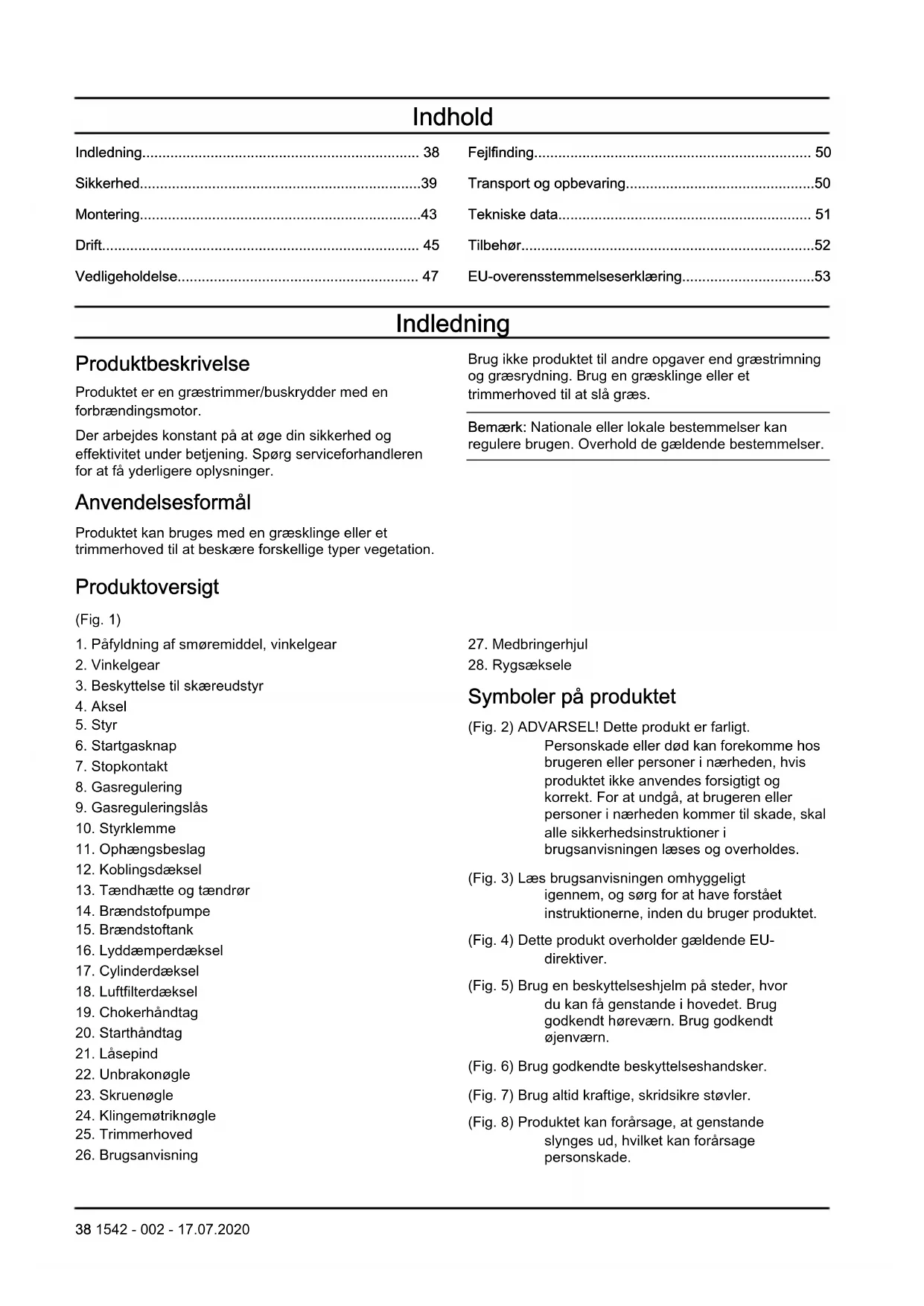 Symboler på produktet (Fig. 2) ADVARSEL! Dette produkt er farligt. Personskade eller død kan forekomme hos brugeren eller personer i nærheden, hvis produktet ikke anvendes forsigtigt og korrekt. For at undgå, at brugeren eller personer i nærheden kommer til skade, skal alle sikkerhedsinstruktioner i brugsanvisningen læses og overholdes. (Fig. 3) Læs brugsanvisningen omhyggeligt igennem, og sørg for at have forstået instruktionerne, inden du bruger produktet. (Fig. 4) Dette produkt overholder gældende EU- direktiver. (Fig. 5) Brug en beskyttelseshjelm på steder, hvor du kan få genstande i hovedet. Brug godkendt høreværn. Brug godkendt øjenværn. (Fig. 6) Brug godkendte beskyttelseshandsker. (Fig. 7) Brug altid kraftige, skridsikre støvler. (Fig. 8) Produktet kan forårsage, at genstande slynges ud, hvilket kan forårsage personskade. 38 1542 - 002 - 17.07.2020(Fig. 9) Maksimalt omdrejningstal for udgående aksel. (Fig. 10) Hold en afstand på mindst 15 m til personer og dyr under brug af produktet. (Fig. 11) Der er risiko for kickback, hvis skæreudstyret rammer en genstand, som ikke omgående skæres over. Produktet kan afskære kropsdele. Hold en afstand på mindst 15 m til personer og dyr under brug af produktet. (Fig. 12) Brændstofpumpebold. (Fig. 13) Retning for lukning af chokeren. (Fig. 14) Retning for åbning af chokeren. (Fig. 15) Emission af støj til omgivelserne i henhold til EU-direktiv 2000/14/EF og New South Wales' lovgivning om "Beskyttelse af miljøet (støjbegrænsning) forordning 2017". Data om emission af støj findes på maskinens mærkat og i kapitlet Tekniske data