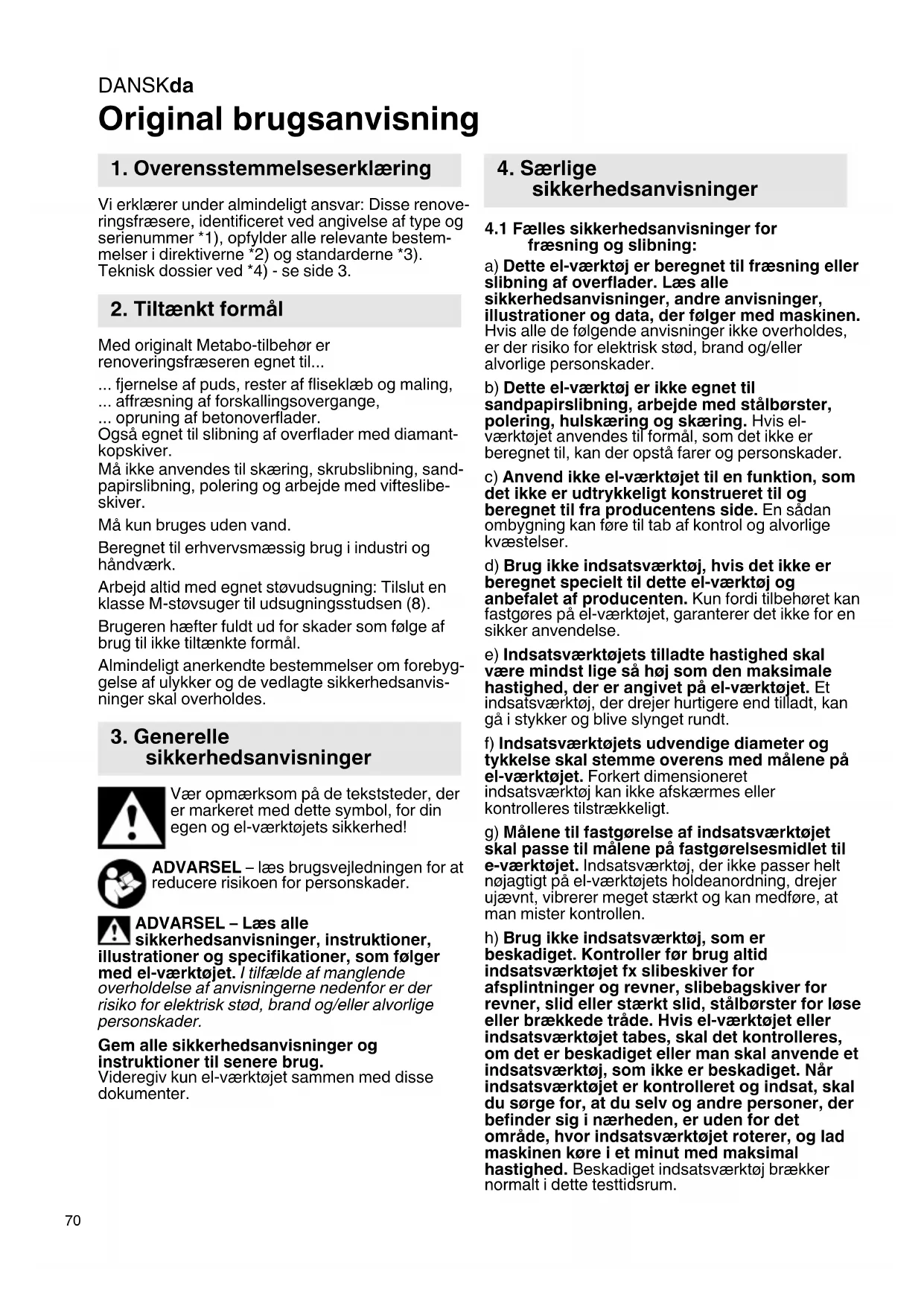 Original brugsanvisning Vi erklærer under almindeligt ansvar: Disse renove- ringsfræsere, identificeret ved angivelse af type og serienummer *1), opfylder alle relevante bestem- melser i direktiverne *2) og standarderne *3). Teknisk dossier ved *4) - se side 3. Med originalt Metabo-tilbehør er renoveringsfræseren egnet til... ... fjernelse af puds, rester af fliseklæb og maling, ... affræsning af forskallingsovergange, ... opruning af betonoverflader. Også egnet til slibning af overflader med diamant- kopskiver. Må ikke anvendes til skæring, skrubslibning, sand- papirslibning, polering og arbejde med vifteslibe- skiver. Må kun bruges uden vand. Beregnet til erhvervsmæssig brug i industri og håndværk. Arbejd altid med egnet støvudsugning: Tilslut en klasse M-støvsuger til udsugningsstudsen (8). Brugeren hæfter fuldt ud for skader som følge af brug til ikke tiltænkte formål. Almindeligt anerkendte bestemmelser om forebyg- gelse af ulykker og de vedlagte sikkerhedsanvis- ninger skal overholdes. Vær opmærksom på de tekststeder, der er markeret med dette symbol, for din egen og el-værktøjets sikkerhed! ADVARSEL – læs brugsvejledningen for at reducere risikoen for personskader. ADVARSEL – Læs alle sikkerhedsanvisninger, instruktioner, illustrationer og specifikationer, som følger med el-værktøjet. I tilfælde af manglende overholdelse af anvisningerne nedenfor er der risiko for elektrisk stød, brand og/eller alvorlige personskader. Gem alle sikkerhedsanvisninger og instruktioner til senere brug. Videregiv kun el-værktøjet sammen med disse dokumenter.