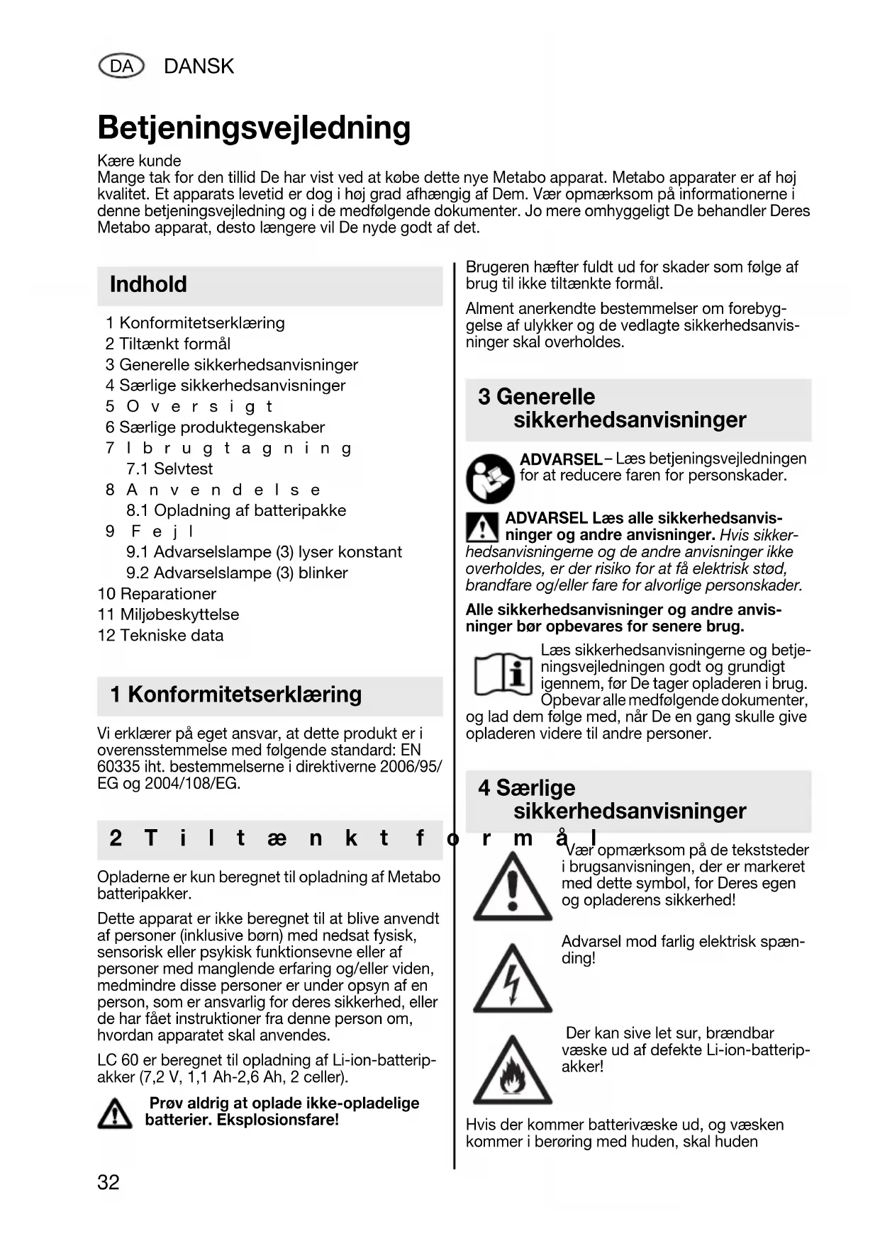 10 Reparationer 11 Miljøbeskyttelse 12 Tekniske data Vi erklærer på eget ansvar, at dette produkt er i overensstemmelse med følgende standard: EN 60335 iht. bestemmelserne i direktiverne 2006/95/ EG og 2004/108/EG. Opladerne er kun beregnet til opladning af Metabo batteripakker. Dette apparat er ikke beregnet til at blive anvendt af personer (inklusive børn) med nedsat fysisk, sensorisk eller psykisk funktionsevne eller af personer med manglende erfaring og/eller viden, medmindre disse personer er under opsyn af en person, som er ansvarlig for deres sikkerhed, eller de har fået instruktioner fra denne person om, hvordan apparatet skal anvendes. LC 60 er beregnet til opladning af Li-ion-batterip- akker (7,2 V, 1,1 Ah-2,6 Ah, 2 celler). Prøv aldrig at oplade ikke-opladelige batterier. Eksplosionsfare! Brugeren hæfter fuldt ud for skader som følge af brug til ikke tiltænkte formål. Alment anerkendte bestemmelser om forebyg- gelse af ulykker og de vedlagte sikkerhedsanvis- ninger skal overholdes. ADVARSEL – Læs betjeningsvejledningen for at reducere faren for personskader. ADVARSEL Læs alle sikkerhedsanvis- ninger og andre anvisninger. Hvis sikker- hedsanvisningerne og de andre anvisninger ikke overholdes, er der risiko for at få elektrisk stød, brandfare og/eller fare for alvorlige personskader. Alle sikkerhedsanvisninger og andre anvis- ninger bør opbevares for senere brug. Læs sikkerhedsanvisningerne og betje- ningsvejledningen godt og grundigt igennem, før De tager opladeren i brug. Opbevar alle medfølgende dokumenter, og lad dem følge med, når De en gang skulle give opladeren videre til andre personer. Vær opmærksom på de tekststeder i brugsanvisningen, der er markeret med dette symbol, for Deres egen og opladerens sikkerhed! Advarsel mod farlig elektrisk spæn- ding! Der kan sive let sur, brændbar væske ud af defekte Li-ion-batterip- akker! Hvis der kommer batterivæske ud, og væsken kommer i berøring med huden, skal huden Betjeningsvejledning Kære kunde Mange tak for den tillid De har vist ved at købe dette nye Metabo apparat. Metabo apparater er af høj kvalitet. Et apparats levetid er dog i høj grad afhængig af Dem. Vær opmærksom på informationerne i denne betjeningsvejledning og i de medfølgende dokumenter. Jo mere omhyggeligt De behandler Deres Metabo apparat, desto længere vil De nyde godt af det. Indhold 1 Konformitetserklæring 2Tiltænkt formål 3 Generelle sikkerhedsanvisninger 4 Særlige sikkerhedsanvisningerDANSK