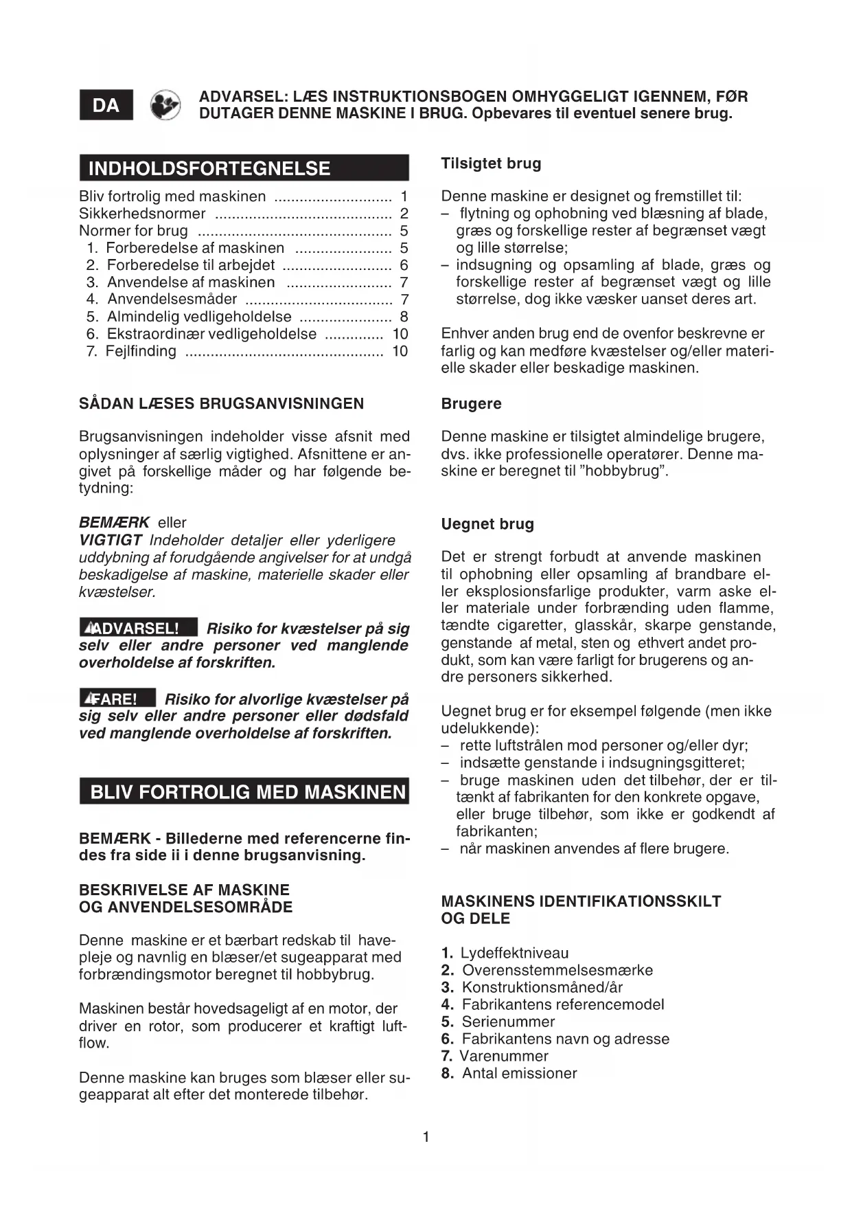 Denne maskine er et bærbart redskab til have- pleje og navnlig en blæser/et sugeapparat med forbrændingsmotor beregnet til hobbybrug. Maskinen består hovedsageligt af en motor, der driver en rotor, som producerer et kraftigt luft- ow. Denne maskine kan bruges som blæser eller su- geapparat alt efter det monterede tilbehør. Tilsigtet brug Denne maskine er designet og fremstillet til: – ytning og ophobning ved blæsning af blade, græs og forskellige rester af begrænset vægt og lille størrelse; – indsugning og opsamling af blade, græs og forskellige rester af begrænset vægt og lille størrelse, dog ikke væsker uanset deres art. Enhver anden brug end de ovenfor beskrevne er farlig og kan medføre kvæstelser og/eller materi- elle skader eller beskadige maskinen. Brugere Denne maskine er tilsigtet almindelige brugere, dvs. ikke professionelle operatører. Denne ma- skine er beregnet til ”hobbybrug”. Uegnet brug Det er strengt forbudt at anvende maskinen til ophobning eller opsamling af brandbare el- ler eksplosionsfarlige produkter, varm aske el- ler materiale under forbrænding uden amme, tændte cigaretter, glasskår, skarpe genstande, genstande af metal, sten og ethvert andet pro- dukt, som kan være farligt for brugerens og an- dre personers sikkerhed. Uegnet brug er for eksempel følgende (men ikke udelukkende): – rette luftstrålen mod personer og/eller dyr; – indsætte genstande i indsugningsgitteret; – bruge maskinen uden det tilbehør, der er til- tænkt af fabrikanten for den konkrete opgave, eller bruge tilbehør, som ikke er godkendt af fabrikanten; – når maskinen anvendes af ere brugere. MASKINENS IDENTIFIKATIONSSKILT OG DELE