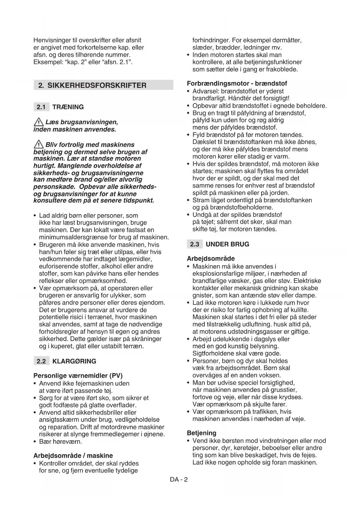 Læs brugsanvisningen, inden maskinen anvendes. Bliv fortrolig med maskinens betjening og dermed selve brugen af maskinen. Lær at standse motoren hurtigt. Manglende overholdelse af sikkerheds- og brugsanvisningerne kan medføre brand og/eller alvorlig personskade. Opbevar alle sikkerheds- og brugsanvisninger for at kunne konsultere dem på et senere tidspunkt.