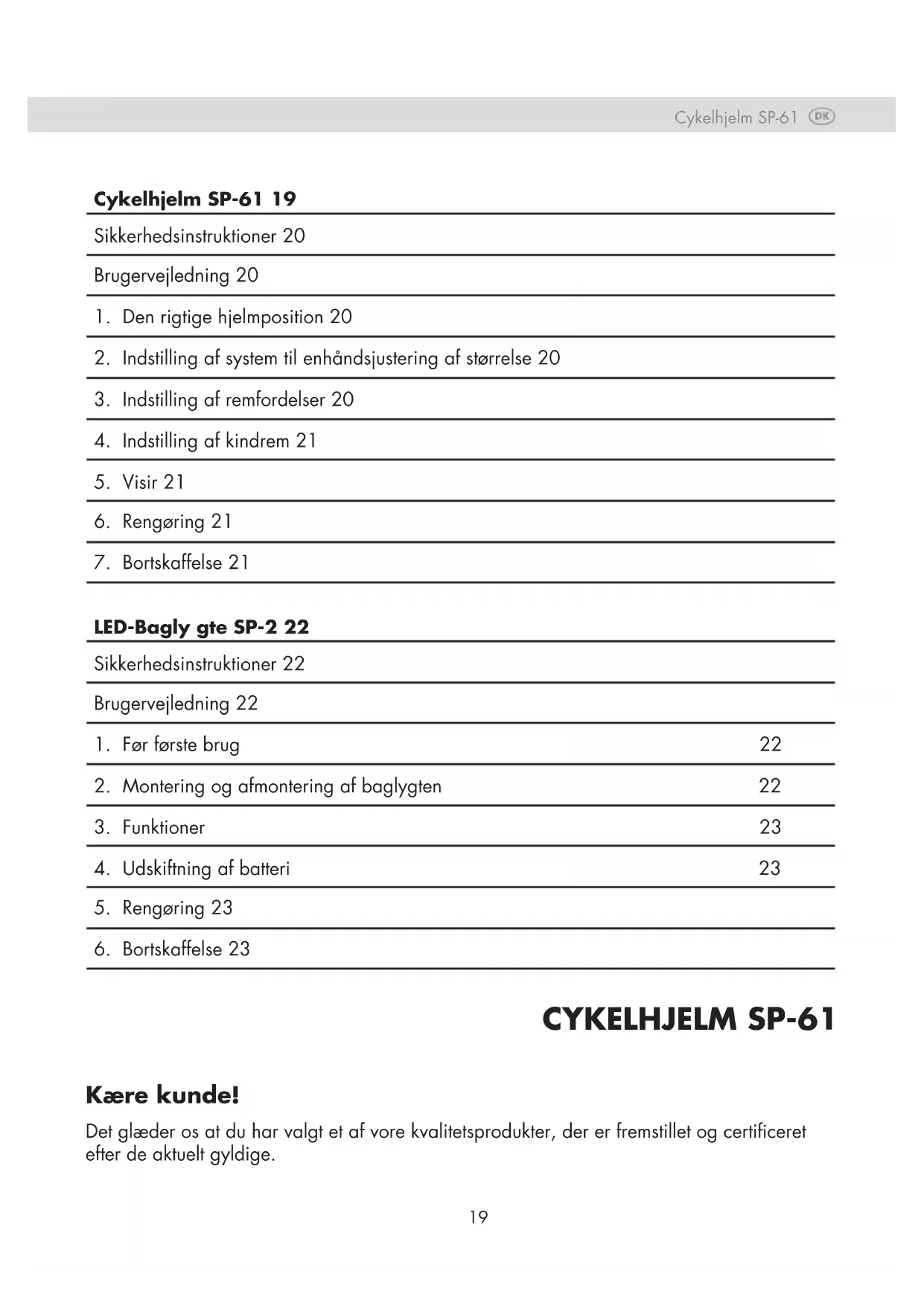 Cykelhjelm SP-61 Sikkerhedsinstruktioner