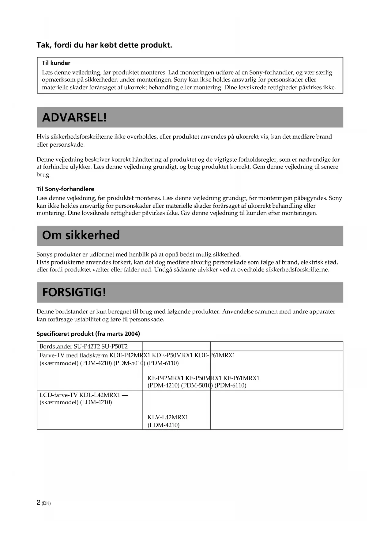 Til kunder ADVARSEL! Hvis følgende forholdsregler ikke overholdes, kan det medføre alvorlig personskade eller død som følgeaf brand, elektrisk stød, eller fordi produktet vælter eller falder ned. Lad monteringen udføre af en Sony-forhandler. Hvis andre personer end Sony-forhandlere udfører monteringsarbejdet, kan dette medføre personskade, daskærmen er meget tung. Sørg for at tage passende forholdsregler for at forhindre, at standeren vælter. Hvis du ikke gør det, kan bordstanderen vælte og forårsage personskade eller materiel skade. Træk et reb, en kædeeller lignende gennem hullerne på sikkerhedsbeslagene, der findes på den øvre del af hovedbeslaget, og fastgørden anden ende af rebet, kæden osv. til væggen, søjlen osv. for at sikre bordstanderen og forhindre den i at vælte. Sørg for at montere bordstanderen på en solid og flad overflade. Monter ikke bordstanderen, så den hælder i en bestemt retning. Hvis du gør det,kan bordstanderen vælte, eller skærmen kan falde ned. Det kan forårsagepersonskade eller materiel skade. Sørg for at montere bordstanderen på en stabil overflade. Hvis du monterer bordstanderen på en ustabil overflade, kan den miste balancenog vælte. Det kan forårsage personskade eller materiel skade. Læn dig ikke på skærmen, og hæng ikke i den med skærmen monteret på bordstanderen. Bordstanderen kan vælte, eller skærmen kan falde ned og forårsage alvorligpersonskade eller død. Dæk ikke skærmens ventilationshul til. Hvis du tildækker ventilationshullet (med en klud eller lignende), kan derakkumuleres varme indeni, og der kan opstå brand.4 (DK) Sørg for, at netledningen eller skærmkablet ikke bliver klemt.