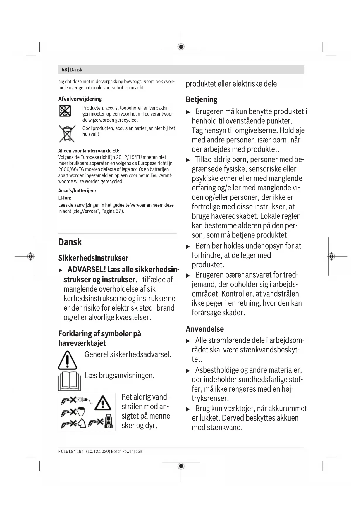 Lek in aansluitingen Controleer of de aansluitingen juist gemonteerd zijn Tankdop lek Controleer of de tankdop goed is afgesloten F 016 L94 184 | (10.12.2020) Bosch Power ToolsNederlands | 57 Symptomen Mogelijke oorzaak Oplossing De motor start in de standbymodus Lek in pomp, spuitpistool of slang Bij aanhoudende storingen in de standbymodus neemt u contact op met de klantenservice Slang kan niet verwij- derd worden Als het gereedschap nog ingeschakeld is, is door de druk in het gereedschap meer kracht nodig. Schakel het gereedschap uit en houd vervolgens de trekker ingedrukt om de druk te verlagen. Tank wordt niet gevuld, hoewel het leidingwa- ter aangesloten is Waterslang is verstopt en/of slangaansluiting is verstopt Gereedschap uitschakelen, waterslang of slan- gaansluiting controleren en reinigen Accu en oplaadapparaat Symptomen Mogelijke oorzaak Oplossing Rode accuoplaadindi- catie knippert Opladen niet mogelijk Accu niet of niet juist geplaatst Accu juist op oplaadapparaat plaatsen Accucontacten vuil Reinig de accucontacten, bijvoorbeeld door de accu enkele keren te plaatsen en te verwijderen, of vervang de accu indien nodig Accu defect Vervang de accu Accuoplaadindicaties branden niet Netstekker van het oplaadapparaat niet (of niet goed) vast gestoken Steek de stekker volledig in het stopcontact Stopcontact, netsnoer of oplaadapparaat defect Netspanning controleren, oplaadapparaat indien nodig door een erkende klantenservice voor Bosch elektrische gereedschappen laten contro- leren Onderhoud en service Onderhoud, bewaren en vervoeren (zie afbeeldingen K – N) Schakel het gereedschap uit en houd de trekker ingedrukt om het water uit de slang te laten lopen. Maak de slang los van het spuitpistool en de waterafvoer. Spuitpistool, borstel en slang kunnen op het gereedschap worden opgeborgen. Laat het water uit het systeem lopen en verwijder de accu. Reinig het filter regelmatig. Onderhoud van de accu Neem de volgende aanwijzingen en maatregelen in acht om een optimaal gebruik van de accu te waarborgen: – Bescherm de accu tegen vocht en water. – Bewaar het tuingereedschap en de accu alleen in het tem- peratuurbereik tussen –20°C en 50 °C. Laat de accu bij- voorbeeld in de zomer niet in de auto liggen. – Bewaar de accu apart en niet in het tuingereedschap. – Laat de accu bij fel zonlicht niet in het tuingereedschap zitten. – De optimale temperatuur voor het bewaren van de accu bedraagt 5°C. – Reinig de ventilatieopeningen van de accu af en toe met een zachte, schone en droge kwast. Een duidelijk kortere gebruiksduur na het opladen geeft aan dat de accu versleten is en moet worden vervangen. Klantenservice en gebruiksadvies Onze klantenservice beantwoordt uw vragen over reparatie en onderhoud van uw product en over vervangingsonderde- len. Explosietekeningen en informatie over vervangingson- derdelen vindt u ook op: www.bosch-pt.com Het Bosch-gebruiksadviesteam helpt u graag bij vragen over onze producten en accessoires. Vermeld bij vragen en bestellingen van vervangingsonderde- len altijd het uit tien cijfers bestaande productnummer vol- gens het typeplaatje van het product. Nederland Tel.: (076) 579 54 54 Fax: (076) 579 54 94 E-mail: gereedschappen@nl.bosch.com Meer serviceadressen vindt u onder: www.bosch-pt.com/serviceaddresses Vervoer Op de meegeleverde Li-Ion-accu’s zijn de eisen voor het ver- voer van gevaarlijke stoffen van toepassing. De accu’s kun- nen door de gebruiker zonder verdere voorwaarden over de weg vervoerd worden. Bij de verzending door derden (bijv. luchtvervoer of expedi- tiebedrijf) moeten bijzondere eisen ten aanzien van verpak- king en markering in acht genomen worden. In deze gevallen moet bij de voorbereiding van de verzending een deskundige voor gevaarlijke stoffen geraadpleegd worden. Verzend accu’s alleen, wanneer de behuizing onbeschadigd is. Plak blootliggende contacten af en verpak de accu zoda- Bosch Power Tools F 016 L94 184 | (10.12.2020)58 | Dansk nig dat deze niet in de verpakking beweegt. Neem ook even- tuele overige nationale voorschriften in acht. Afvalverwijdering Producten, accu’s, toebehoren en verpakkin- gen moeten op een voor het milieu verantwoor- de wijze worden gerecycled. Gooi producten, accu’s en batterijen niet bij het huisvuil! Alleen voor landen van de EU: Volgens de Europese richtlijn 2012/19/EU moeten niet meer bruikbare apparaten en volgens de Europese richtlijn 2006/66/EG moeten defecte of lege accu’s en batterijen apart worden ingezameld en op een voor het milieu verant- woorde wijze worden gerecycled. Accu's/batterijen: Li-Ion: Lees de aanwijzingen in het gedeelte Vervoer en neem deze in acht (zie „Vervoer“, Pagina57). Dansk Sikkerhedsinstrukser u ADVARSEL! Læs alle sikkerhedsin- strukser og instrukser. I tilfælde af manglende overholdelse af sik- kerhedsinstrukserne og instrukserne er der risiko for elektrisk stød, brand og/eller alvorlige kvæstelser. Forklaring af symboler på haveværktøjet Generel sikkerhedsadvarsel. Læs brugsanvisningen. Ret aldrig vand- strålen mod an- sigtet på menne- sker og dyr, produktet eller elektriske dele. Betjening u Brugeren må kun benytte produktet i henhold til ovenstående punkter. Tag hensyn til omgivelserne. Hold øje med andre personer, især børn, når der arbejdes med produktet. u Tillad aldrig børn, personer med be- grænsede fysiske, sensoriske eller psykiske evner eller med manglende erfaring og/eller med manglende vi- den og/eller personer, der ikke er fortrolige med disse instrukser, at bruge haveredskabet. Lokale regler kan bestemme alderen på den per- son, som må betjene produktet. u Børn bør holdes under opsyn for at forhindre, at de leger med produktet. u Brugeren bærer ansvaret for tred- jemand, der opholder sig i arbejds- området. Kontroller, at vandstrålen ikke peger i en retning, hvor den kan forårsage skader. Anvendelse u Alle strømførende dele i arbejdsom- rådet skal være stænkvandsbeskyt- tet. u Asbestholdige og a