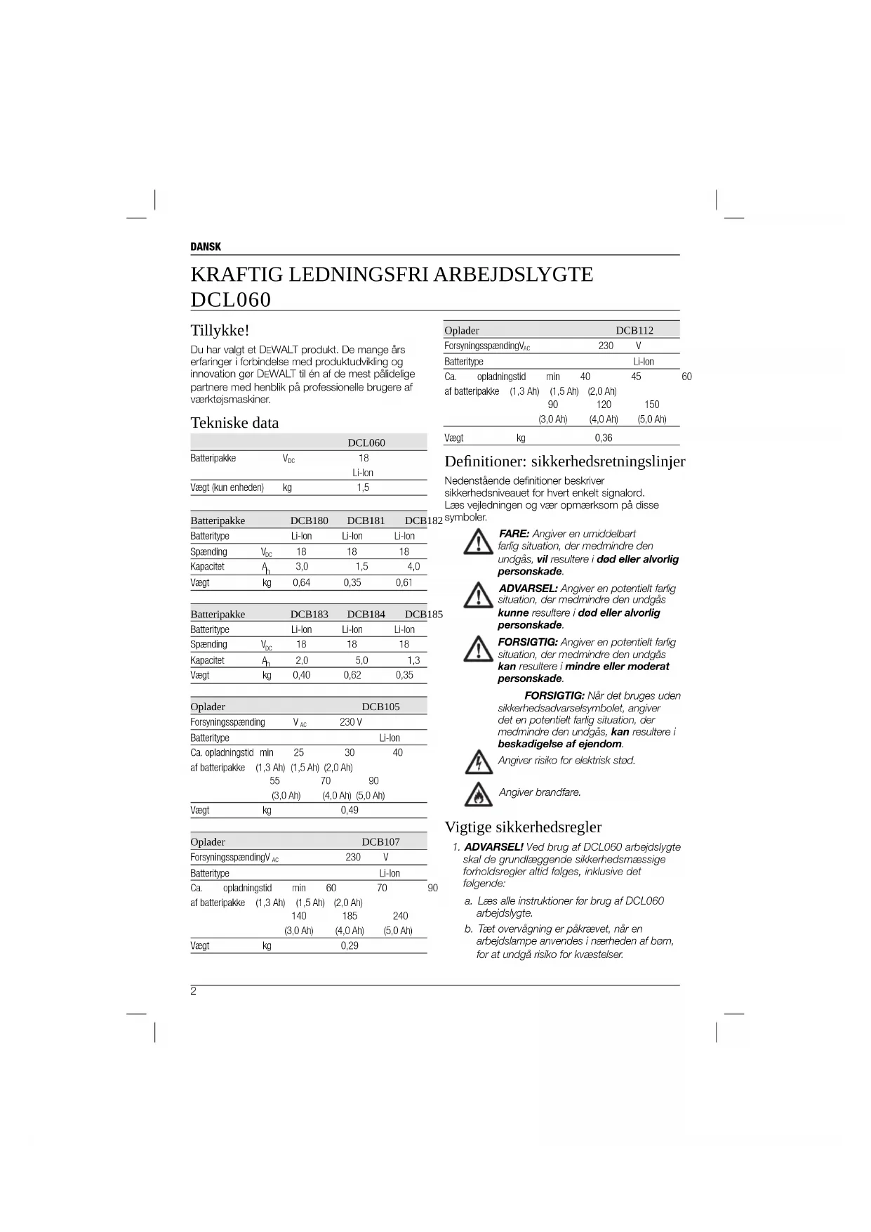 skal de grundlæggende sikkerhedsmæssige forholdsregler altid følges, inklusive det følgende: a. Læs alle instruktioner før brug af DCL060 arbejdslygte. b. Tæt overvågning er påkrævet, når en arbejdslampe anvendes i nærheden af børn, for at undgå risiko for kvæstelser. Tillykke! Du har valgt et DEWALT produkt. De mange års erfaringer i forbindelse med produktudvikling og innovation gør D EWALT til én af de mest pålidelige partnere med henblik på professionelle brugere af værktøjsmaskiner. Tekniske data DCL060 Batteripakke V