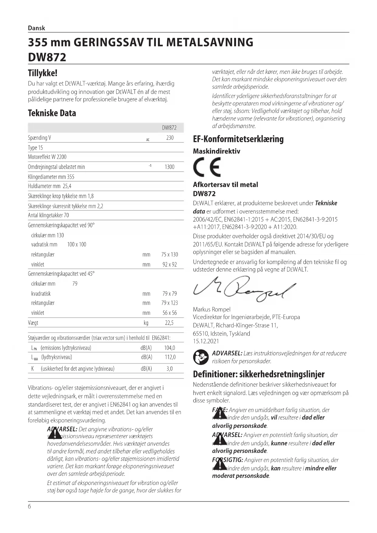 Dansk ADVARSEL: Læs instruktionsvejledningen for at reducere risikoen forpersonskader. Definitioner: sikkerhedsretningslinjer Nedenstående definitioner beskriver sikkerhedsniveauet for hvert enkelt signalord. Læs vejledningen og vær opmærksom på dissesymboler. FARE: Angiver en umiddelbart farlig situation, der medmindre den undgås, vil resultere i død eller alvorligpersonskade. ADVARSEL: Angiver en potentielt farlig situation, der medmindre den undgås, kunne resultere i død eller alvorligpersonskade. FORSIGTIG: Angiver en potentielt farlig situation, der medmindre den undgås, kan resultere i mindre eller moderatpersonskade. EF-Konformitetserklæring Maskindirektiv Afkortersav til metal DW872 DeWALT erklærer, at produkterne beskrevet under Tekniske data er udformet i overensstemmelse med: 2006/42/EC, EN62841-1:2015 + AC:2015, EN62841-3-9:2015 +A11:2017, EN62841-3-9:2020 + A11:2020.Disse produkter overholder også direktivet 2014/30/EU og 2011/65/EU. Kontakt DeWALT på følgende adresse for yderligere oplysninger eller se bagsiden afmanualen.Undertegnede er ansvarlig for kompilering af den tekniske fil og udsteder denne erklæring på vegne afDeWALT.Markus Rompel Vicedirektør for Ingeniørarbejde, PTE-Europa DeWALT, Richard-Klinger-Strase 11, 65510, Idstein, Tyskland 15.12.2021DW872Spænding V