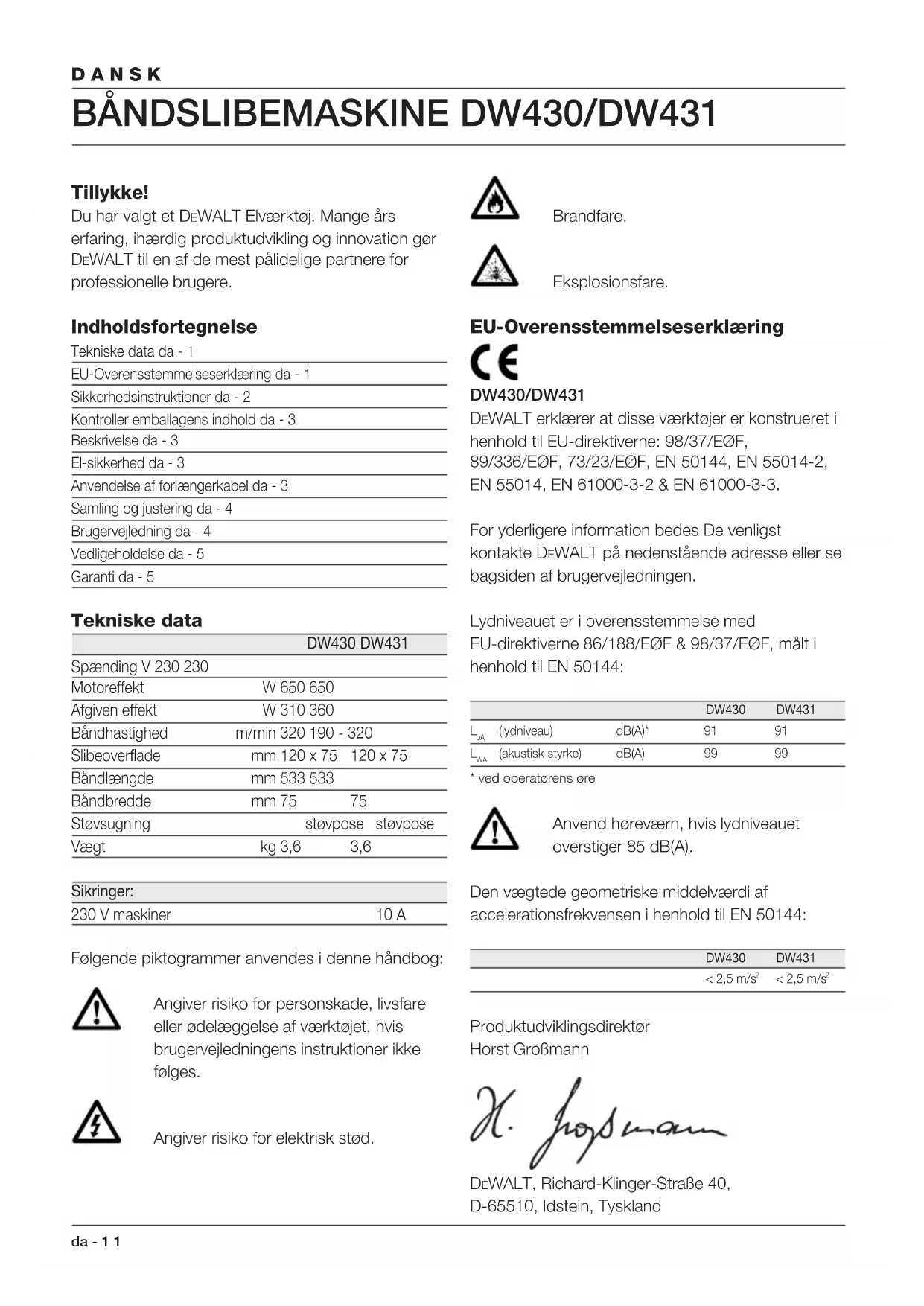 Tillykke! Du har valgt et DEWALT Elværktøj. Mange års erfaring, ihærdig produktudvikling og innovation gør DEWALT til en af de mest pålidelige partnere for professionelle brugere. Indholdsfortegnelse Tekniske data da - 1 EU-Overensstemmelseserklæring da - 1 Sikkerhedsinstruktioner da - 2 Kontroller emballagens indhold da - 3 Beskrivelse da - 3 El-sikkerhed da - 3 Anvendelse af forlængerkabel da - 3 Samling og justering da - 4 Brugervejledning da - 4 Vedligeholdelse da - 5 Garanti da - 5 Tekniske data DW430 DW431 Spænding V 230 230 Motoreffekt W 650 650 Afgiven effekt W 310 360 Båndhastighed m/min 320 190 - 320 Slibeoverflade mm 120 x 75 120 x 75 Båndlængde mm 533 533 Båndbredde mm 75 75 Støvsugning støvpose støvpose Vægt kg 3,6 3,6 Sikringer: 230 V maskiner 10 A Følgende piktogrammer anvendes i denne håndbog: Angiver risiko for personskade, livsfare eller ødelæggelse af værktøjet, hvis brugervejledningens instruktioner ikke følges. Angiver risiko for elektrisk stød. Brandfare. Eksplosionsfare. EU-Overensstemmelseserklæring DW430/DW431 DEWALT erklærer at disse værktøjer er konstrueret i henhold til EU-direktiverne: 98/37/EØF, 89/336/EØF, 73/23/EØF, EN 50144, EN 55014-2, EN 55014, EN 61000-3-2 & EN 61000-3-3. For yderligere information bedes De venligst kontakte DEWALT på nedenstående adresse eller se bagsiden af brugervejledningen. Lydniveauet er i overensstemmelse med EU-direktiverne 86/188/EØF & 98/37/EØF, målt i henhold til EN 50144: DW430 DW431
