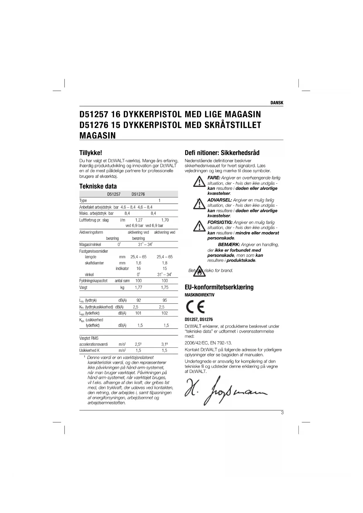 MAGASIN Defi nitioner: Sikkerhedsråd Nedenstående definitioner beskriver sikkerhedsniveauet for hvert signalord. Læs vejledningen og læg mærke til disse symboler. FARE: Angiver en overhængende farlig situation, der - hvis den ikke undgås - kan resultere i døden eller alvorlige kvæstelser. ADVARSEL: Angiver en mulig farlig situation, der - hvis den ikke undgås - kan resultere i døden eller alvorlige kvæstelser. FORSIGTIG: Angiver en mulig farlig situation, der - hvis den ikke undgås - kan resultere i mindre eller moderat personskade. BEMÆRK: Angiver en handling, der ikke er forbundet med personskade, men som kan resultere i produktskade. Betyder risiko for brand. EU-konformitetserklæring MASKINDIREKTIV D51257, D51276 DEWALT erklærer, at produkterne beskrevet under “tekniske data” er udformet i overensstemmelse med: 2006/42/EC, EN 792-13. Kontakt DEWALT på følgende adresse for yderligere oplysninger eller se bagsiden af manualen. Undertegnede er ansvarlig for kompilering af den tekniske fil og udsteder denne erklæring på vegne af DEWALT. Tillykke! Du har valgt et DEWALT-værktøj. Mange års erfaring, ihærdig produktudvikling og innovation gør DEWALT en af de mest pålidelige partnere for professionelle brugere af elværktøj. Tekniske data D51257 D51276 Type 1 1 Anbefalet arbejdstryk bar 4,6 – 8,4 4,6 – 8,4 Maks. arbejdstryk bar 8,4 8,4 Luftforbrug pr. slag l/m 1,27 1,70 ved 6,9 bar ved 6,9 bar Aktiveringsform aktivering ved aktivering ved berøring berøring Magasinvinkel 0˚ 31˚ – 34˚ Fastgørelsesmidler længde mm 25,4 – 65 25,4 – 65 skaftdiamter mm 1,6 1,8 indikator 16 15 vinkel 0˚ 31˚ – 34˚ Fyldningskapacitet antal søm 100 100 Vægt kg 1,77 1,75