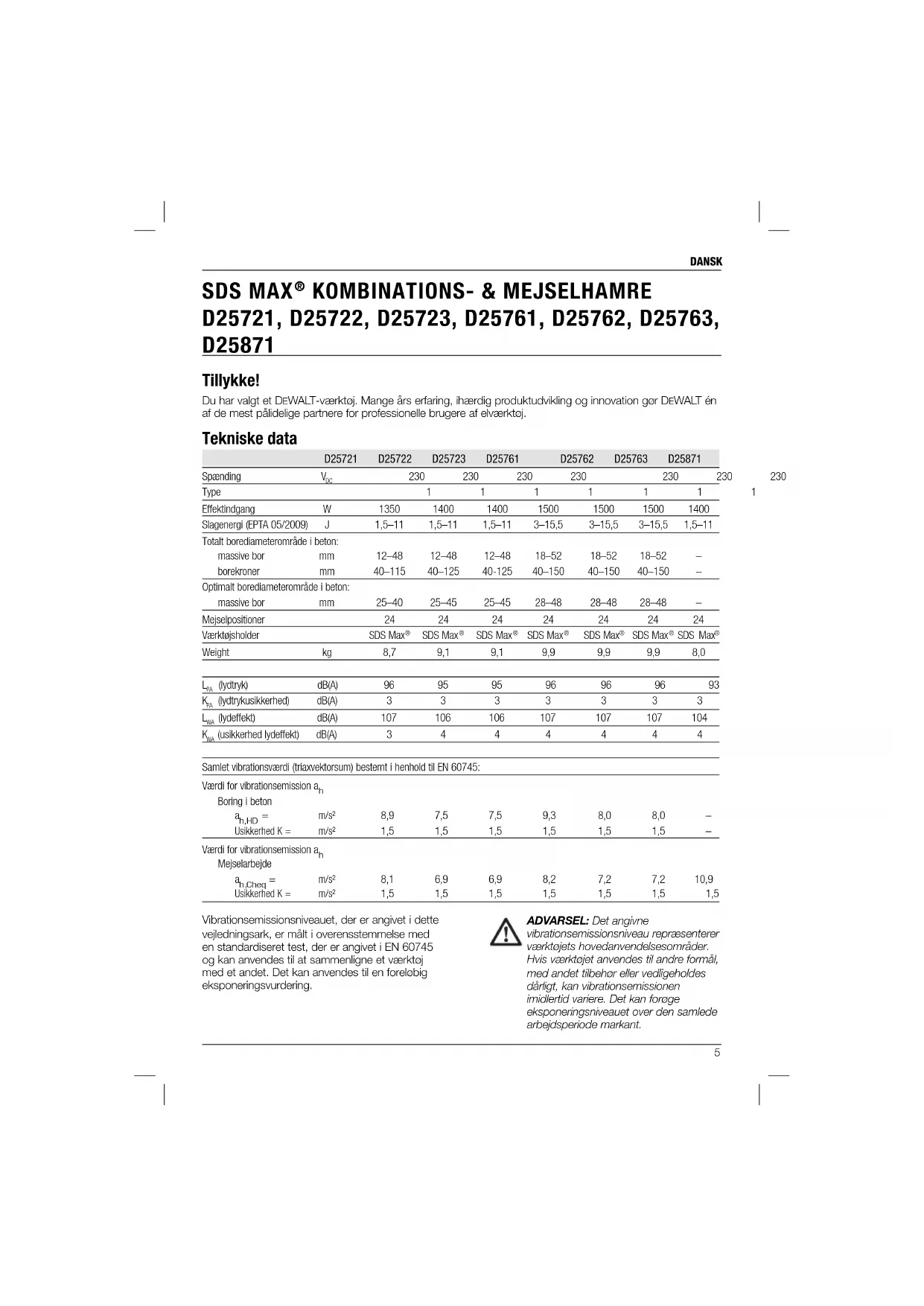 KOMBINATIONS- & MEJSELHAMRE D25721, D25722, D25723, D25761, D25762, D25763, D25871 Vibrationsemissionsniveauet, der er angivet i dette vejledningsark, er målt i overensstemmelse med en standardiseret test, der er angivet i EN 60745 og kan anvendes til at sammenligne et værktøj med et andet. Det kan anvendes til en foreløbig eksponeringsvurdering. ADVARSEL: Det angivne vibrationsemissionsniveau repræsenterer værktøjets hovedanvendelsesområder. Hvis værktøjet anvendes til andre formål, med andet tilbehør eller vedligeholdes dårligt, kan vibrationsemissionen imidlertid variere. Det kan forøge eksponeringsniveauet over den samlede arbejdsperiode markant.DANSK