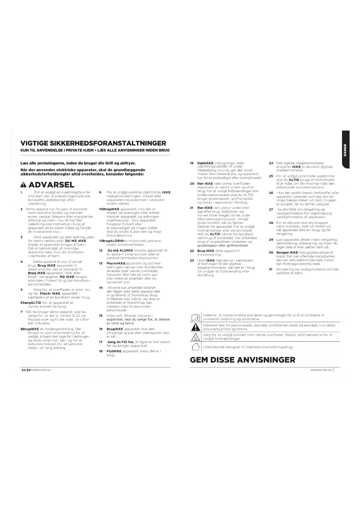 ninjakitchen.eu ninjakitchen.eu Læs alle anvisningerne, inden du bruger din Grill og airfryer. Når der anvendes elektriske apparater, skal de grundlæggende sikkerhedsforholdsregler altid overholdes, herunder følgende: ADVARSEL 1 For at undgå en kvælningsfare for små børn bør al indpakningsmateriale borskaffes øjeblikkeligt efter udpakning. 2 Dette apparat kan bruges af personer med nedsatte fysiske og mentale evner, nedsat følesans eller manglende erfaring og viden, hvis de har fået vejledning eller instruktion i brug af apparatet på en sikker måde og forstår de involverede risici. 3 Hold apparatet og dets ledning uden for børns rækkevidde. DU MÅ IKKE tillade, at apparatet bruges af børn. Det er nødvendigt at overvåge apparatet nøje, hvis det anvendes i nærheden af børn. 4 Dette apparat er kun til privat brug. Brug IKKE apparatet til andet end det, det er beregnet til. Brug IKKE apparatet i biler eller både i bevægelse. Må IKKE bruges udendørs. Forkert brug kan resultere i personskader. 5 Sørg for, at overfladen er plan, ren og tør. Placér IKKE apparatet i nærheden af en bordkant under brug. 6 Sørg ALTID for, at apparatet er samlet korrekt før brug. 7 Når du bruger dette apparat, skal du sørge for, at der er mindst 15,25 cm friplads over og til alle sider, så luften kan cirkulere. 8 Brug IKKE en forlængerledning. Der bruges en kort strømledning for at undgå, at børn kan tage fat i ledningen og blive viklet ind i den, og for at reducere risikoen for, at personer falder i en lang ledning. 9 For at undgå elektrisk stød må du IKKE nedsænke ledningen, stikket eller apparatets hovedenhed i vand eller anden væske. 10 Brug IKKE apparatet, hvis der er skader på ledningen eller stikket. Inspicér apparatet og ledningen regelmæssigt. Hvis apparatet fungerer forkert eller er beskadiget på nogen måde, skal du straks slukke det og ringe til kundeservice. 11 Brug ALDRIG en stikkontakt placeret under bordoverfladen. 12 Du må ALDRIG tilslutte apparatet til en ekstern timer-kontakt eller et separat fjernbetjeningssystem. 13 Placér IKKE apparatet og lad ikke ledningen hænge over bordkanter, skranker eller varme overflader, herunder ikke tæt på varm gas eller elektrisk brænder eller en opvarmet ovn. 14 Anvend kun anbefalet tilbehør, der følger med dette apparat eller er godkendt af SharkNinja. Brug af tilbehør eller udstyr, der ikke er anbefalet af SharkNinja, kan medføre risiko for brand eller personskade. 15 Inden evt. tilbehør placeres i apparatet, skal du sørge for, at delene er rene og tørre. 16 Brug IKKE apparatet, hvis den aftagelige gryde eller stænkplade ikke er sat i. 17 Sørg ALTID for, at låget er helt lukket, før du bruger apparatet. 18 Flyt IKKE apparatet, mens det er i brug. 19 Dæk IKKE indsugnings- eller udluftningsventilen til under tilberedning. Hvis du gør det, bliver maden ikke tilberedt ens, og apparatet kan blive beskadiget eller overophedet. 20 Rør IKKE ved varme overflader. Apparatet er varmt under og efter brug. For at undgå forbrændinger eller anden personskade skal du ALTID bruge grydelapper, grillhandsker og holde i apparatets håndtag. 21 Rør IKKE ved udstyr under eller lige efter brug. Grillpladen og kurven bliver meget varme under tilberedningsprocessen. Undgå fysisk kontakt, når du fjerner tilbehør fra apparatet. For at undgå forbrændinger eller personskade skal du ALTID udvise forsigtighed ved brug af produktet. Der anbefales brug af langskaftede redskaber og grydelapper eller grillhandsker.
