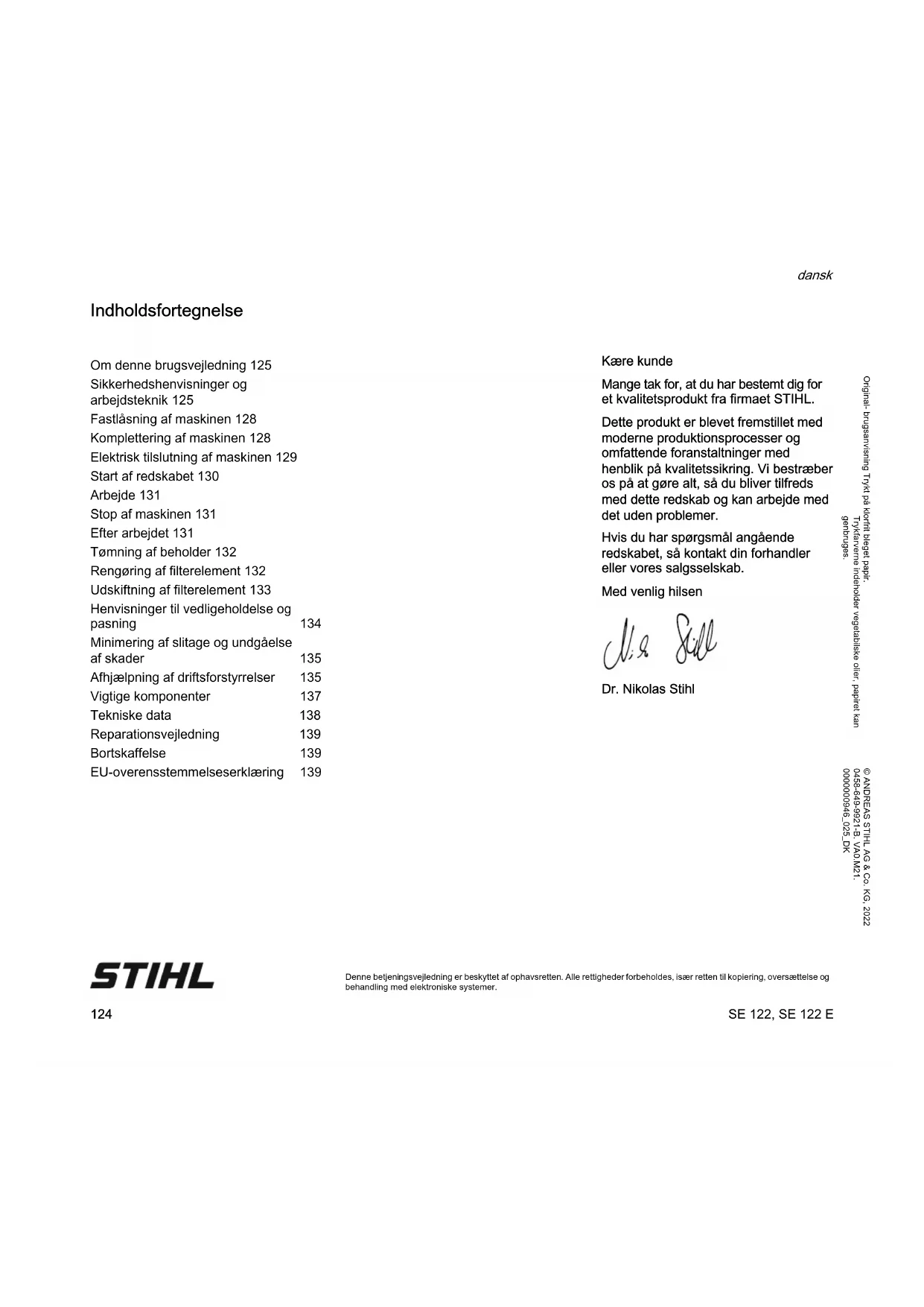 Denne betjeningsvejledning er beskyttet af ophavsretten. Alle rettigheder forbeholdes, især retten til kopiering, oversættelse og behandling med elektroniske systemer. Indholdsfortegnelse Kære kunde Mange tak for, at du har bestemt dig for et kvalitetsprodukt fra firmaet STIHL. Dette produkt er blevet fremstillet med moderne produktionsprocesser og omfattende foranstaltninger med henblik på kvalitetssikring. Vi bestræber os på at gøre alt, så du bliver tilfreds med dette redskab og kan arbejde med det uden problemer. Hvis du har spørgsmål angående redskabet, så kontakt din forhandler eller vores salgsselskab. Med venlig hilsen Dr. Nikolas Stihl Om denne brugsvejledning 125 Sikkerhedshenvisninger og arbejdsteknik 125 Fastlåsning af maskinen 128 Komplettering af maskinen 128 Elektrisk tilslutning af maskinen 129 Start af redskabet 130 Arbejde 131 Stop af maskinen 131 Efter arbejdet 131 Tømning af beholder 132 Rengøring af filterelement 132 Udskiftning af filterelement 133 Henvisninger til vedligeholdelse og pasning 134 Minimering af slitage og undgåelse af skader 135 Afhjælpning af driftsforstyrrelser 135 Vigtige komponenter 137 Tekniske data 138 Reparationsvejledning 139 Bortskaffelse 139 EU-overensstemmelseserklæring 139SE 122, SE 122 E dansk
