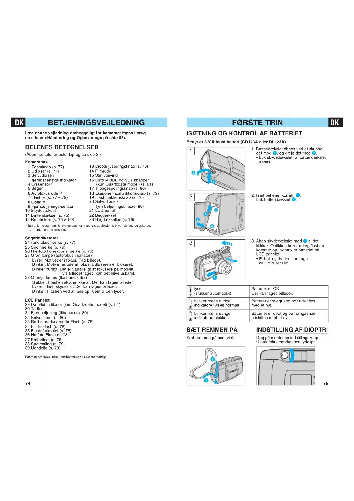 Bør altid holdes rent. Snavs og støv kan medføre at billederne bliver slørede og uskarpe. Tør af med en ren blød klud. Søgerindikatorer 24 Autofokusmærke (s. 77) 25 Spotmærke (s. 79) 26 Nærfoto korrektionsmærke (s. 76) 27 Grøn lampe (autofokus indikator) Lyser: Motivet er i fokus. Tag billedet. Blinker: Motivet er ude af fokus. Udløseren er blokeret. Blinker hurtigt: Det er vanskeligt at fokusere på motivet. Hvis billedet tages, kan det blive uskarpt. 28 Orange lampe (flash-indikator) Slukker: Flashen skyder ikke af. Der kan tages billeder. Lyser: Flash skyder af. Der kan tages billeder. Blinker: Flashen ved at lade op. Vent til den lyser. LCD Panelet 29 Dato/tid indikator (kun Quartzdate model) (s. 81) 30 Tæller 31 Fjernbetjening (tilbehør) (s. 80) 32 Selvudløser (s. 80) 33 Rød-øjereducerende Flash (s. 78) 34 Fill-In Flash (s. 78) 35 Flash-frakoblet (s. 78) 36 Natfoto Flash (s. 78) 37 Batteritest (s. 75) 38 Spotmåling (s. 79) 39 Uendelig (s. 79) Bemærk: Ikke alle indikatorer vises samtidig. 13 Dioptri justeringsknap (s. 75) 14 Filmrude 15 Stativgevind 16 Dato MODE og SET knapper (kun Quartzdate model) (s. 81) 17 Tilbagespolingsknap (s. 80) 18 Eksponeringsfunktionsknap (s. 79) 19 Flashfunktionsknap (s. 78) 20 Selvudløser/ fjernbetjeningsknap(s. 80) 21 LCD panel 22 Bagdæksel 23 Bagdæksellås (s. 76)TAG BILLEDER STANDARD FUNKTIONER