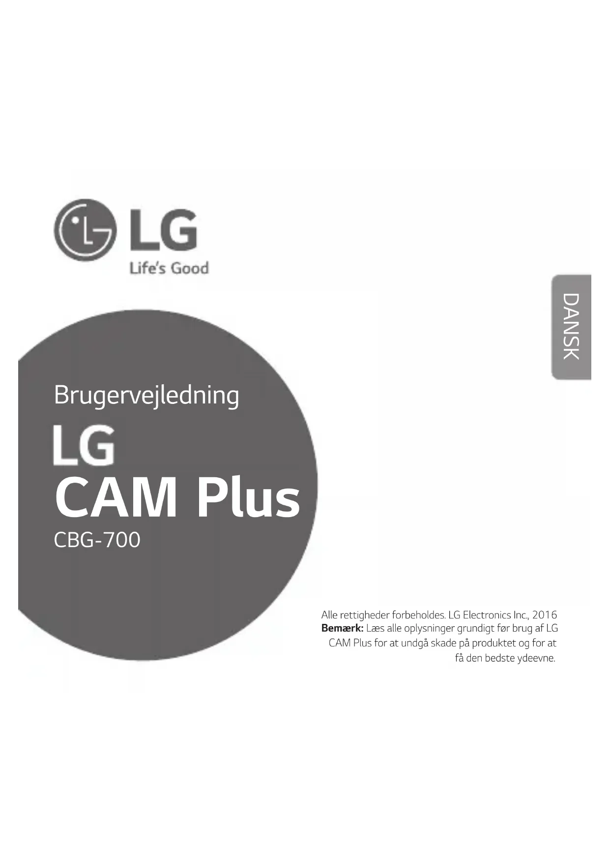 - Serieoptagelse Du kan tage kontinuerlige optagelser for at skabe bevægelige billeder. Tryk på på skærmen for automatisk tilstand, og hold den nede, eller tryk på udløsertasten på LG CAM Plus. Kontinuerlige optagelser er taget i høj hastighed, mens eller udløsertasten holdes nede.13 USB-type USB 2.0 (Type-C) Batteri Li-ion 1.200 mAh Opladningstid Mindre end 200 minutter Spænding 5 V ±10 %, 9 V ±10 % Strømforbrug 25 mA (ingen opladning), 1 mA (strøm slukket) Opladningsforbrug 500 mA Outputforbrug 500 mA Lyd Højttaler & digital mikrofon Lydtryk 1 m lydtryk 60 dB ↑ (100 %) *baseret på fuld opladning Antenne GSM/CDMA, WCDMA, LTE LED Batteriindikator Driftstemperatur -20°C ~ 40°C Mål/vægt 73,9 mm (B) X 61,4 mm (L) X 15,9 mm (H) / 55,4 g Specikationerogfunktioner14 Bortskaffelse af dit gamle apparat 1 Dette symbol med en affaldsspand med kryds over angiver at elektrisk og elektronisk affald (WEEE) skal bortskaffes og genbruges korrekt, adskilt fra kommunens husholdningsaffald. 2 Gamle elektriske produkter kan indeholde farlige stoffer, så når du bortskaffer dit gamle apparat på korrekt vis, hjælper du med at forhindre mulige negative konsekvenser for miljø og mennesker. Dit gamle apparat kan indeholde dele som kan genbruges, fx til at reparere andre produkter, eller værdifulde materialer som kan genbruges og derved begrænse spild af værdifulde ressourcer. 3 Du kan enten tage apparatet til den butik hvor du købte det, eller kontakte dit lokale affaldskontor angående oplysninger om det nærmeste, autoriserede WEEE-samlepunkt. Find de sidste nye oplysninger for dit land på www.lg.com/ global/recycling Yderligere oplysninger15 Kassering af batterier/akkumulatorer 1 Dette symbol kan være ledsaget af kemiske symboler for kviksølv (Hg), cadmium (Cd) eller bly (Pb), hvis batteriet indeholder mere end 0,0005 % kviksølv, 0,002 % cadmium eller 0,004 % bly. 2 Alle batterier/akkumulatorer skal bortskaffes separat fra husholdningsaffald via bestemte indsamlingsfaciliteter, der er godkendt af regeringen eller de lokale myndigheder. 3 Korrekt bortskaffelse af dine gamle batterier/akkumulatorer er med til at forhindre mulige negative konsekvenser for miljøet og menneskers helbred. 4 Hvis du vil have yderligere oplysninger om bortskaffelse af dine gamle batterier/ akkumulatorer, skal du kontakte kommunen, renovationsselskabet eller den butik, hvor du købte produktet.16 I HENHOLD TIL BETINGELSERNE I DENNE BEGRÆNSEDE GARANTI GARANTERER LG ELECTRONICS, AT DETTE PRODUKT ER FRIT FOR FEJL OG MANGLER I DESIGN, MATERIALE OG UDFØRELSE PÅ DET OPRINDELIGE KØBSTIDSPUNKT OG I EN PERIODE PÅ TO (2) ÅR DEREFTER. I TILFÆLDE AF, AT DIT PRODUKT FÅR BRUG FOR SERVICE, DER ER UNDERLAGT GARANTIEN, SKAL DU RETURNERE DET TIL FORHANDLEREN ELLER KONTAKTE DIT LOKALE LG ELECTRONICS-CENTER FOR AT FÅ YDERLIGERE OPLYSNINGER. I overensstemmelse med de regionale tjenestepolitikker, tilbyder Spanien, Sverige, Tjekkiet, Polen, Grækenland, Portugal, Rumænien, Danmark, Slovakiet, Tyrkiet, Montenegro, Norge, Finland, Island, Serbien og Bulgarien nu 2 års garanti. Begrænset garantiTous droits réservés. LG Electronics Inc., 2016 Remarque : Lisez attentivement ces informations avant d'utiliser le LG CAM Plus an d'optimiser l'utilisation du produit et d'éviter de l'endommager. FRANÇAIS Guide de l'utilisateur CAM Plus CBG-7002 Le CAM Plus est une poignée d’appareil photo et couplée à une batterie supplémentaire qui peut être connectée au bas de votre G5.