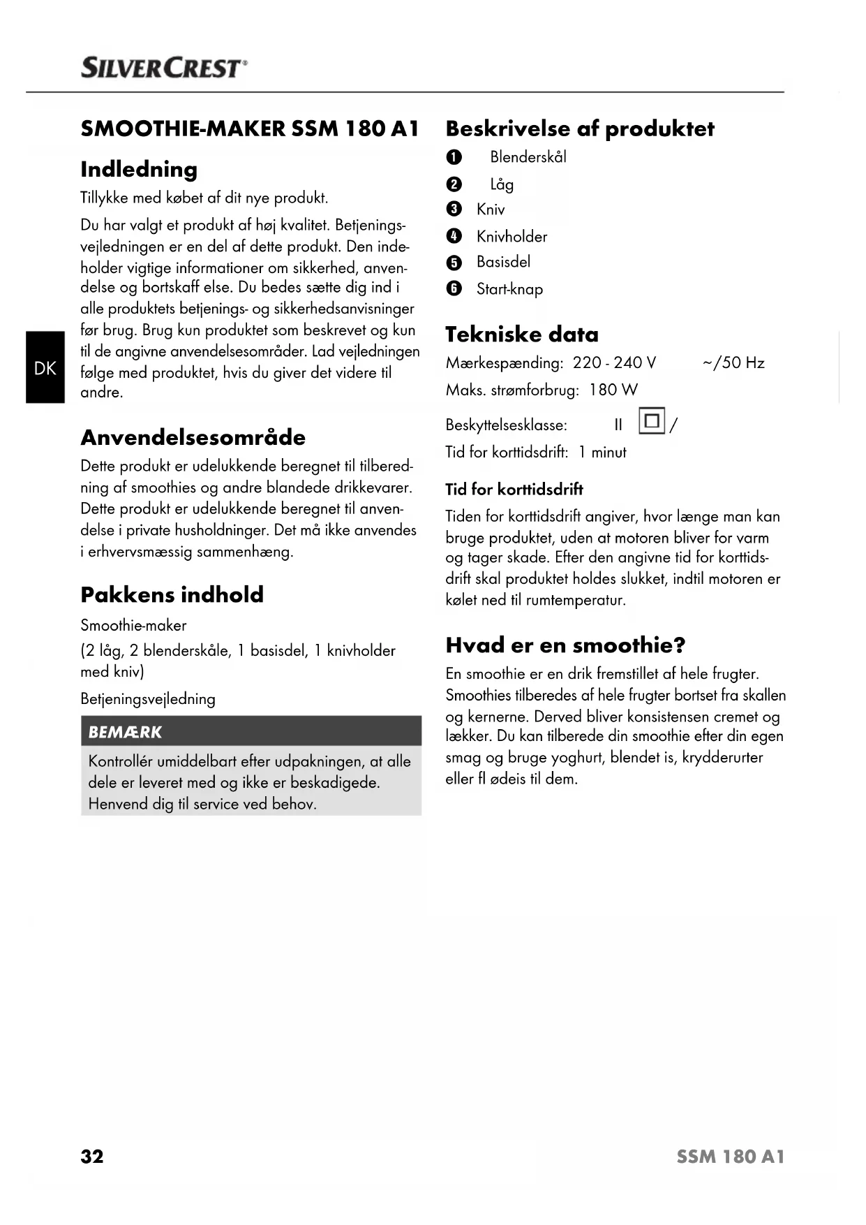 /50 Hz Maks. strømforbrug: 180 W Beskyttelsesklasse: II / Tid for korttidsdrift: 1 minut Tid for korttidsdrift Tiden for korttidsdrift angiver, hvor længe man kan bruge produktet, uden at motoren bliver for varm og tager skade. Efter den angivne tid for korttids- drift skal produktet holdes slukket, indtil motoren er kølet ned til rumtemperatur. Hvad er en smoothie? En smoothie er en drik fremstillet af hele frugter. Smoothies tilberedes af hele frugter bortset fra skallen og kernerne. Derved bliver konsistensen cremet og lækker. Du kan tilberede din smoothie efter din egen smag og bruge yoghurt, blendet is, krydderurter eller fl ødeis til dem.33 SSM 180 A1