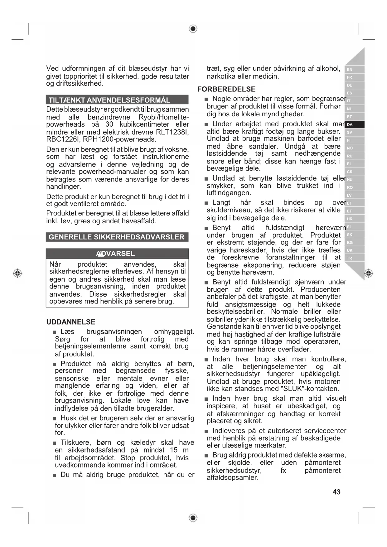 Dette blæseudstyr er godkendt til brug sammen med alle benzindrevne Ryobi/Homelite- powerheads på 30 kubikcentimeter eller mindre eller med elektrisk drevne RLT1238I, RBC1226I, RPH1200-powerheads. Den er kun beregnet til at blive brugt af voksne, som har læst og forstået instruktionerne og advarslerne i denne vejledning og de relevante powerhead-manualer og som kan betragtes som værende ansvarlige for deres handlinger. Dette produkt er kun beregnet til brug i det fri i et godt ventileret område. Produktet er beregnet til at blæse lettere affald inkl. løv, græs og andet haveaffald. GENERELLE SIKKERHEDSADVARSLER ADVARSEL Når produktet anvendes, skal sikkerhedsreglerne efterleves. Af hensyn til egen og andres sikkerhed skal man læse denne brugsanvisning, inden produktet anvendes. Disse sikkerhedsregler skal opbevares med henblik på senere brug. UDDANNELSE ■ Læs brugsanvisningen omhyggeligt. Sørg for at blive fortrolig med betjeningselementerne samt korrekt brug af produktet. ■ Produktet må aldrig benyttes af børn, personer med begrænsede fysiske, sensoriske eller mentale evner eller manglende erfaring og viden, eller af folk, der ikke er fortrolige med denne brugsanvisning. Lokale love kan have indflydelse på den tilladte brugeralder. ■ Husk det er brugeren selv der er ansvarlig for ulykker eller farer andre folk bliver udsat for. ■ Tilskuere, børn og kæledyr skal have en sikkerhedsafstand på mindst 15 m til arbejdsområdet. Stop produktet, hvis uvedkommende kommer ind i området. ■ Du må aldrig bruge produktet, når du er træt, syg eller under påvirkning af alkohol, narkotika eller medicin. FORBEREDELSE ■ Nogle områder har regler, som begrænser brugen af produktet til visse formål. Forhør dig hos de lokale myndigheder. ■ Under arbejdet med produktet skal man altid bære kraftigt fodtøj og lange bukser. Undlad at bruge maskinen barfodet eller med åbne sandaler. Undgå at bære løstsiddende tøj samt nedhængende snore eller bånd; disse kan hænge fast i bevægelige dele. ■ Undlad at benytte løstsiddende tøj eller smykker, som kan blive trukket ind i luftindgangen. ■ Langt hår skal bindes op over skulderniveau, så det ikke risikerer at vikle sig ind i bevægelige dele. ■ Benyt altid fuldstændigt høreværn under brugen af produktet. Produktet er ekstremt støjende, og der er fare for varige høreskader, hvis der ikke træffes de foreskrevne foranstaltninger til at begrænse eksponering, reducere støjen og benytte høreværn. ■ Benyt altid fuldstændigt øjenværn under brugen af dette produkt. Producenten anbefaler på det kraftigste, at man benytter fuld ansigtsmæssige og helt lukkede beskyttelsesbriller. Normale briller eller solbriller yder ikke tilstrækkelig beskyttelse. Genstande kan til enhver tid blive opslynget med høj hastighed af den kraftige luftstråle og kan springe tilbage mod operatøren, hvis de rammer hårde overflader. ■ Inden hver brug skal man kontrollere, at alle betjeningselementer og alt sikkerhedsudstyr fungerer upåklageligt. Undlad at bruge produktet, hvis motoren ikke kan standses med "SLUK"-kontakten. ■ Inden hver brug skal man altid visuelt inspicere, at huset er ubeskadiget, og at afskærmninger og håndtag er korrekt placeret og sikret. ■ Indleveres på et autoriseret servicecenter med henblik på erstatning af beskadigede eller ulæselige mærkater. ■ Brug aldrig produktet med defekte skærme, eller skjolde, eller uden påmonteret sikkerhedsudstyr, fx påmonteret affaldsopsamler.44 | Dansk